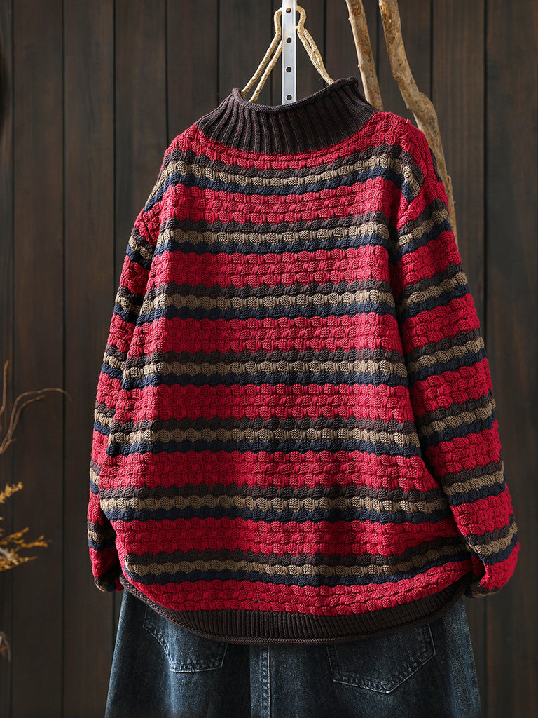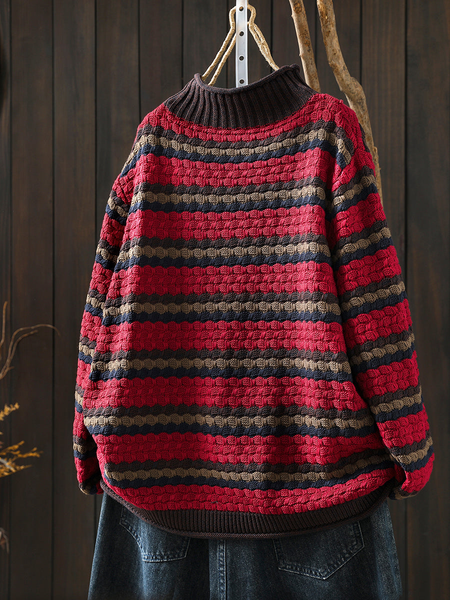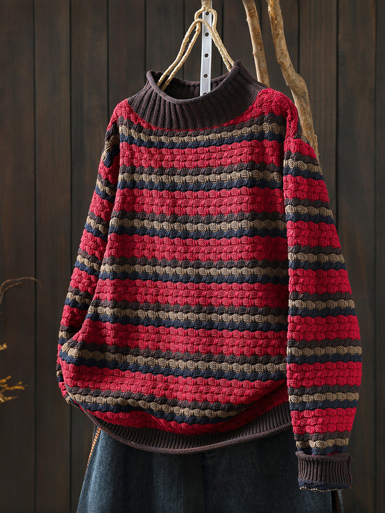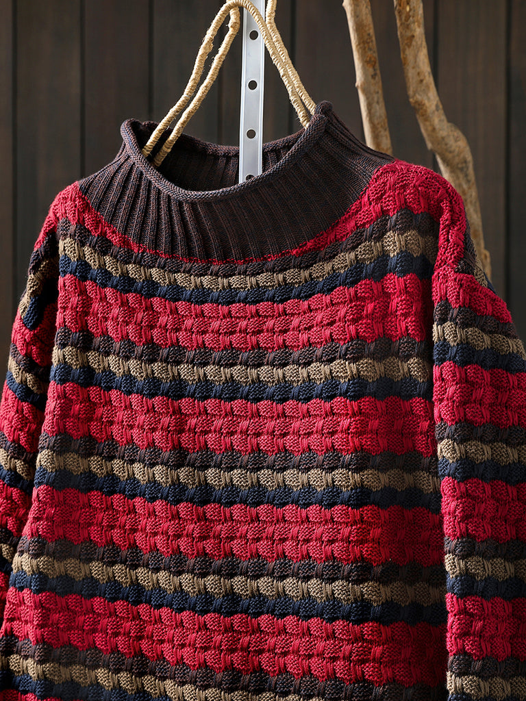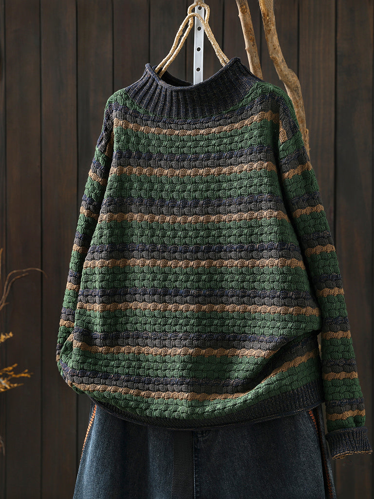 Suéter de cuello alto medio con rayas y bloques de color artístico de otoño para mujer