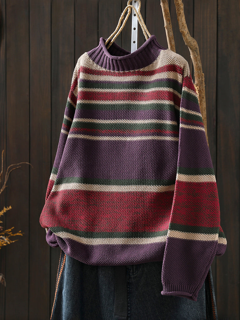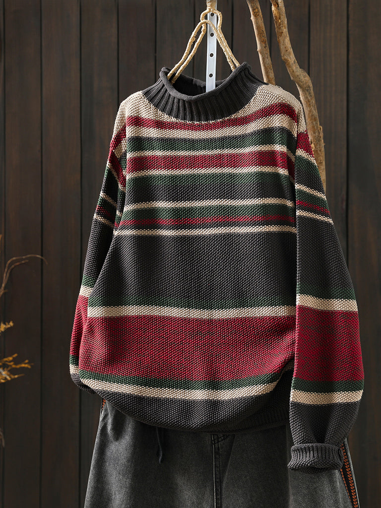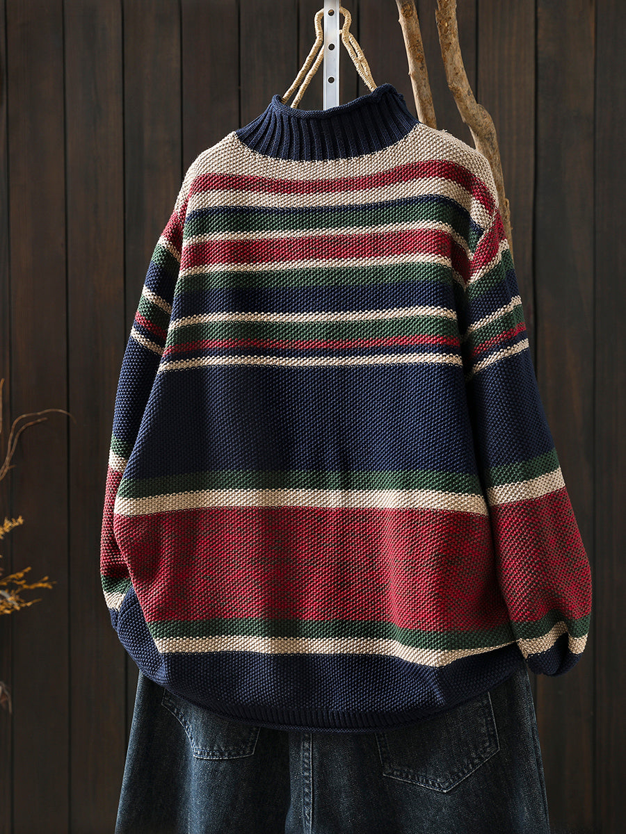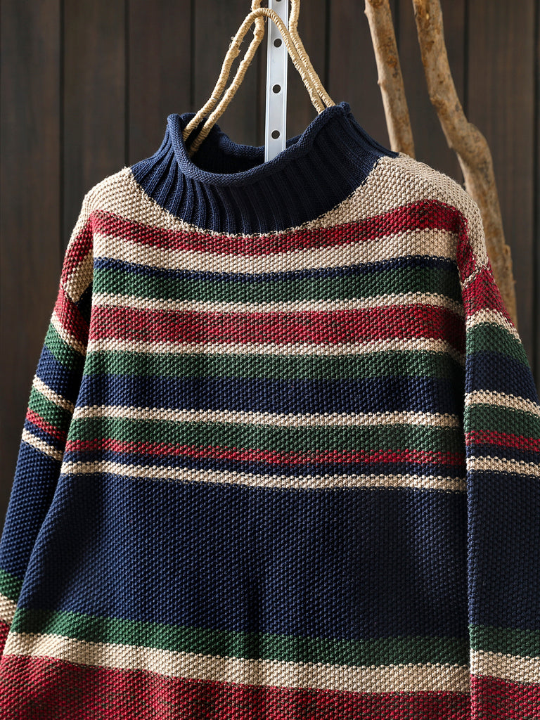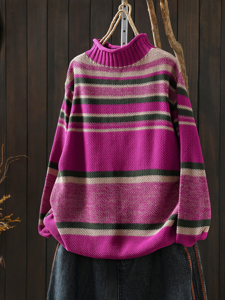 Suéter de cuello alto medio con rayas y bloques de color artístico de otoño para mujer