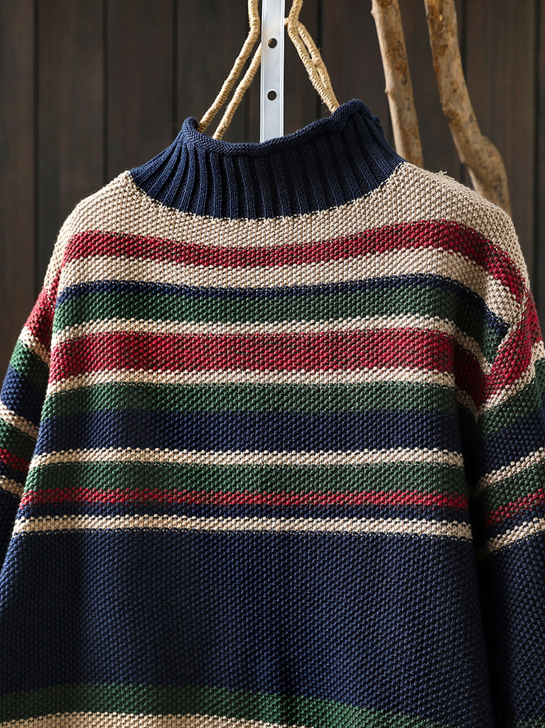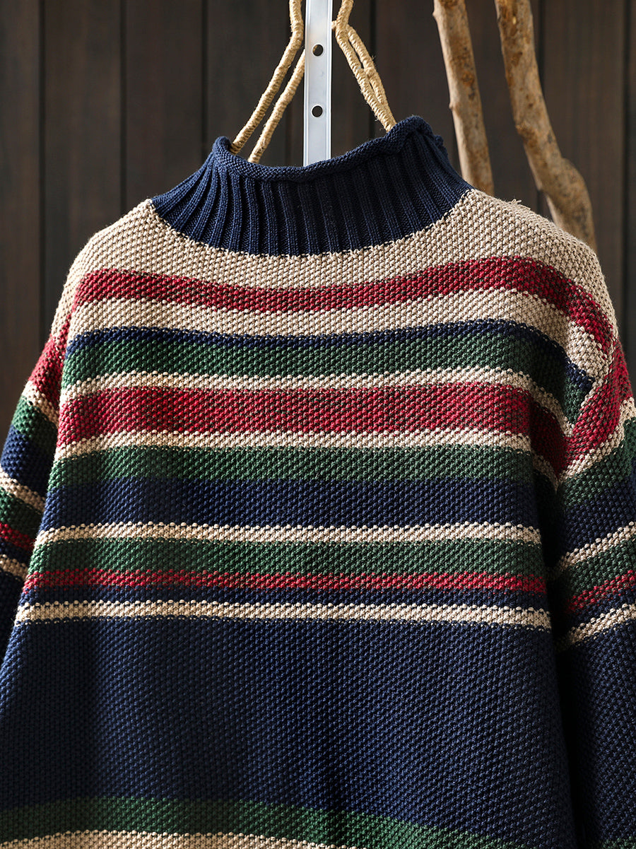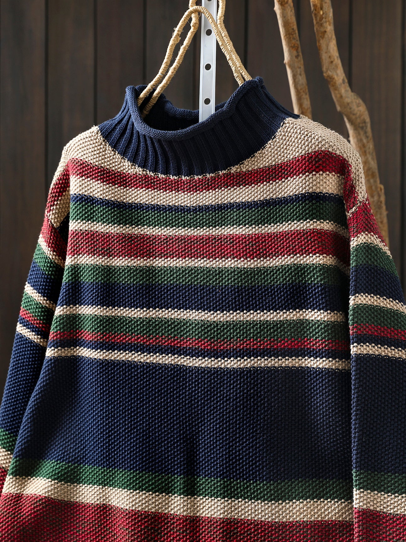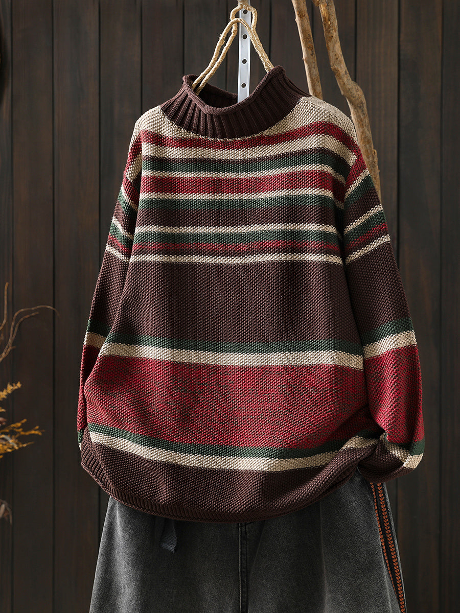 Suéter de cuello alto medio con rayas y bloques de color artístico de otoño para mujer