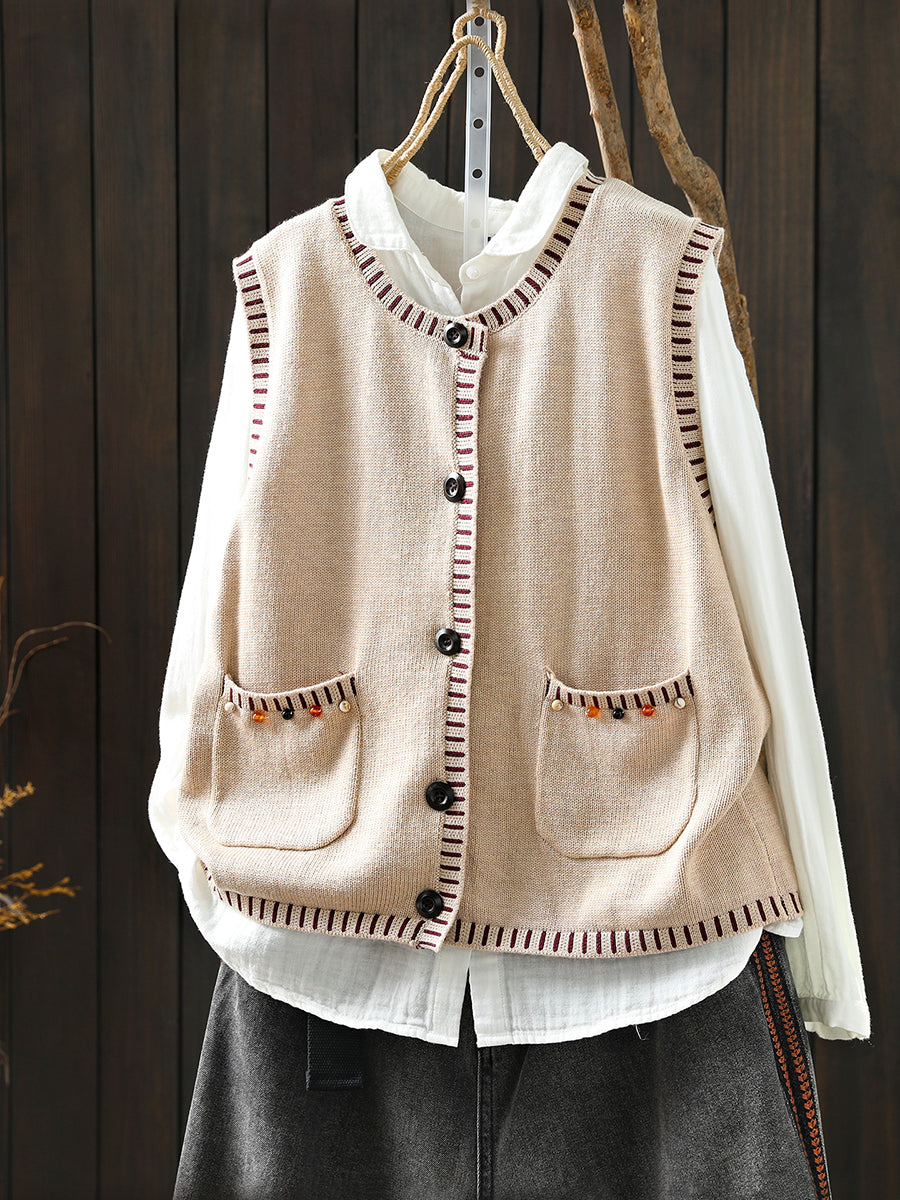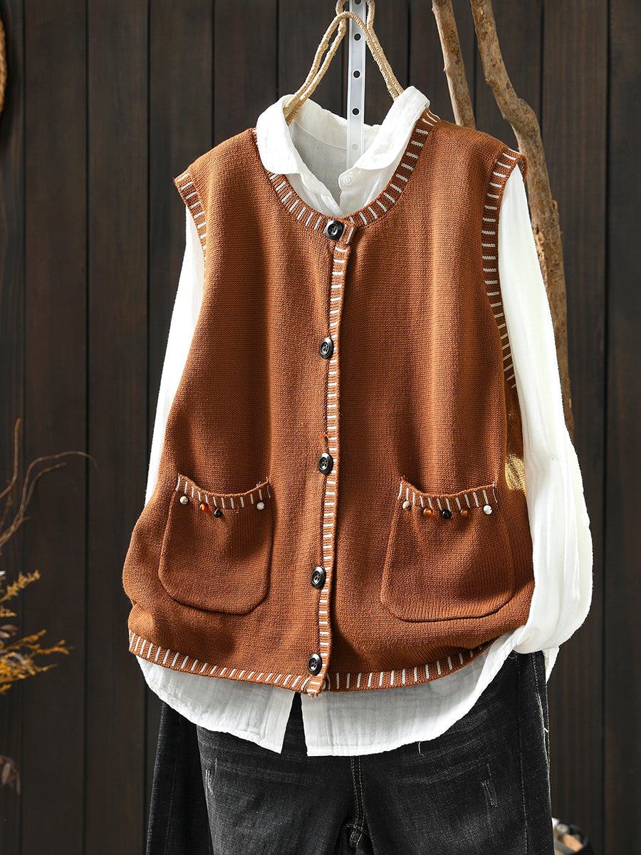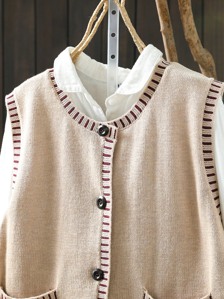 Chaleco de punto con cuello redondo artístico de otoño para mujer
