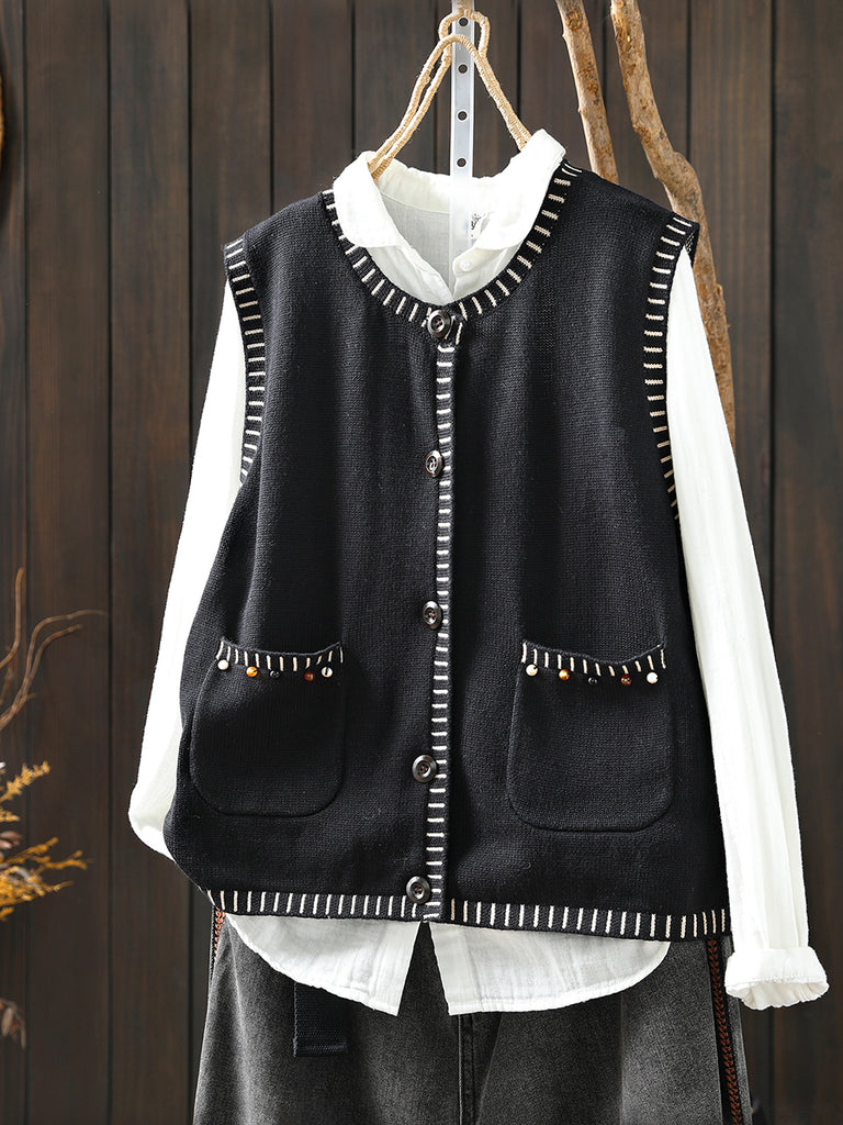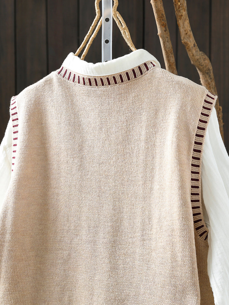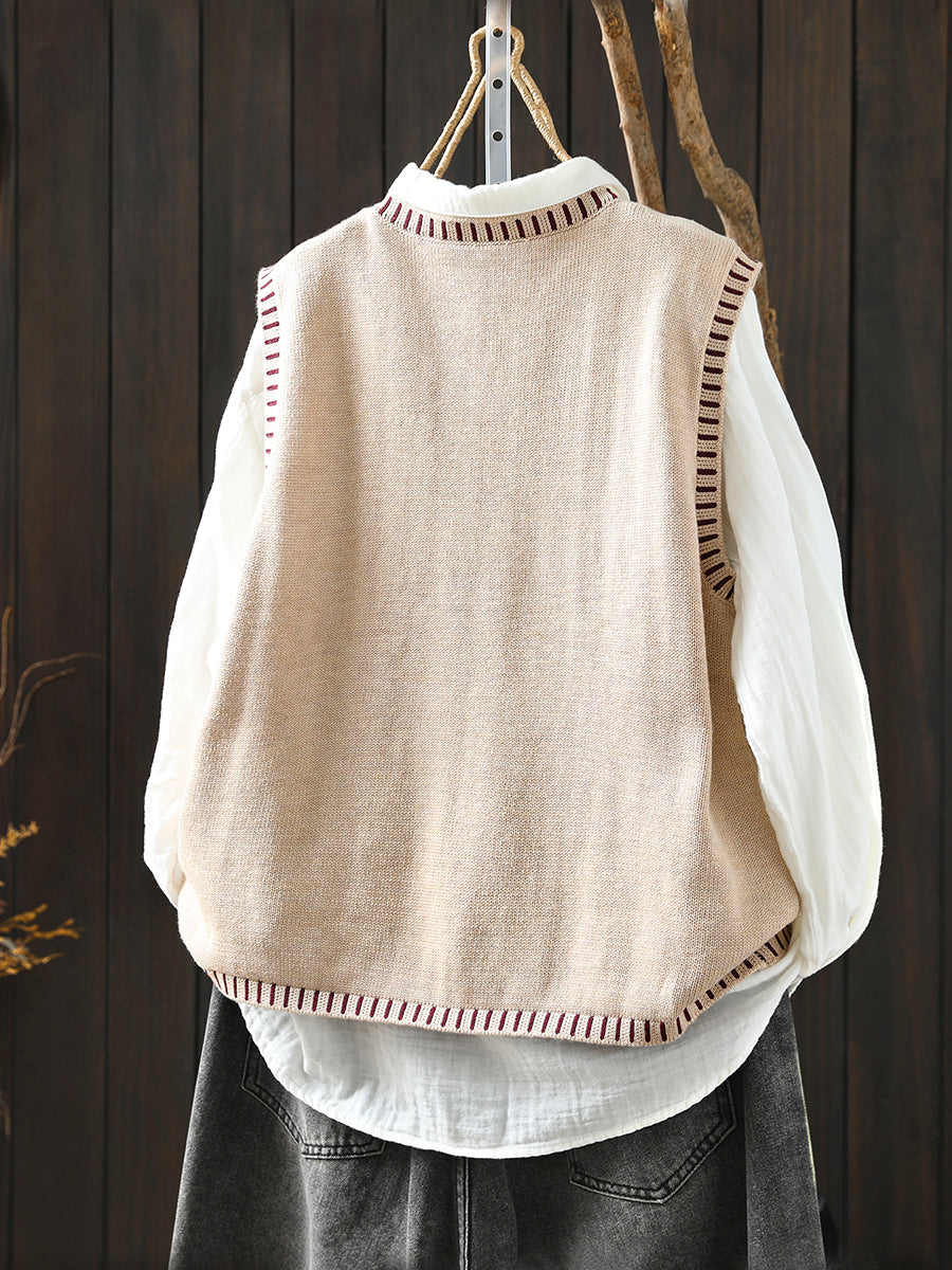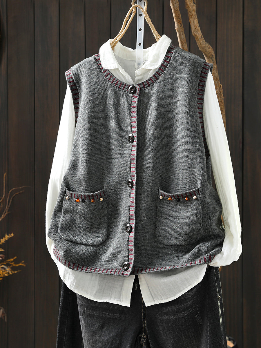 Chaleco de punto con cuello redondo artístico de otoño para mujer