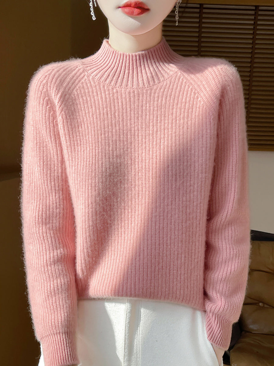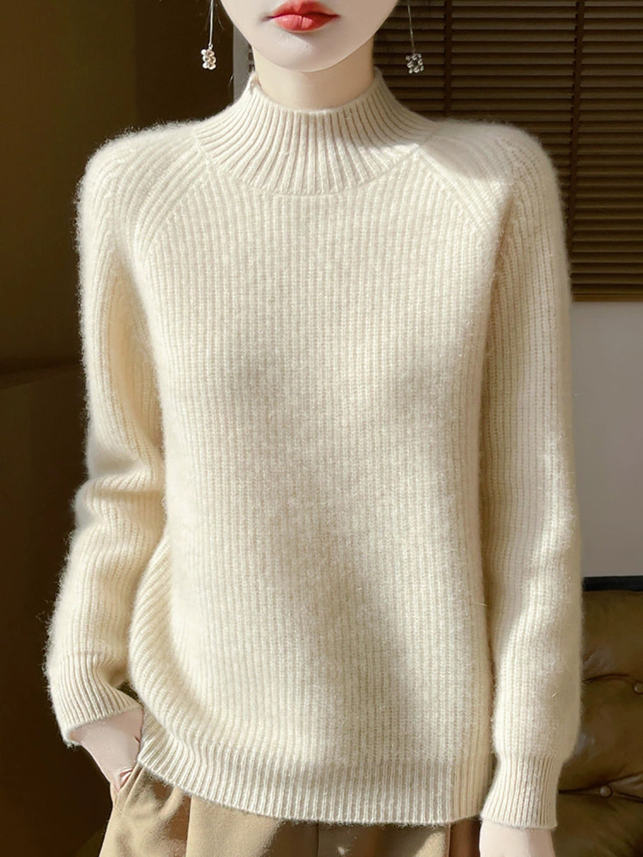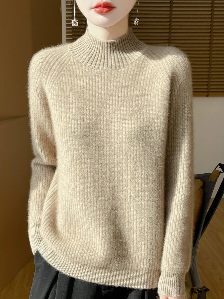 Suéter de cuello alto medio de lana de color puro y estilo artístico de otoño para mujer