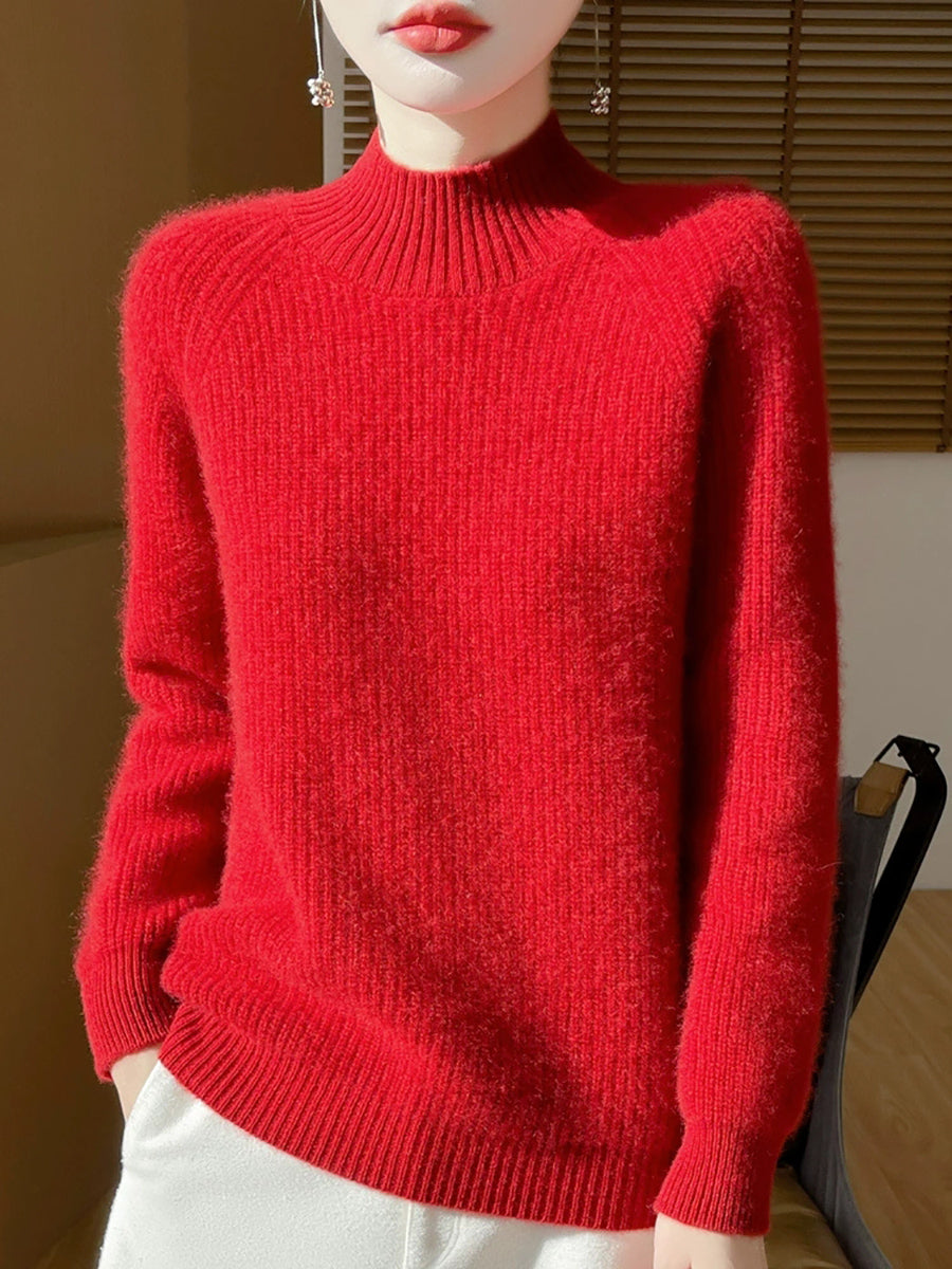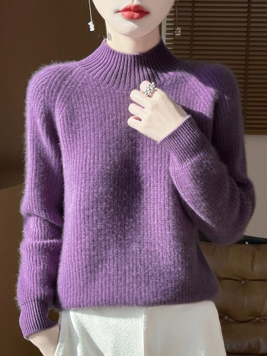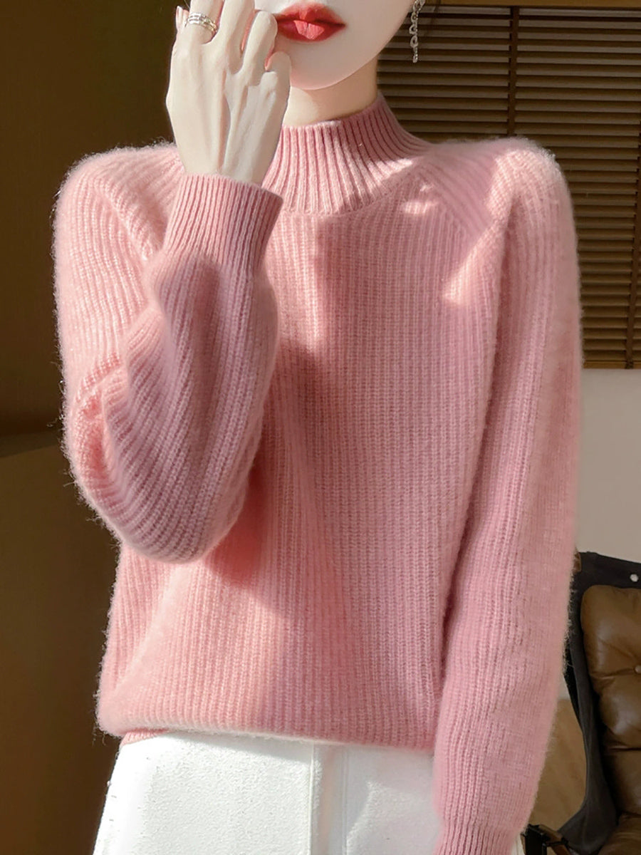 Suéter de cuello alto medio de lana de color puro y estilo artístico de otoño para mujer