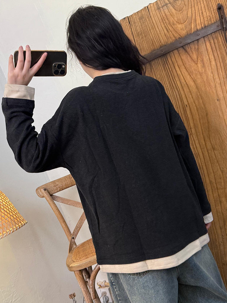 Camisa informal de otoño con cuello redondo y bloques de color para mujer