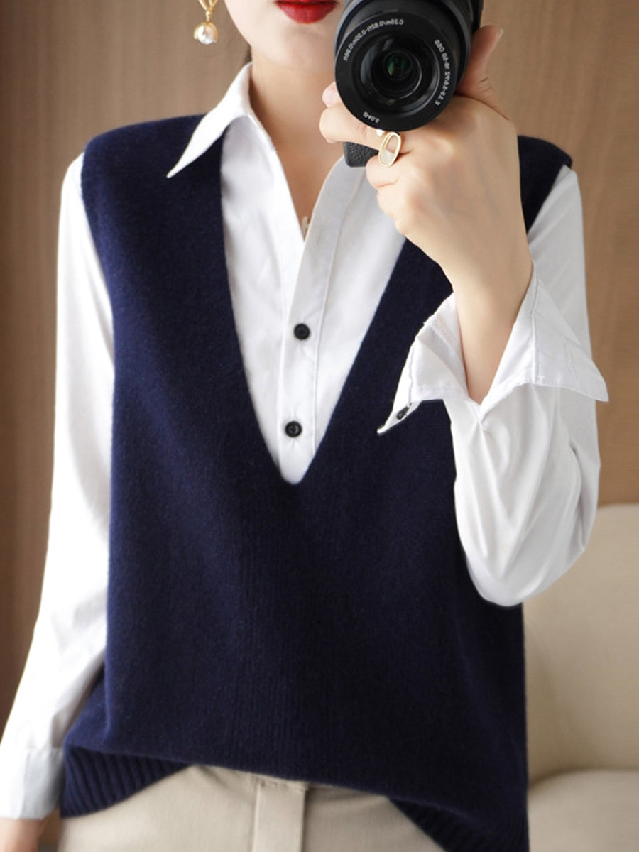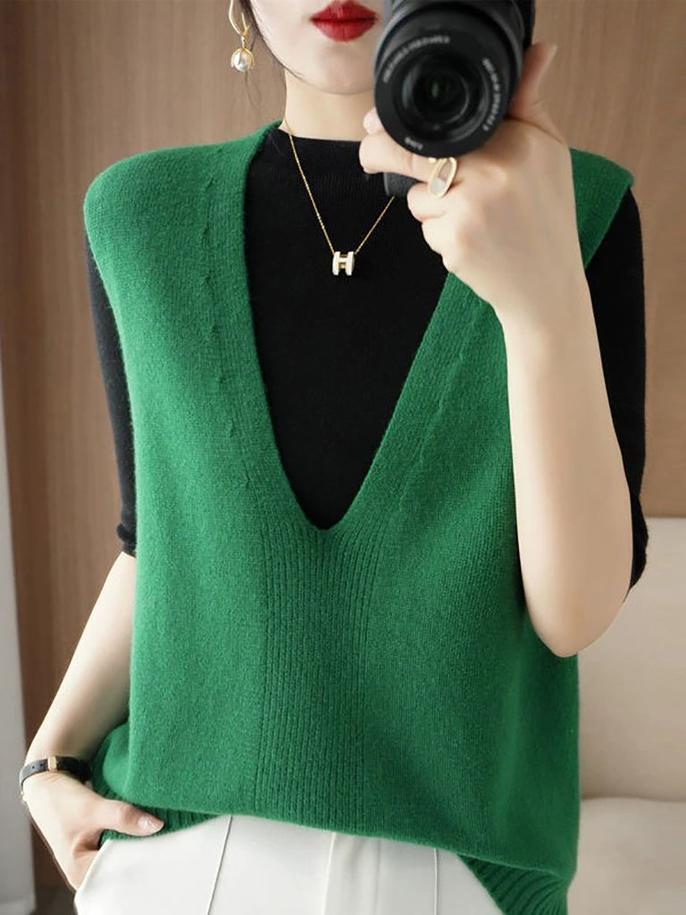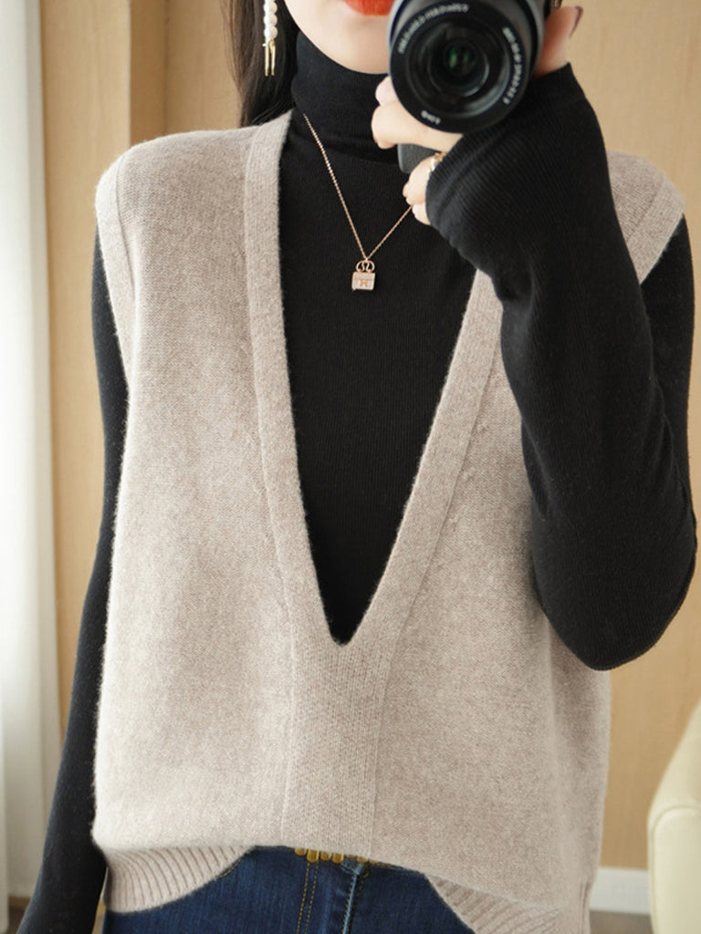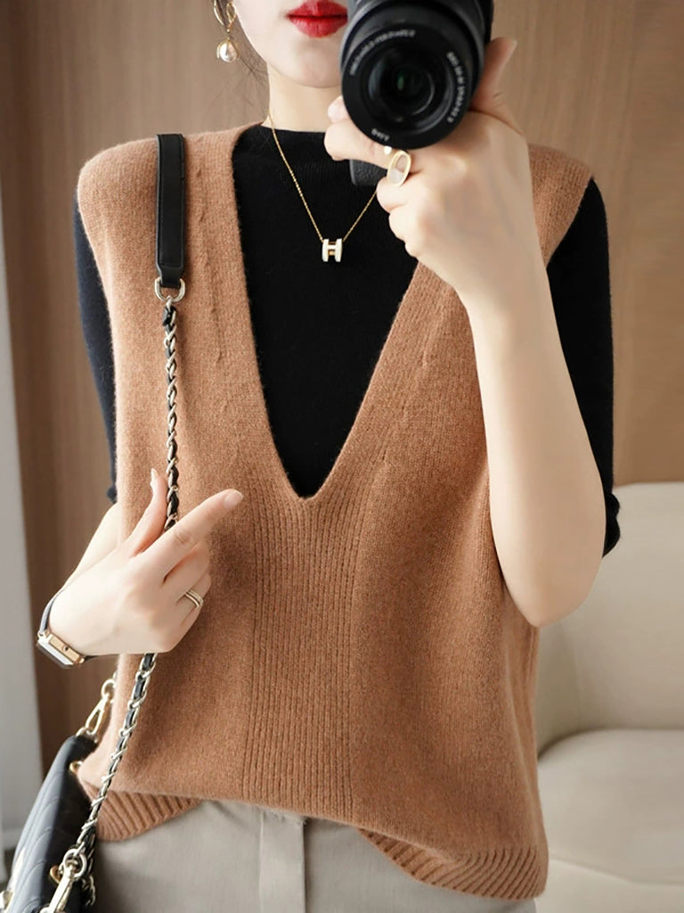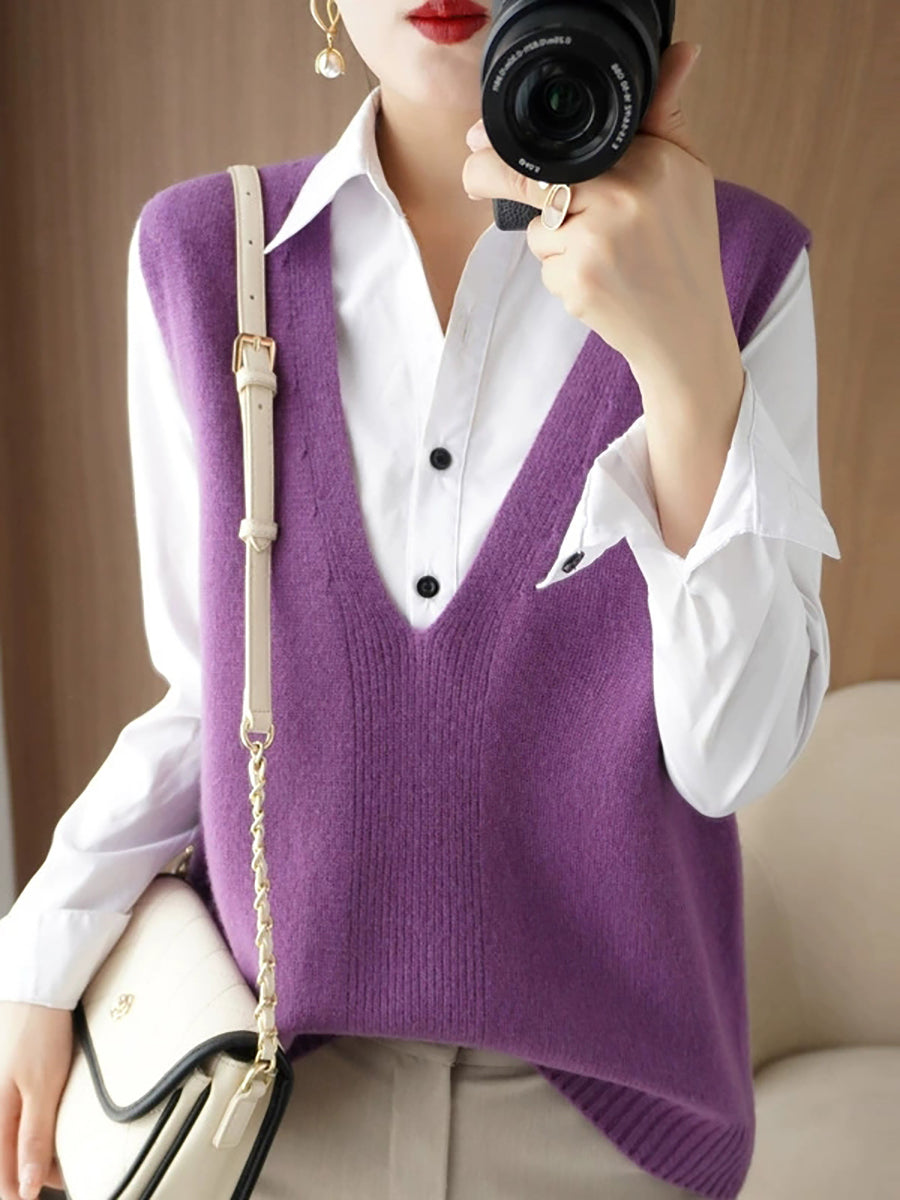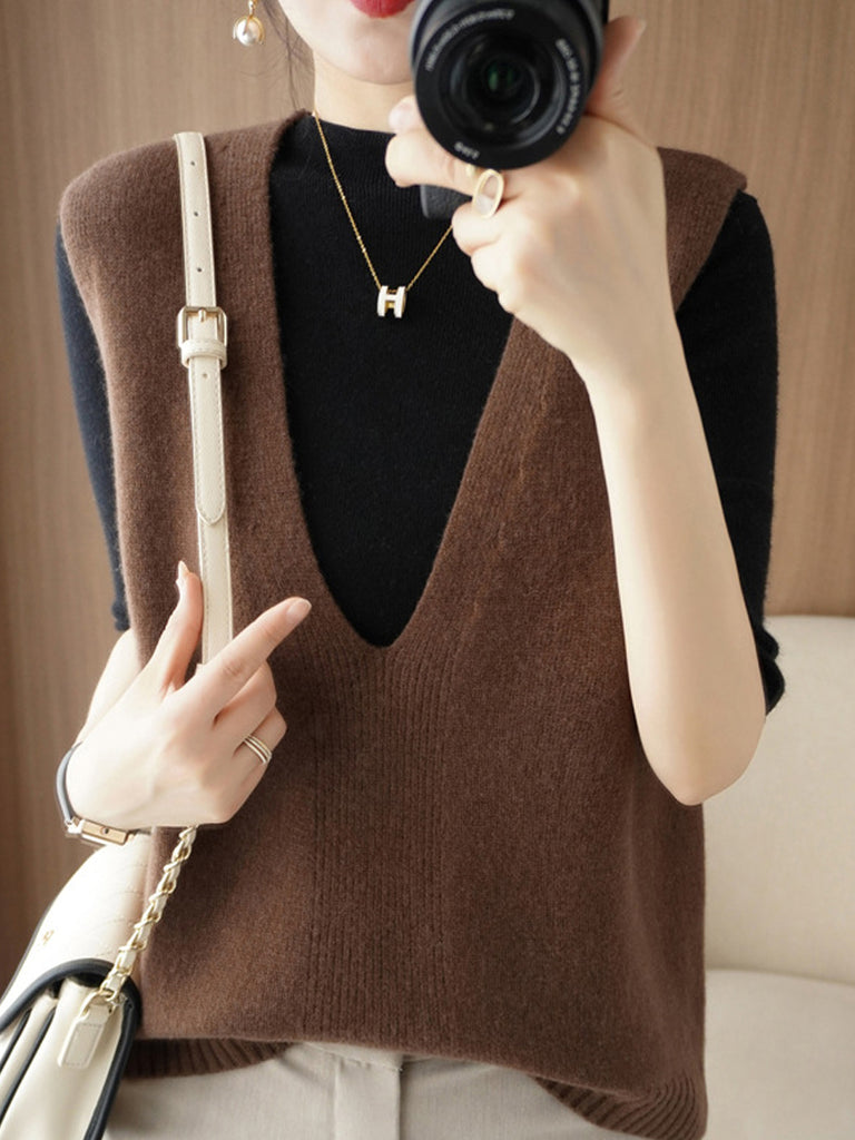 Chaleco de punto con cuello en V de color puro informal de otoño para mujer
