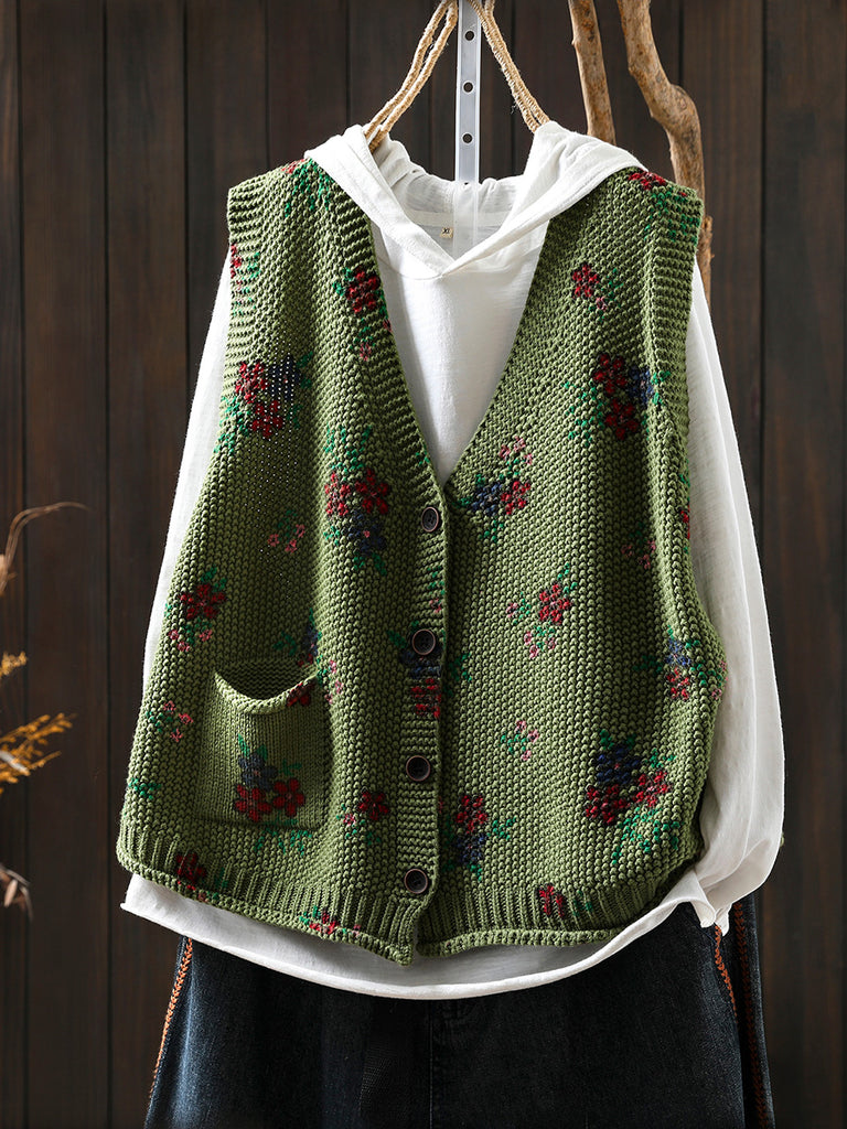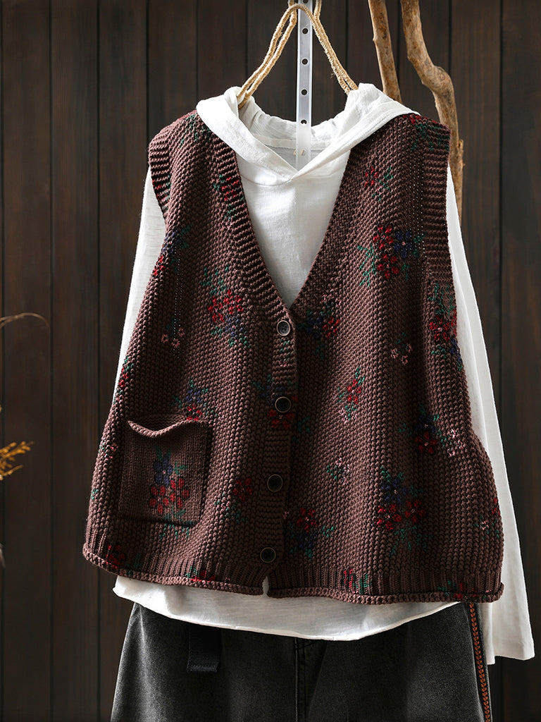 Chaleco de punto con cuello en V y estampado floral retro de otoño para mujer