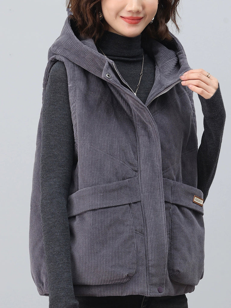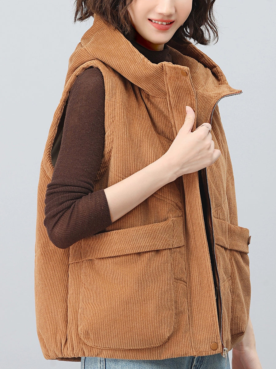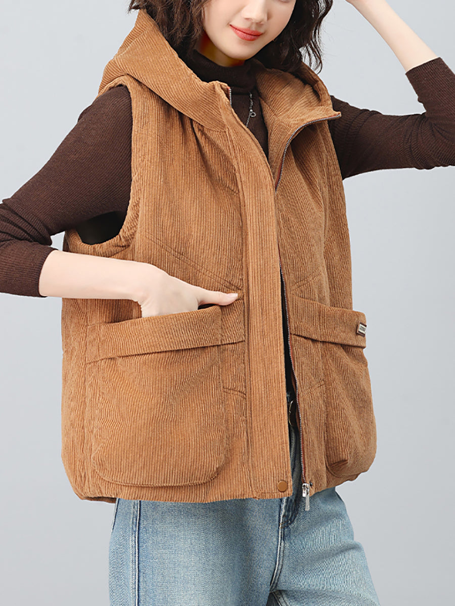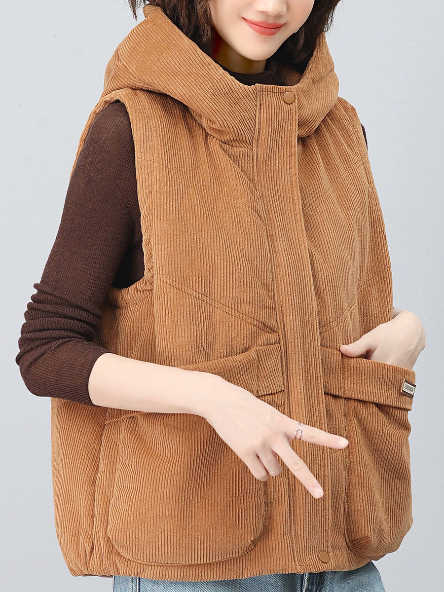 Chaleco de pana con capucha de color puro retro de otoño para mujer