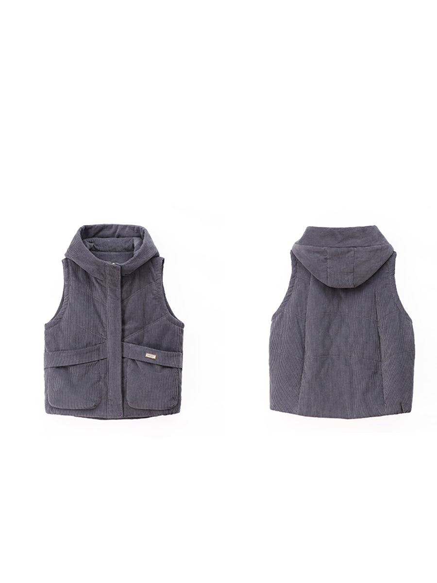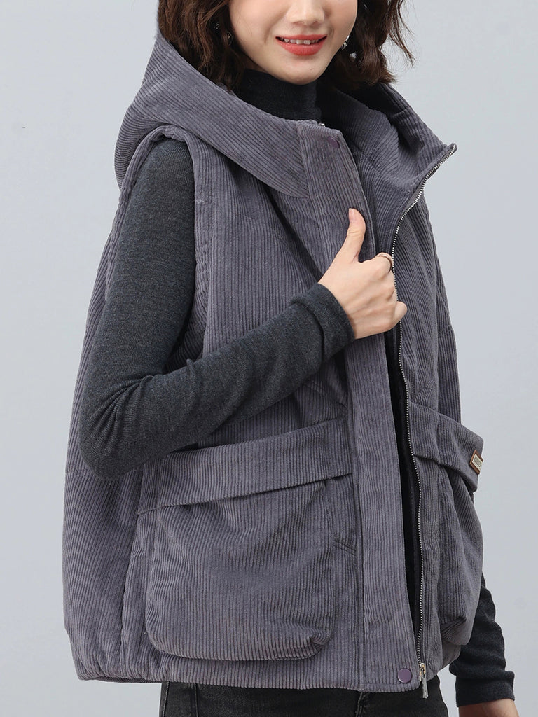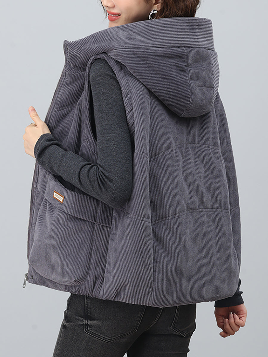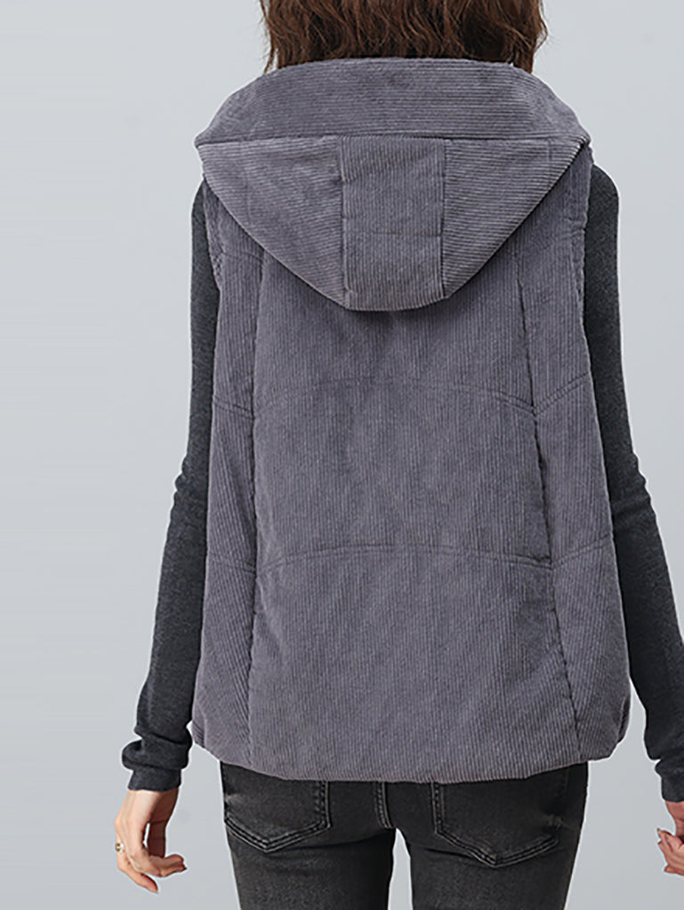 Chaleco de pana con capucha de color puro retro de otoño para mujer
