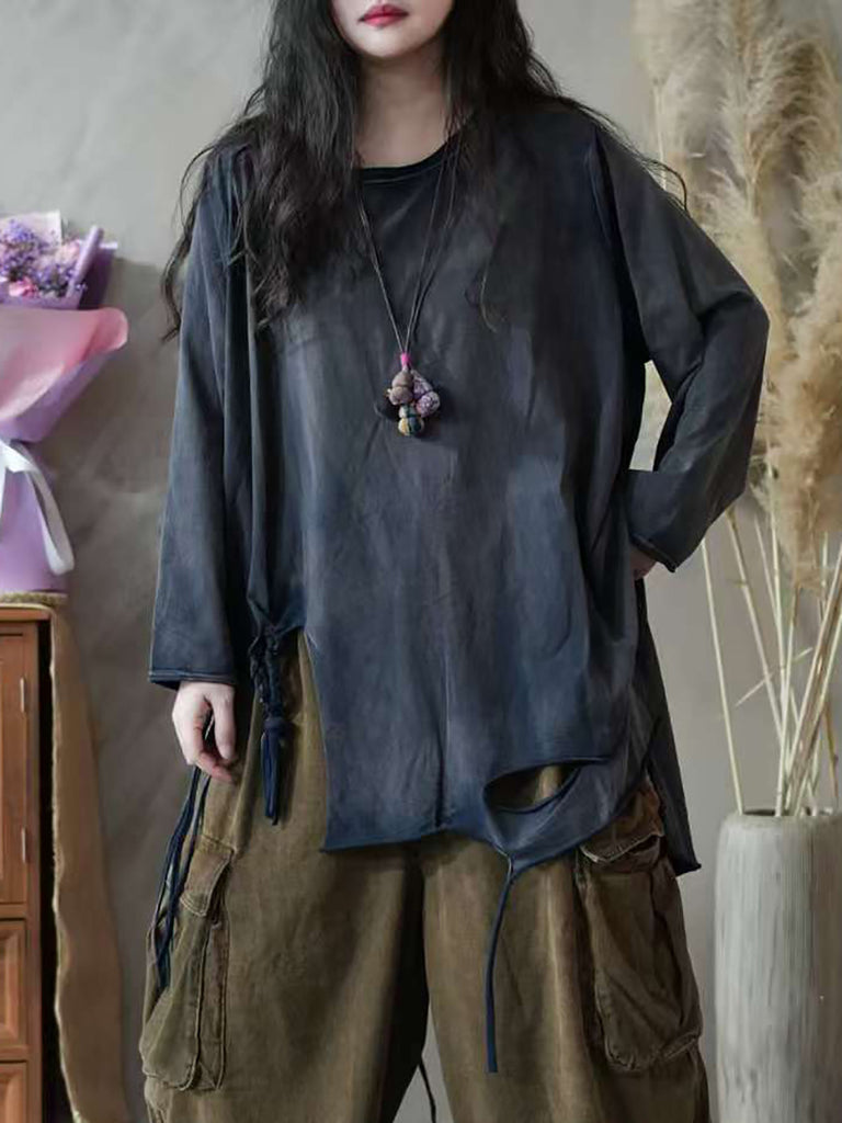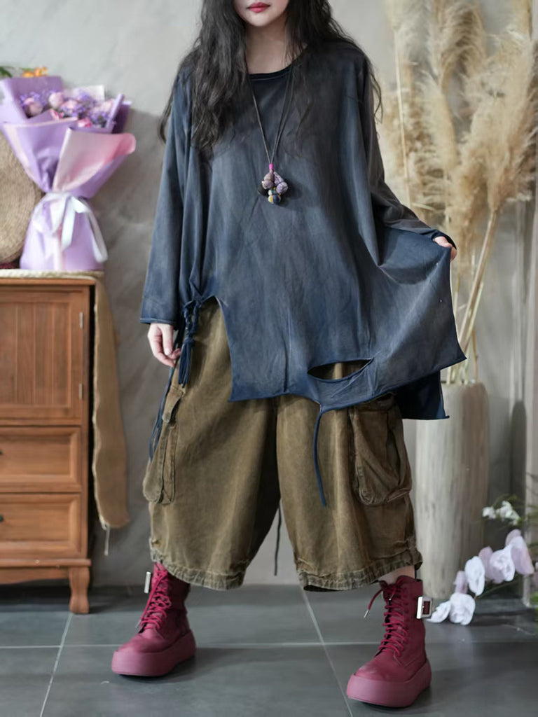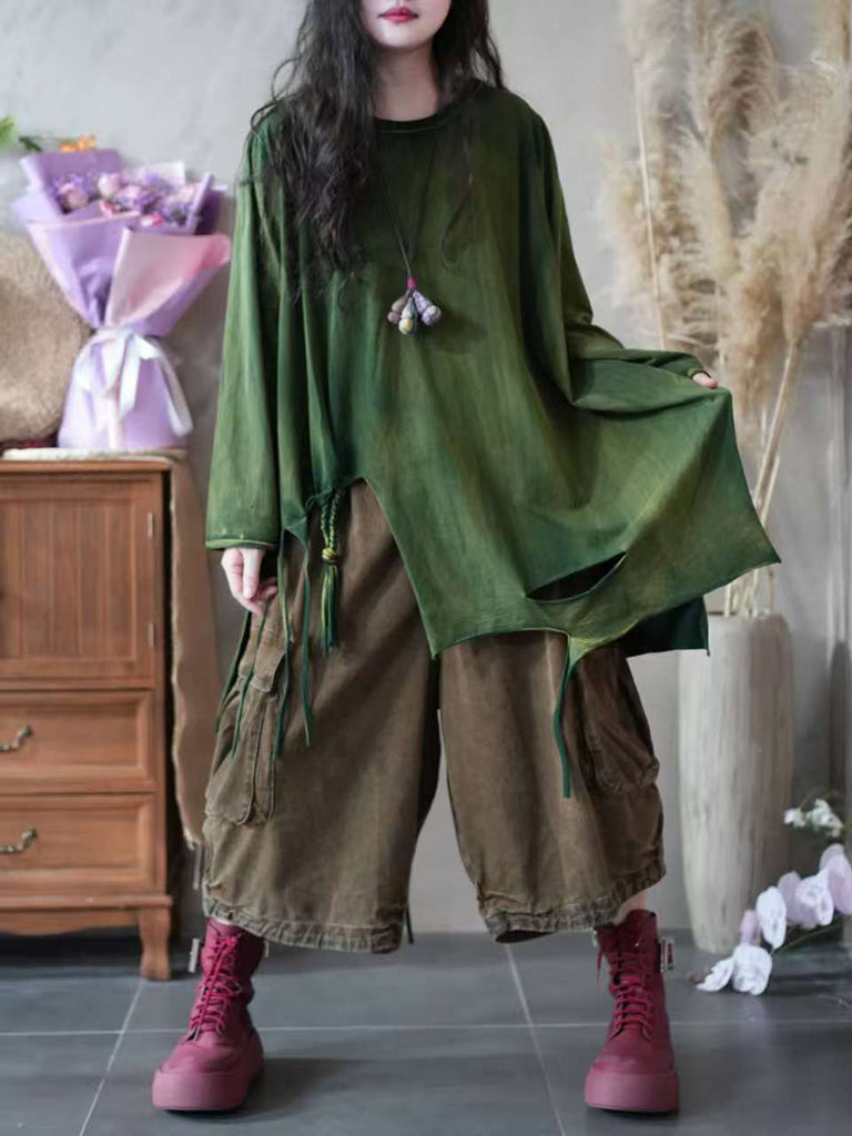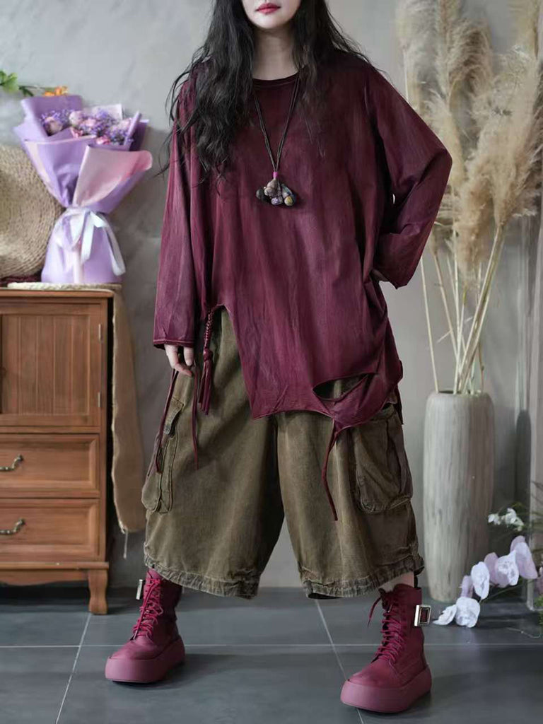 Blusa retro de otoño para mujer, 100 % algodón, cuello redondo y dobladillo dividido