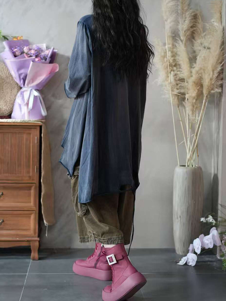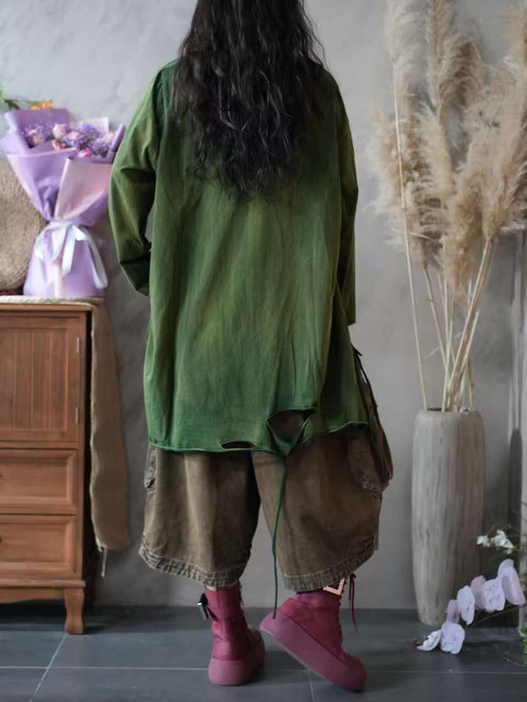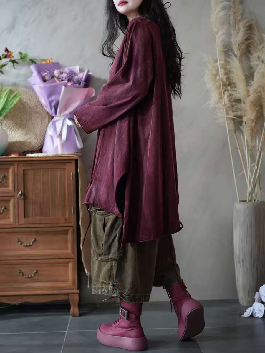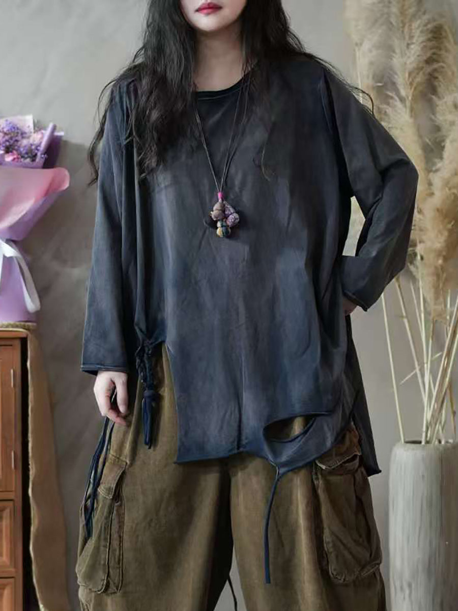 Blusa retro de otoño para mujer, 100 % algodón, cuello redondo y dobladillo dividido