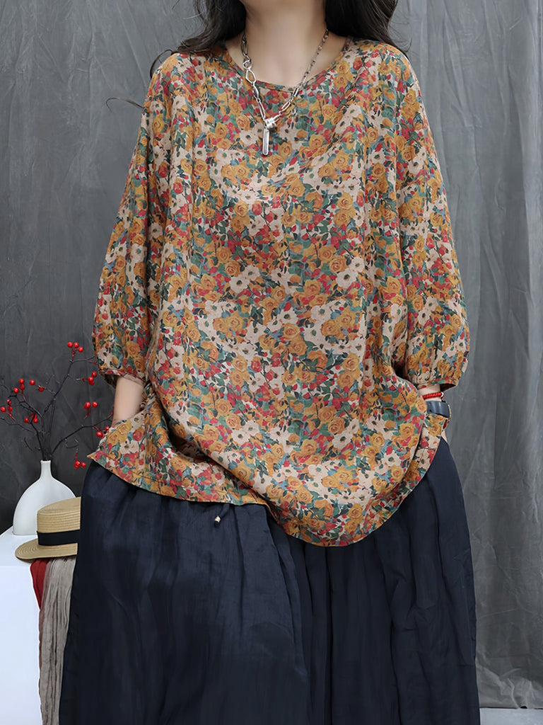 Blusa de otoño vintage con estampado floral 100 % lino y cuello redondo para mujer