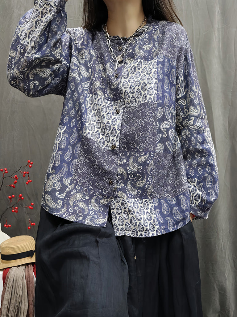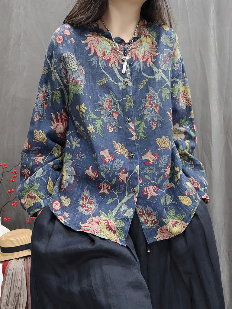 Camisa de cuello redondo 100 % lino con flores vintage de otoño para mujer