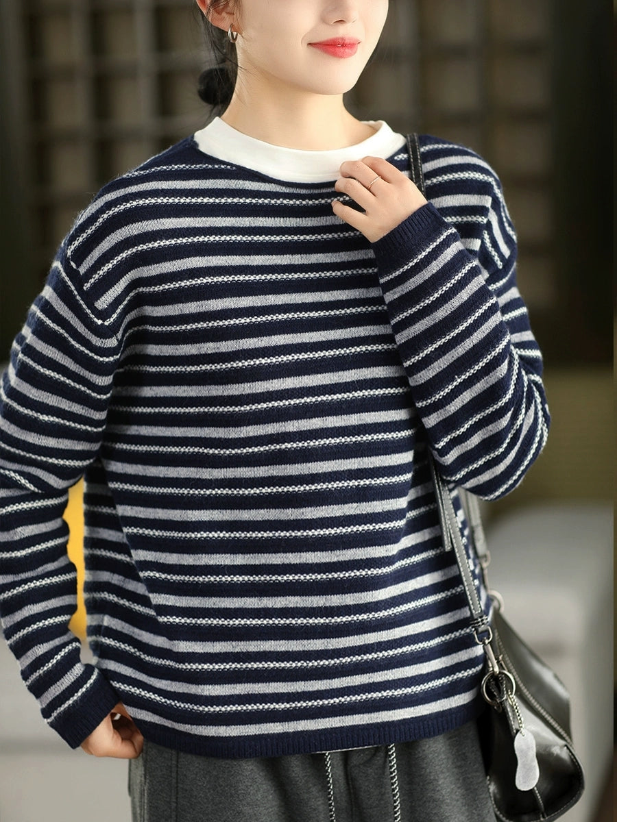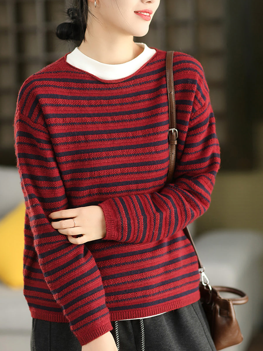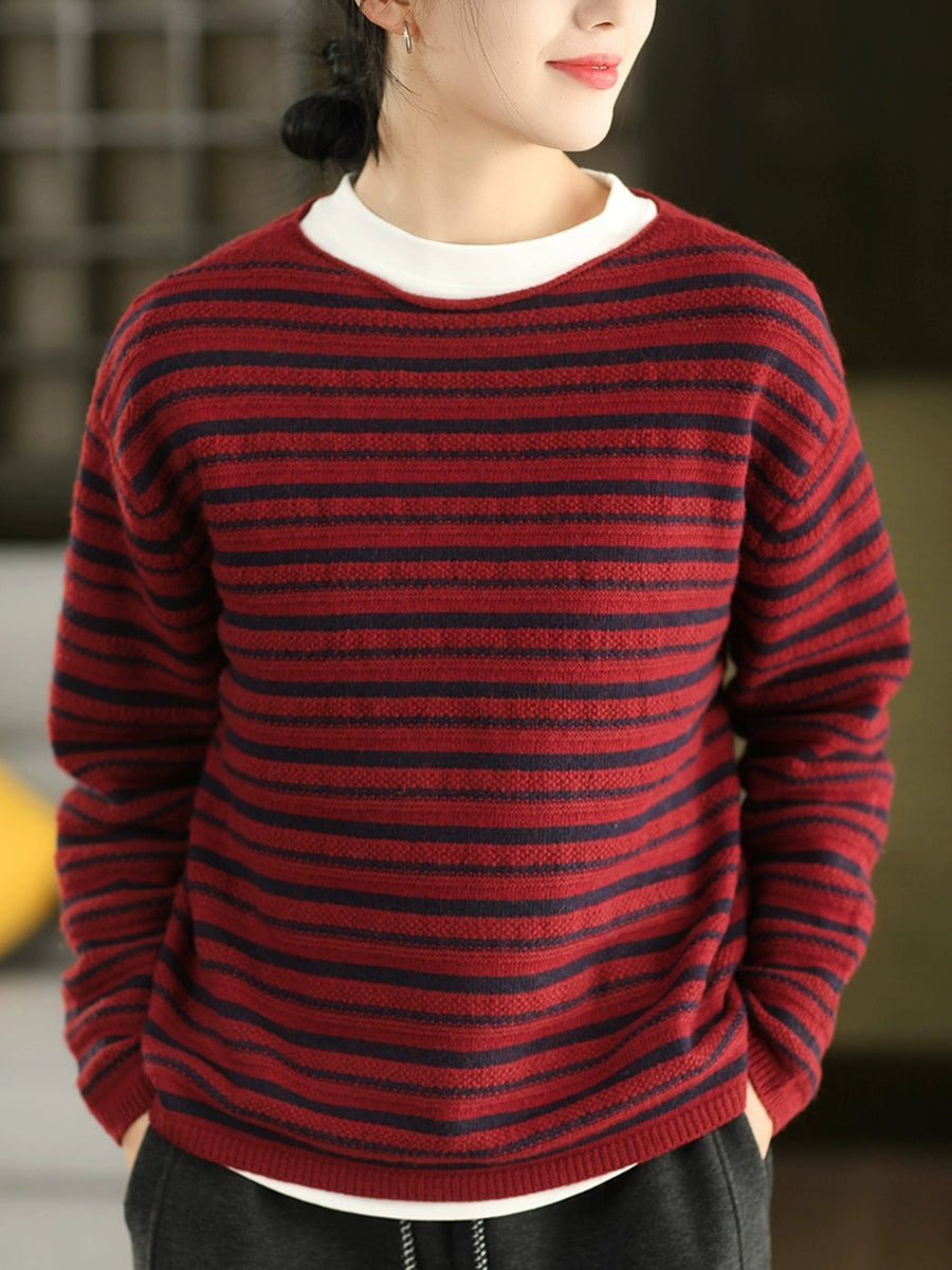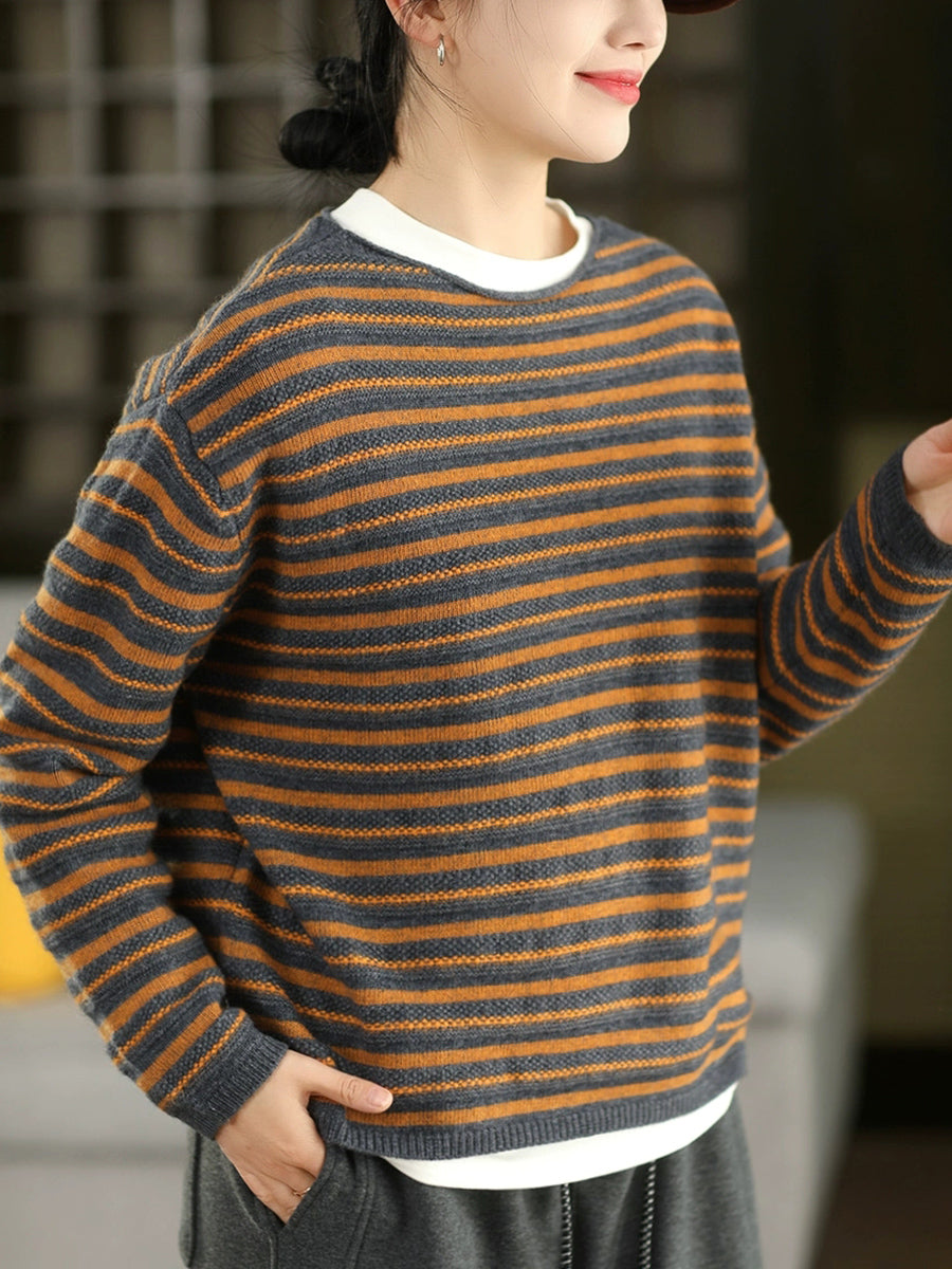 Suéter de punto con cuello redondo y rayas vintage de otoño para mujer