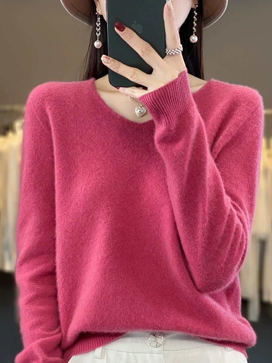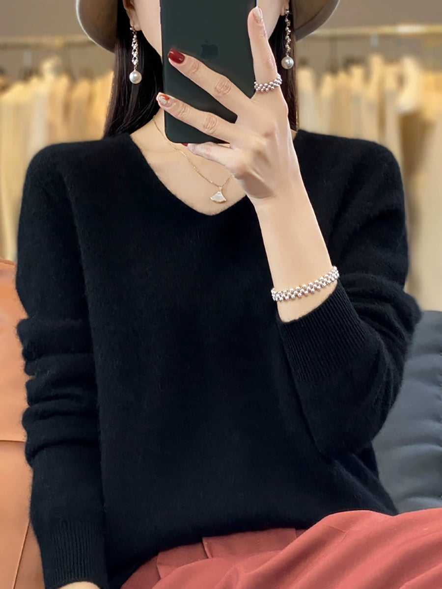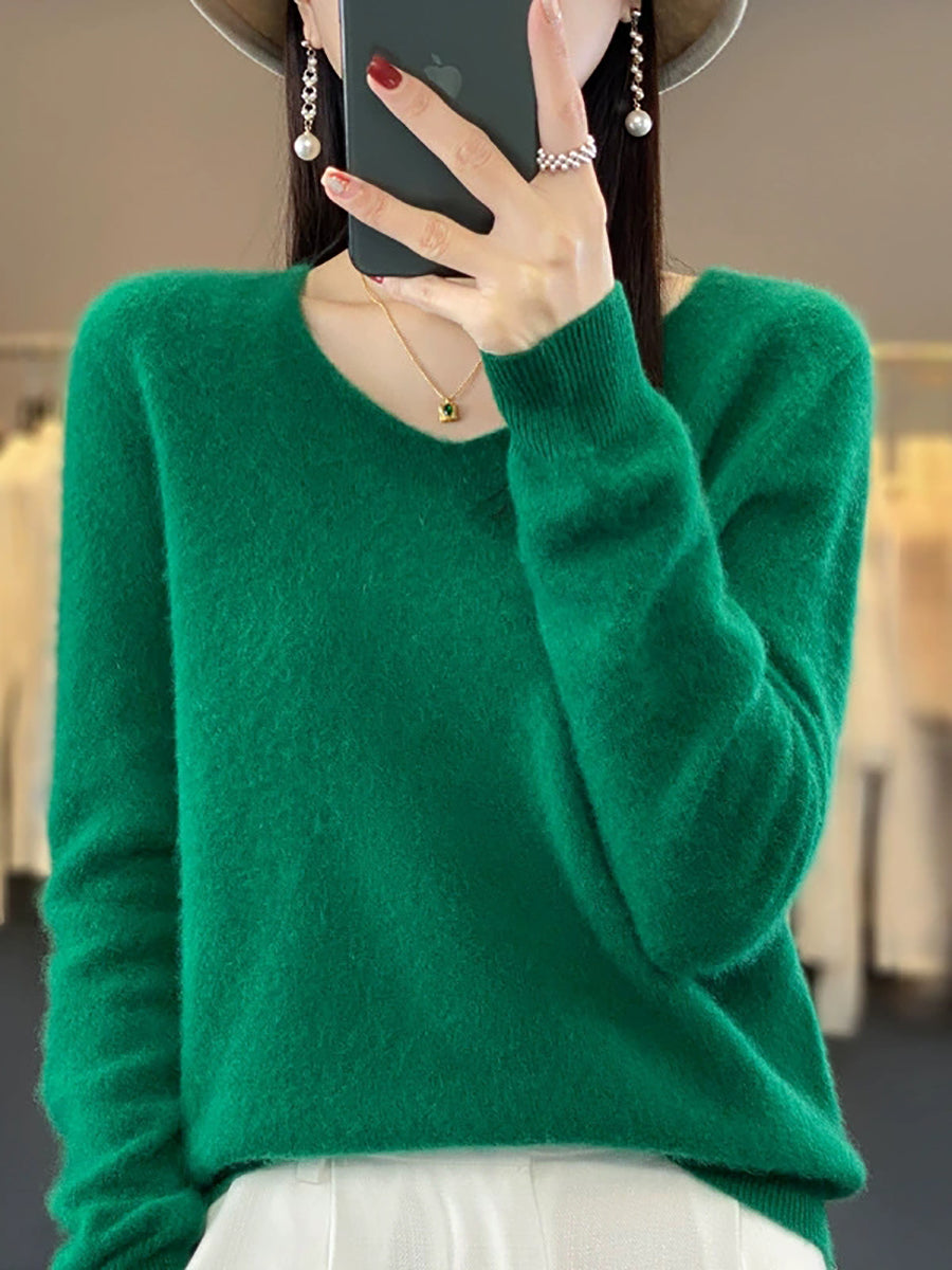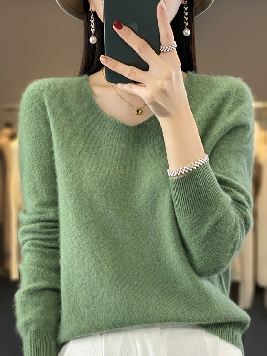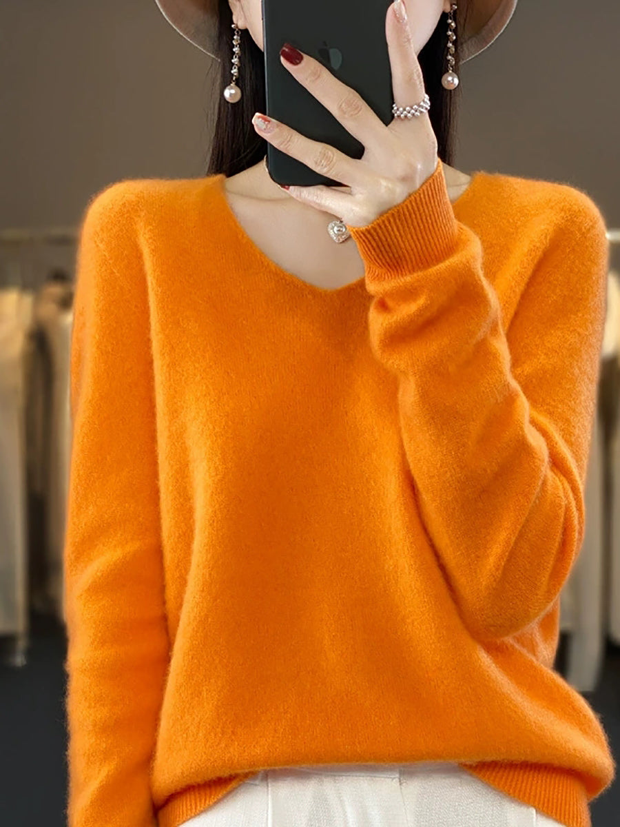 Suéter informal de lana con cuello en V y color puro para mujer