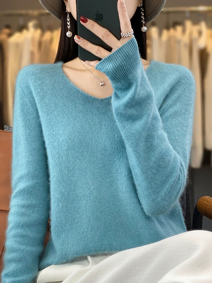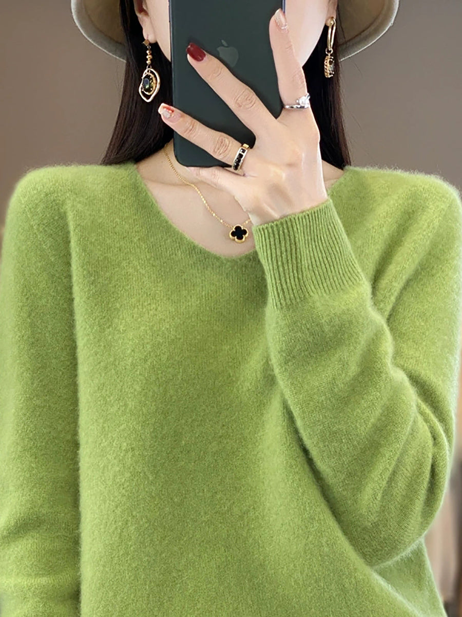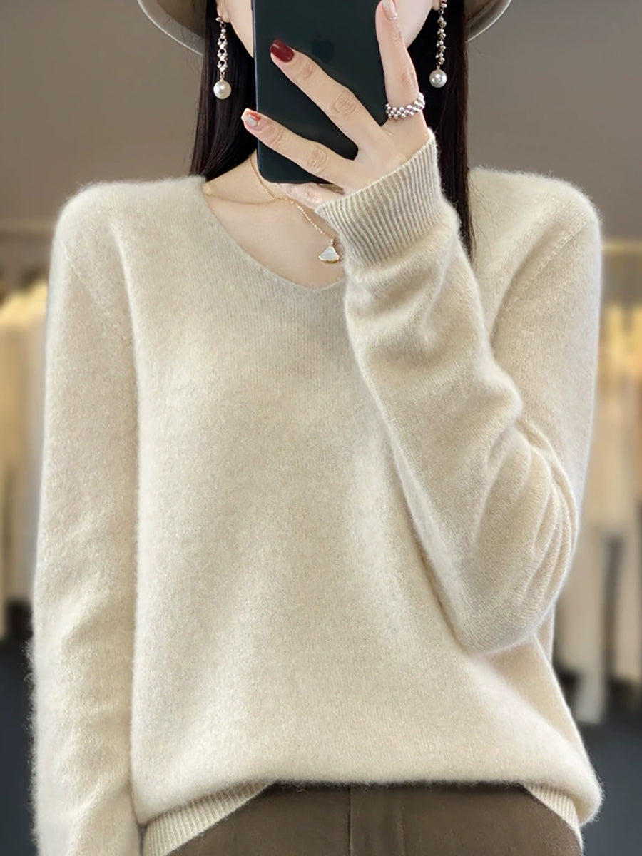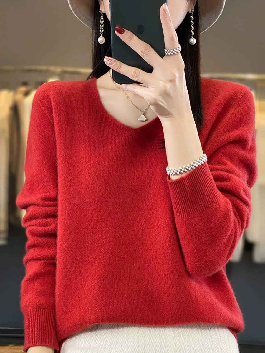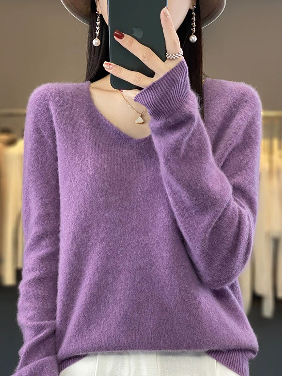 Suéter informal de lana con cuello en V y color puro para mujer