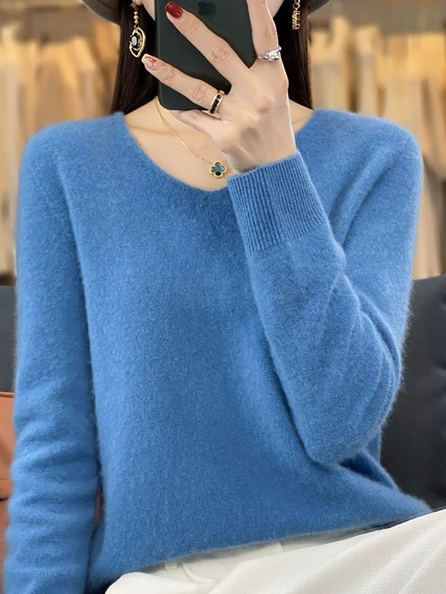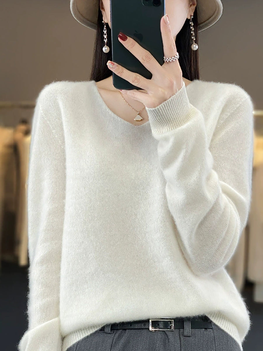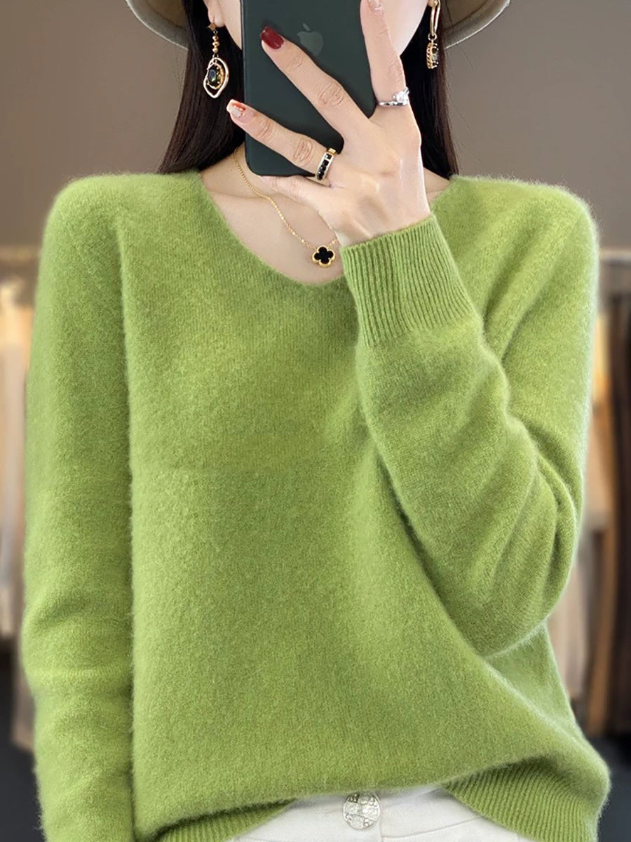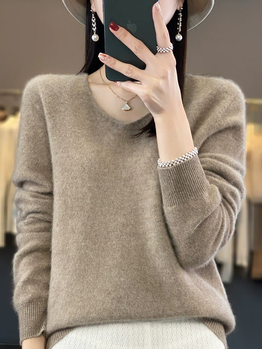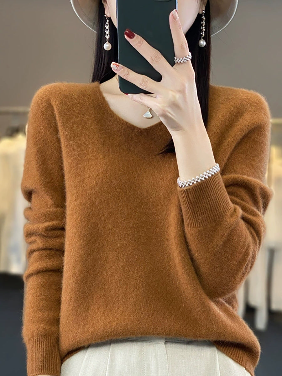 Suéter informal de lana con cuello en V y color puro para mujer