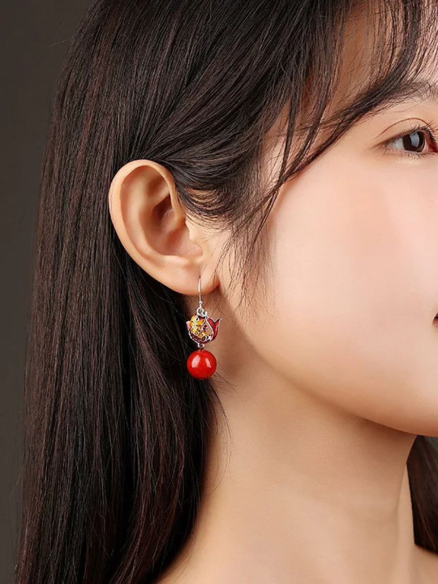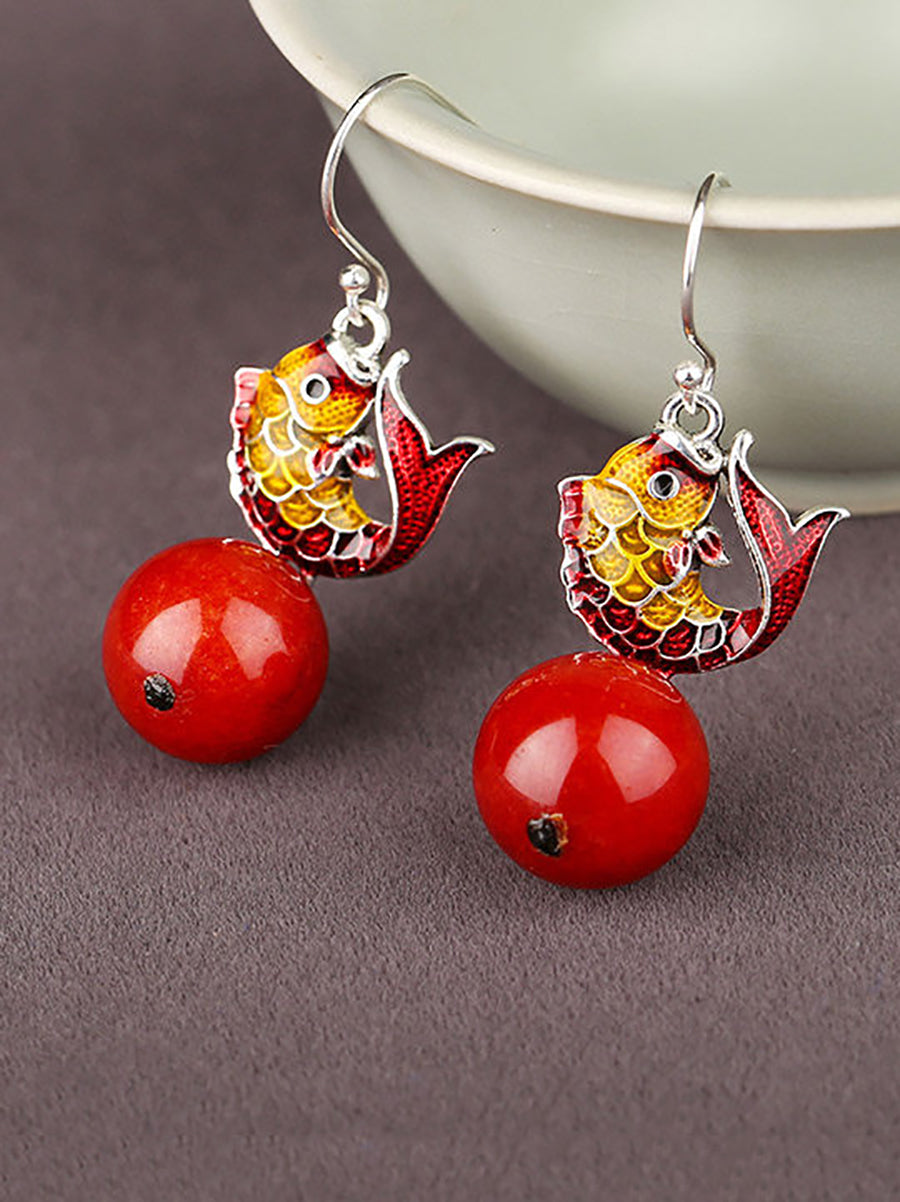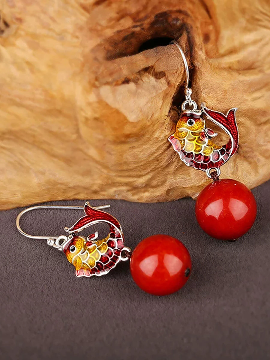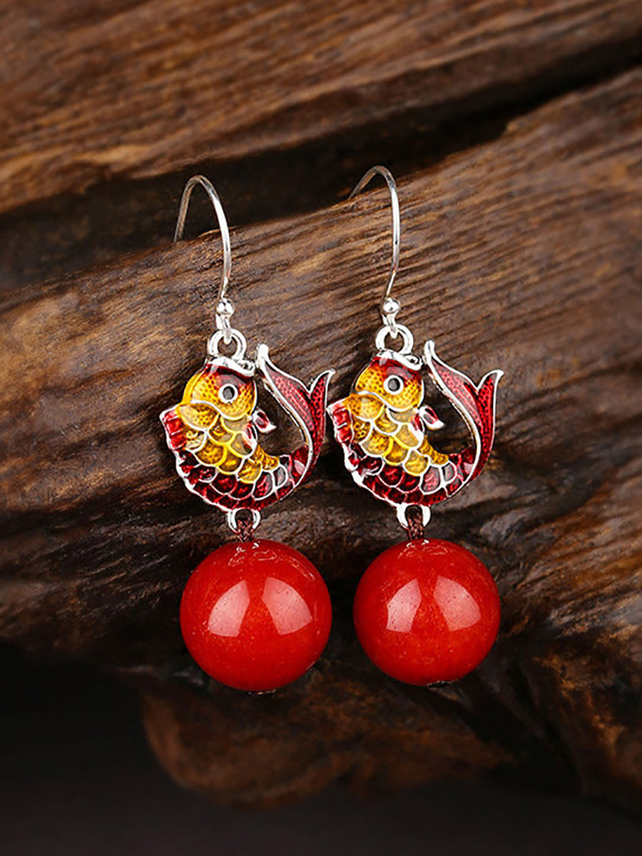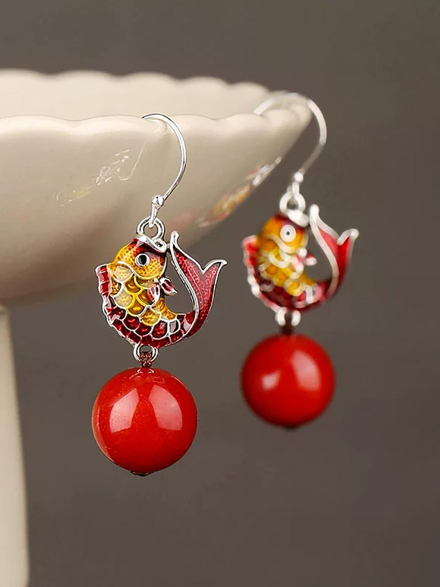 Pendientes étnicos cloisonné con cuentas rojas de pez para mujer