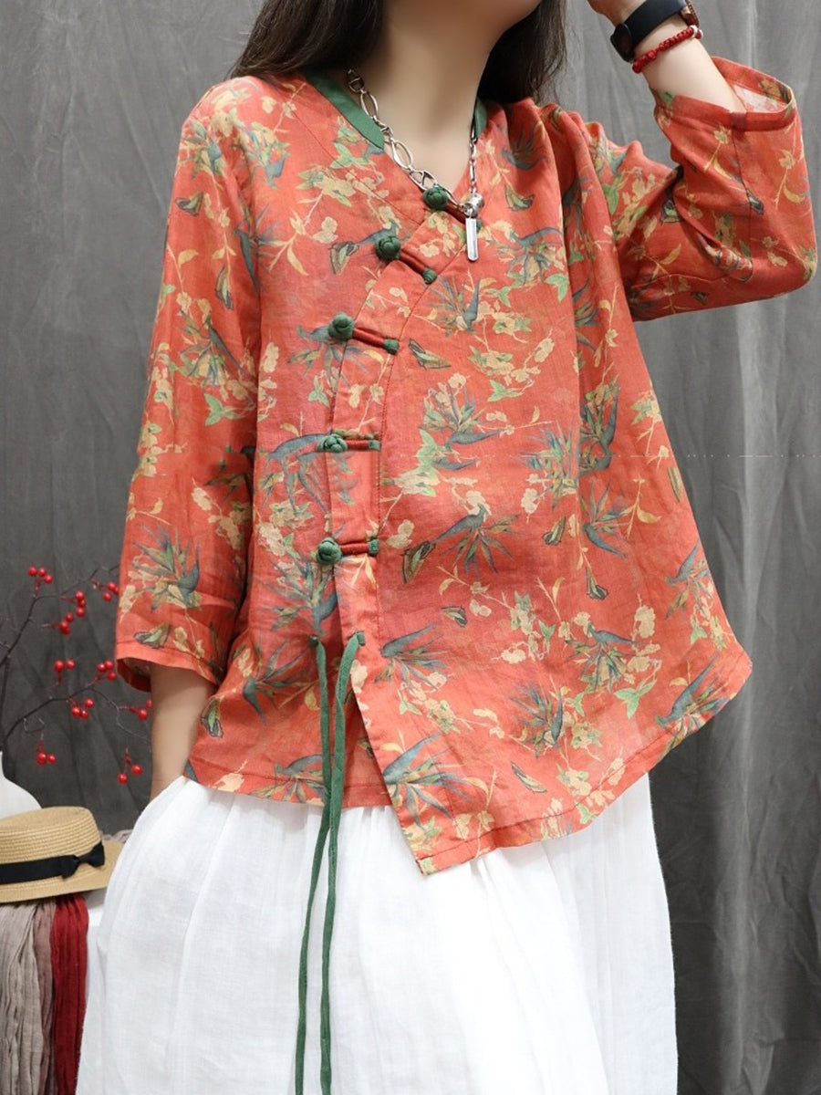 Camisa étnica de primavera para mujer, cuello en V, 100 % ramio