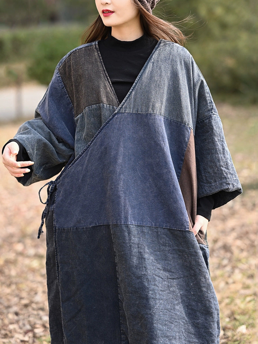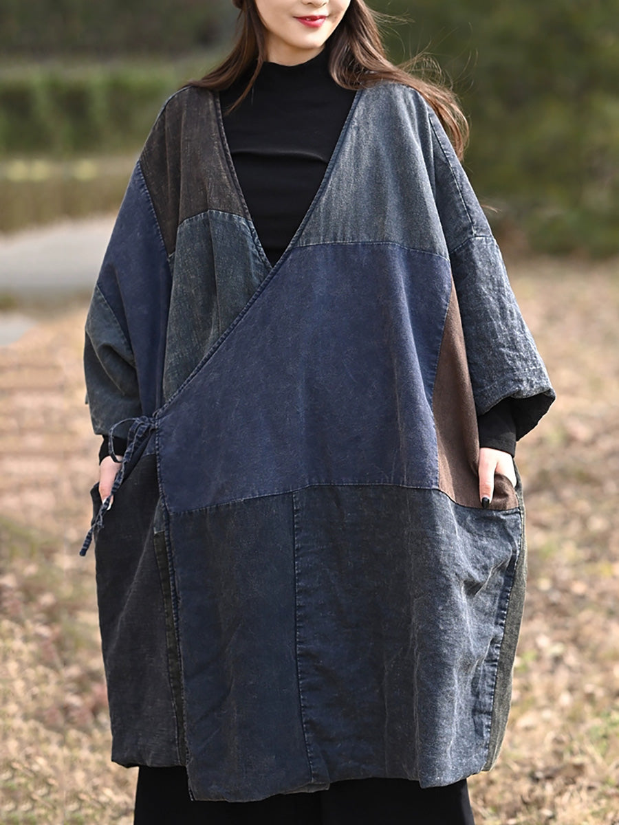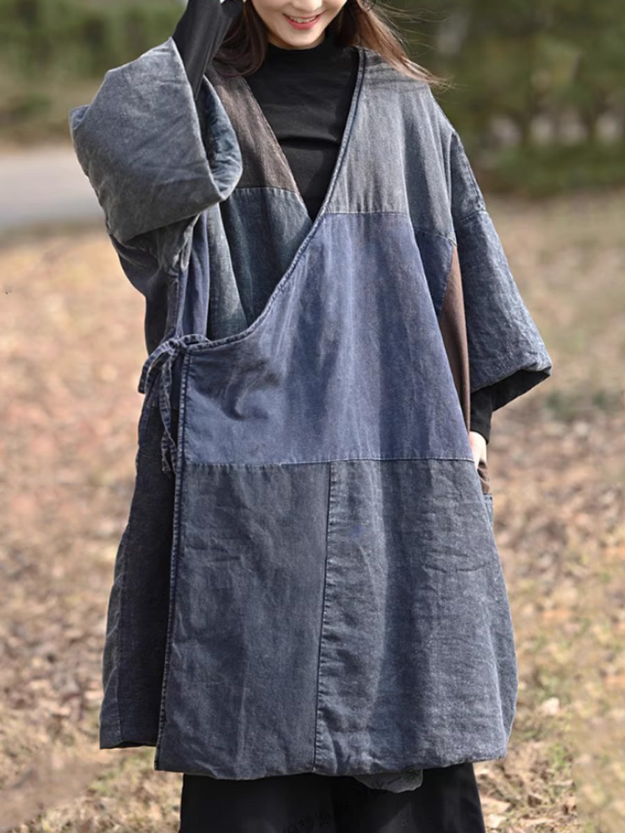 Abrigo acolchado de algodón con cuello en V y diseño retro de bloques de color para mujer