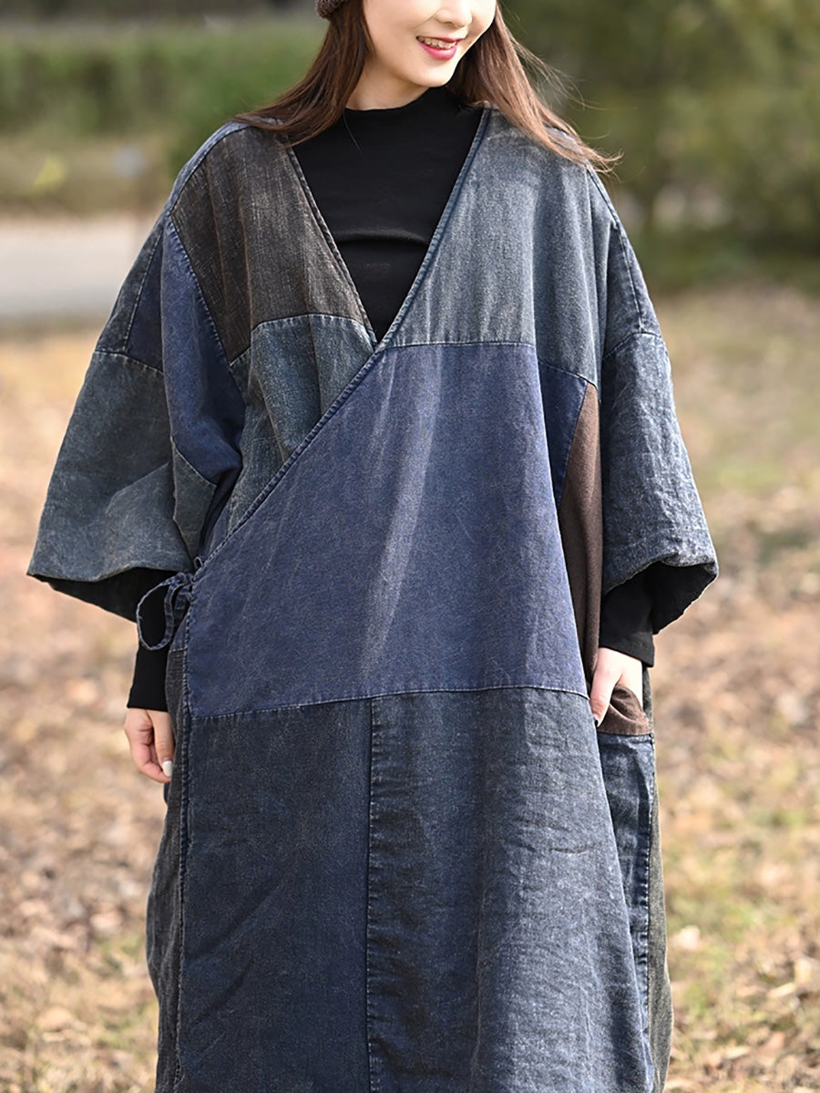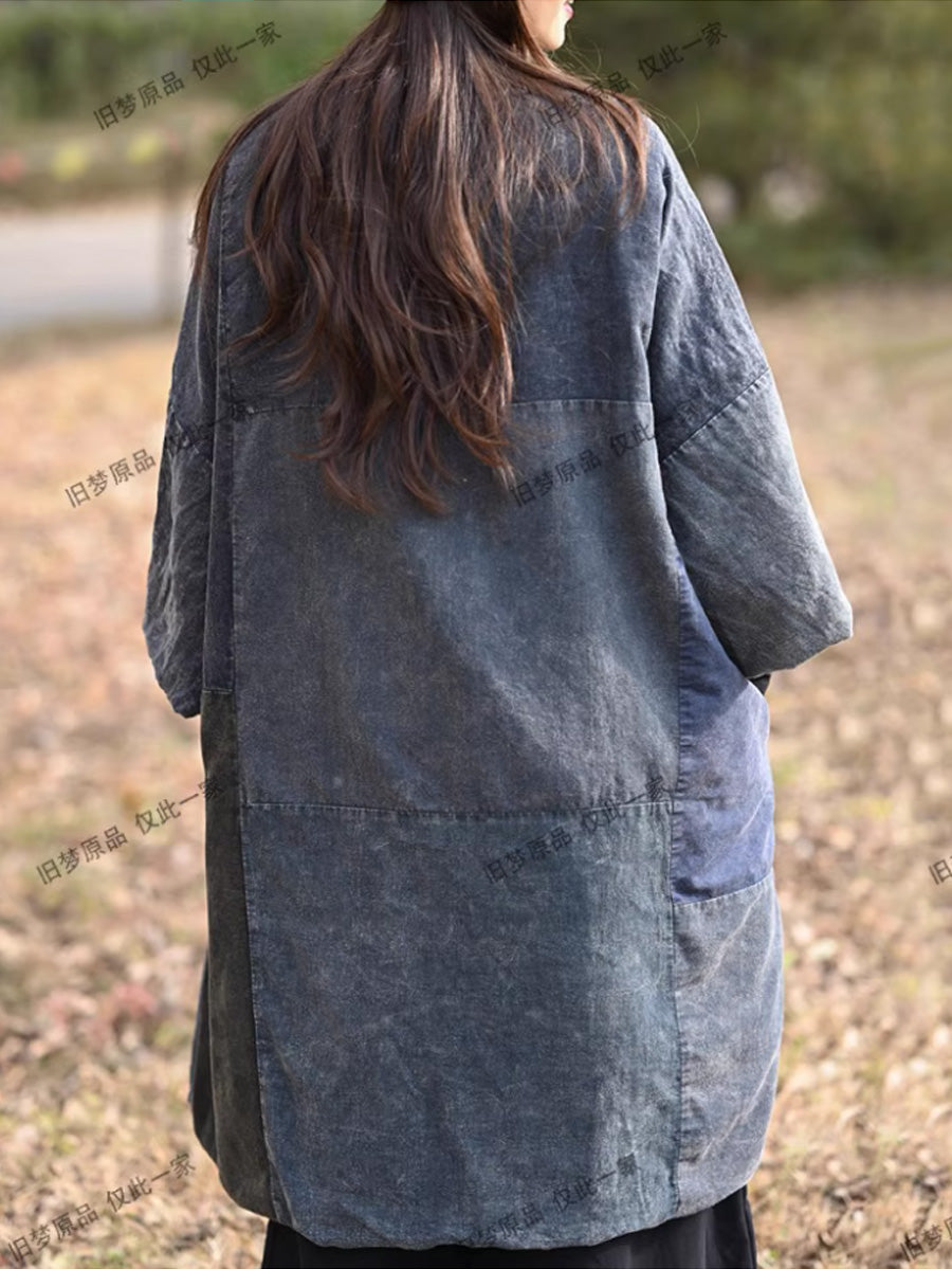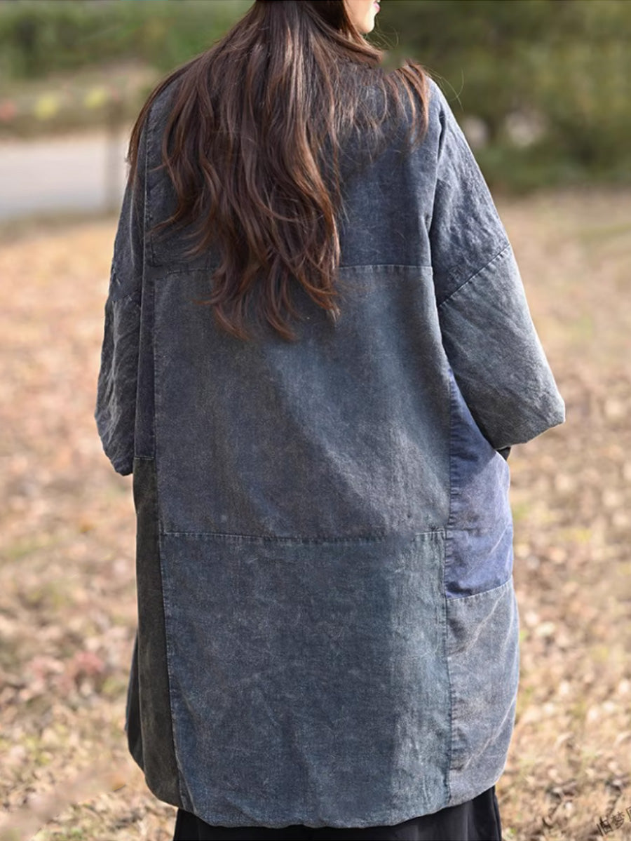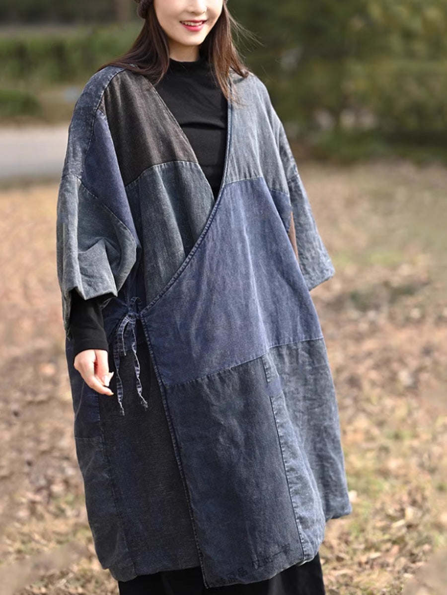 Abrigo acolchado de algodón con cuello en V y diseño retro de bloques de color para mujer
