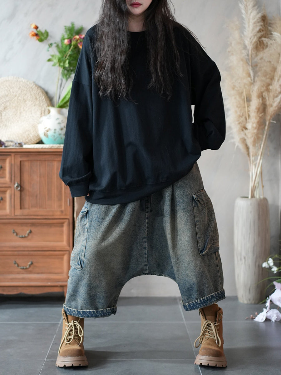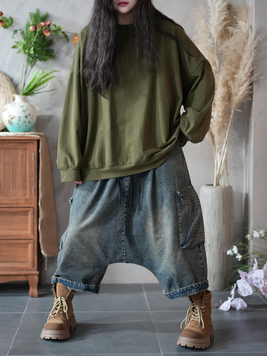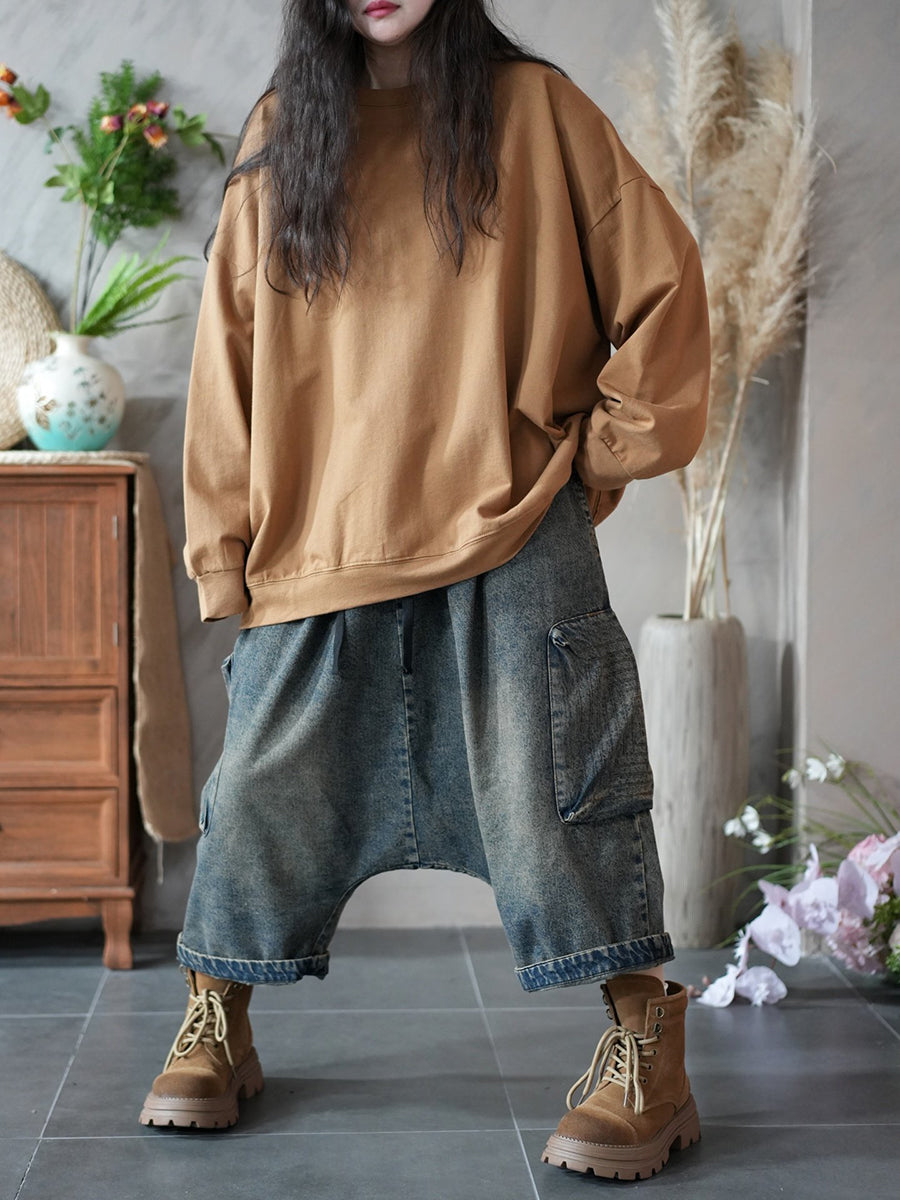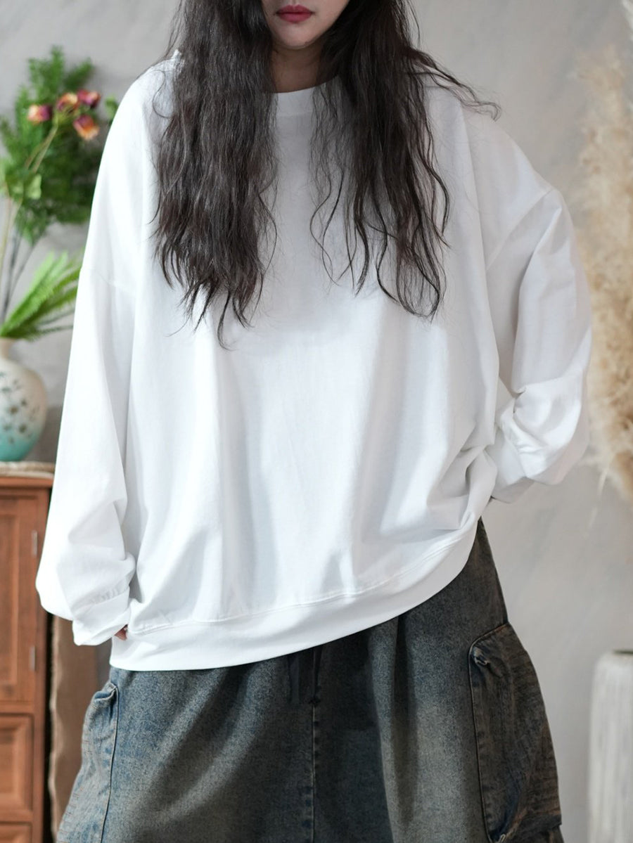 Blusa de cuello redondo 100 % algodón de color puro y estilo artístico para mujer