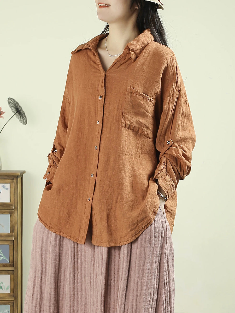 Camisa de lino 100 % con cuello vuelto y color puro para mujer, primavera