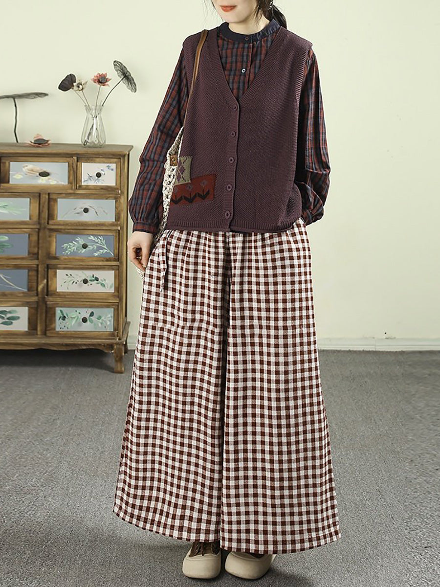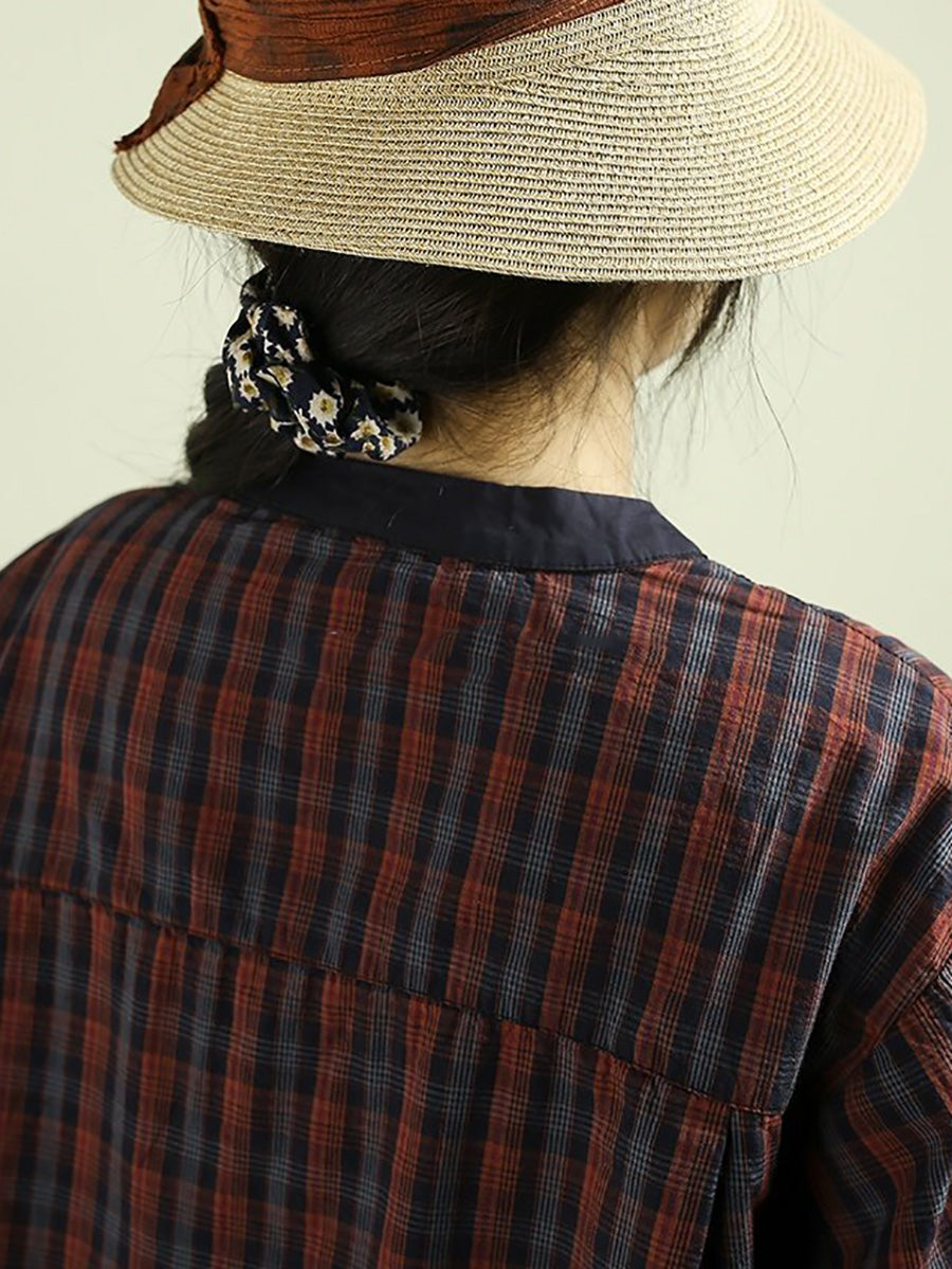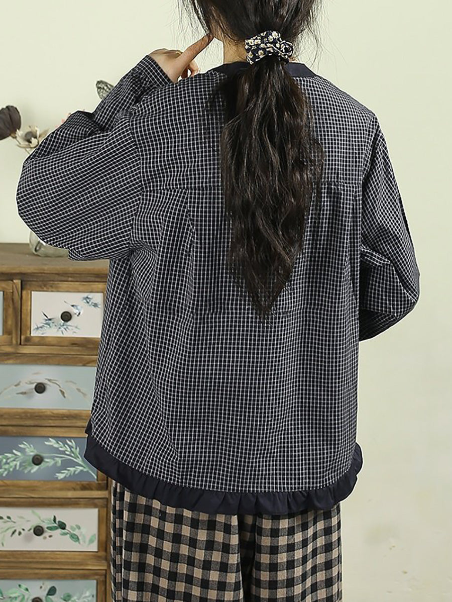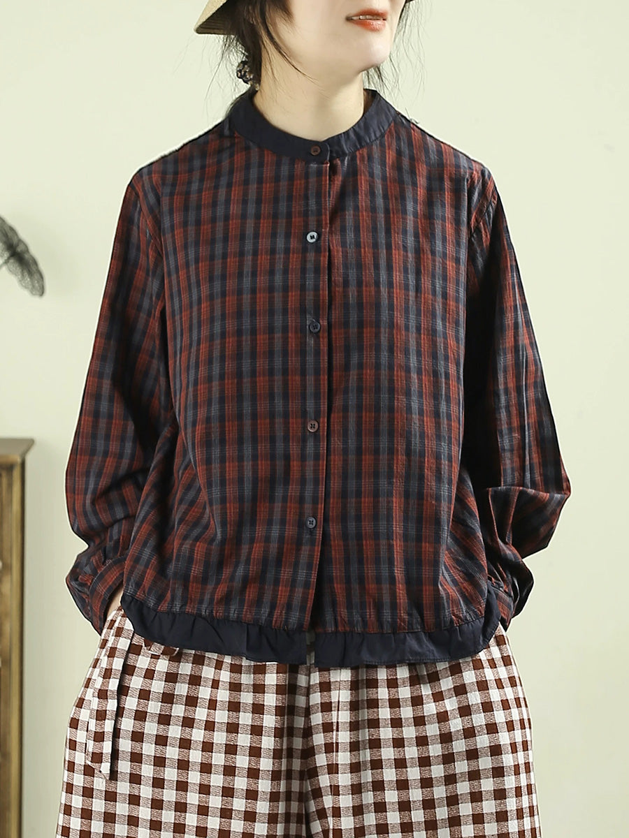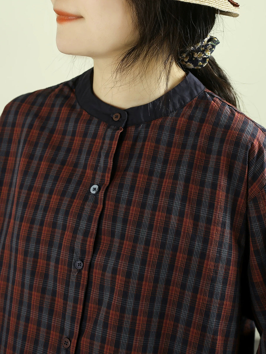 Camisa de cuello alto 100 % algodón a cuadros retro de primavera para mujer