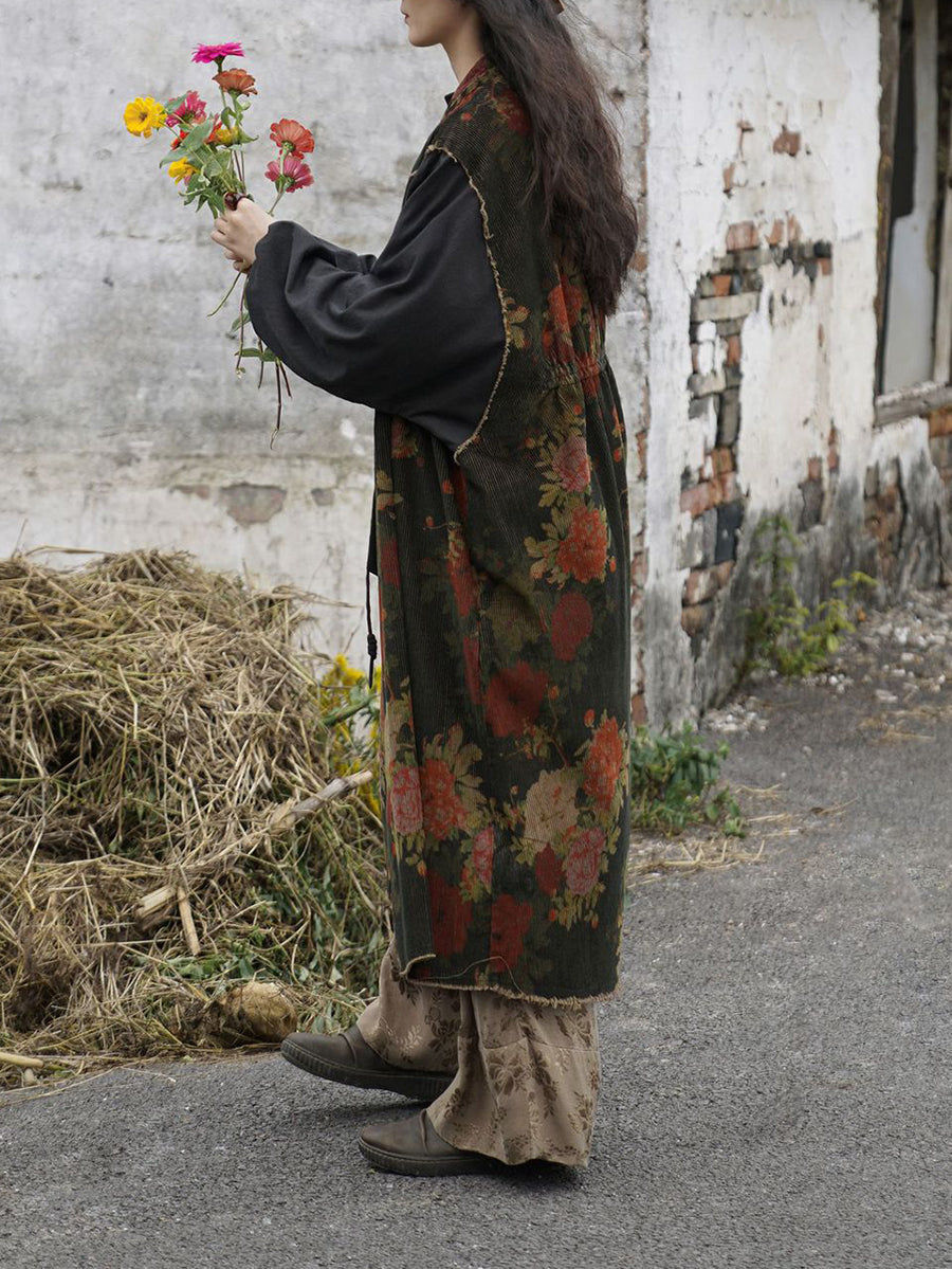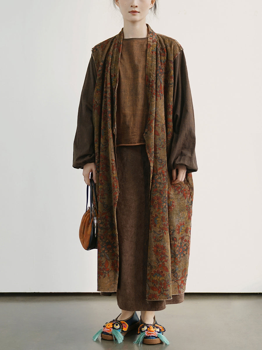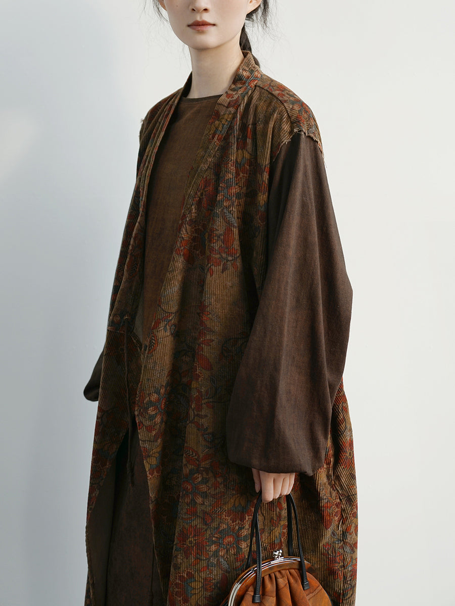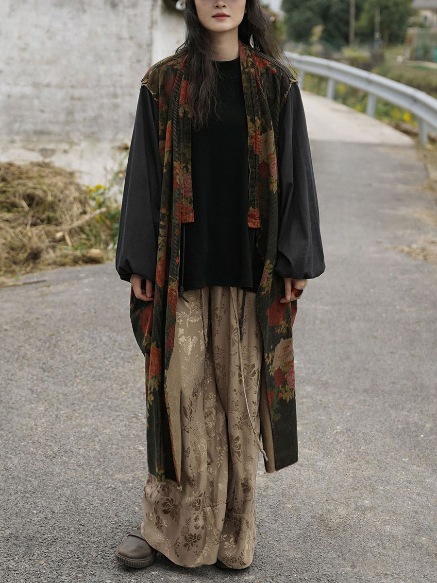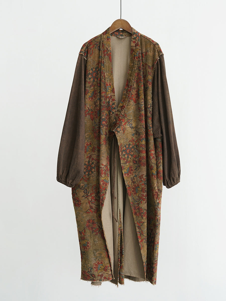 Abrigo largo de algodón con empalmes de flores vintage para mujer