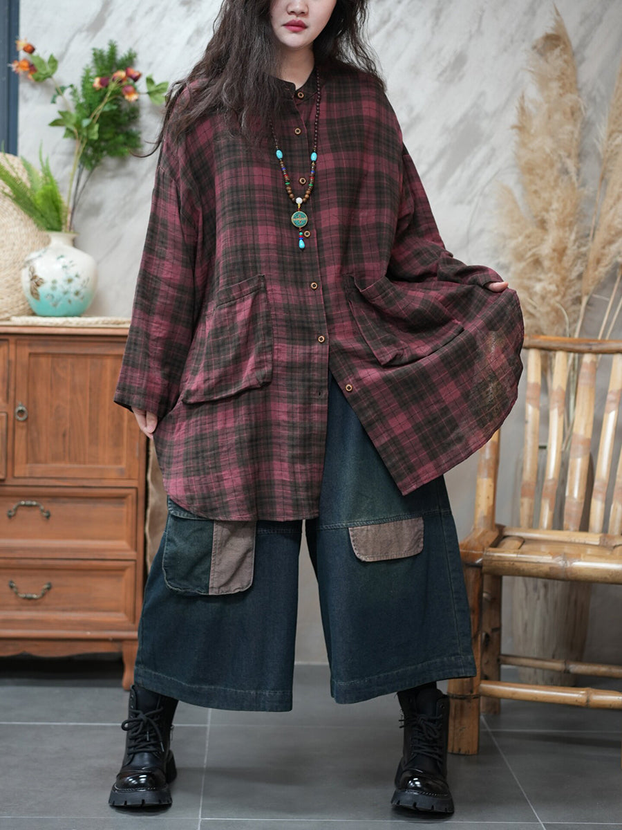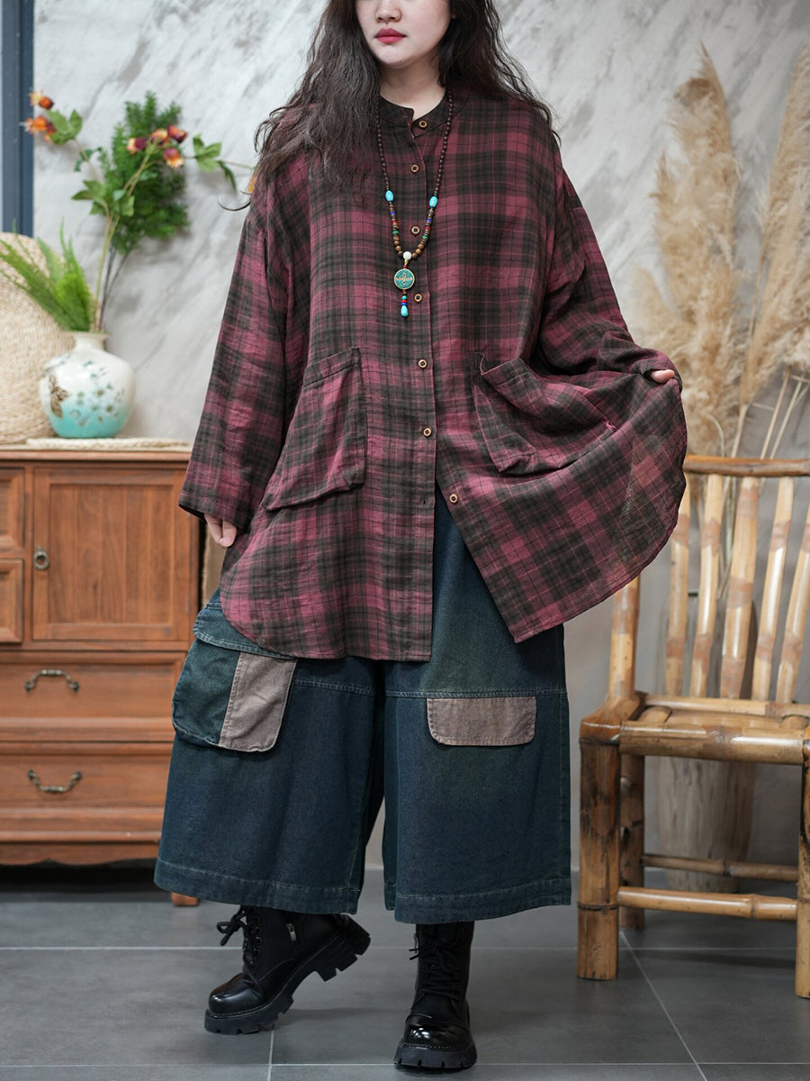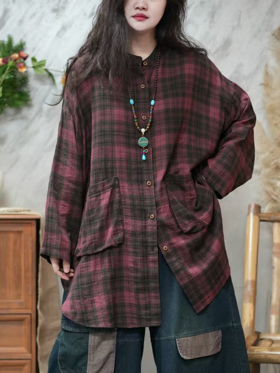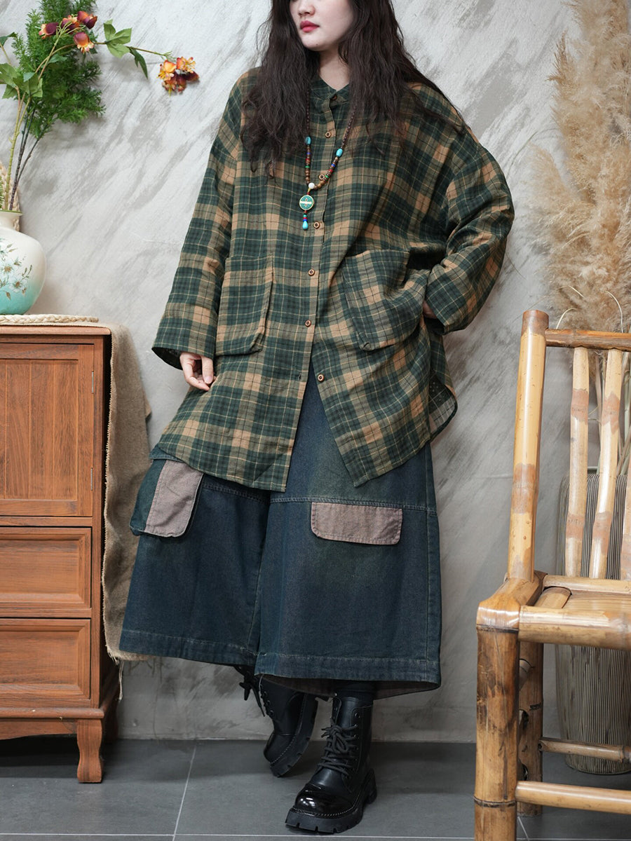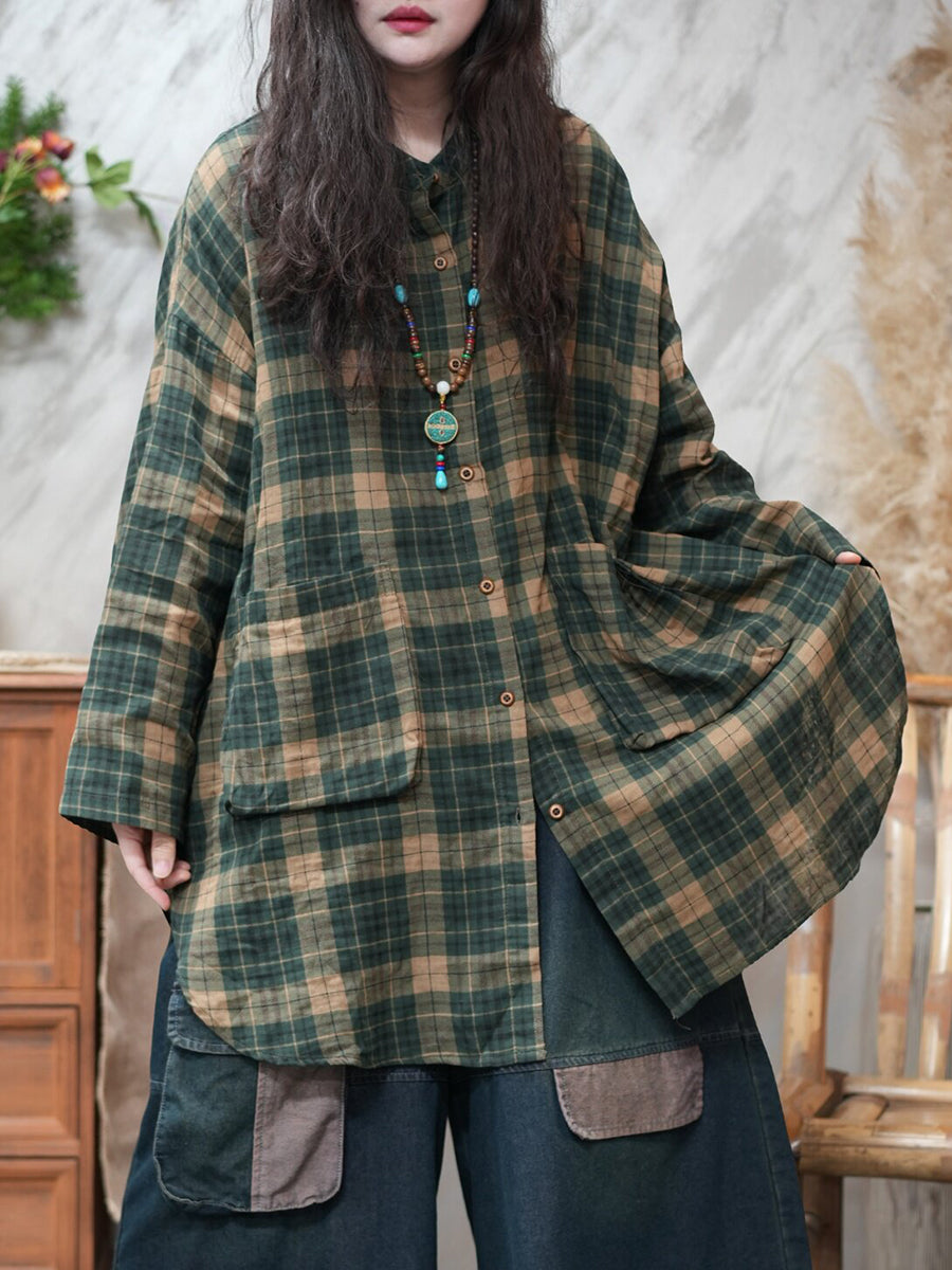 Camisa vintage a cuadros con cuello vuelto para mujer de primavera