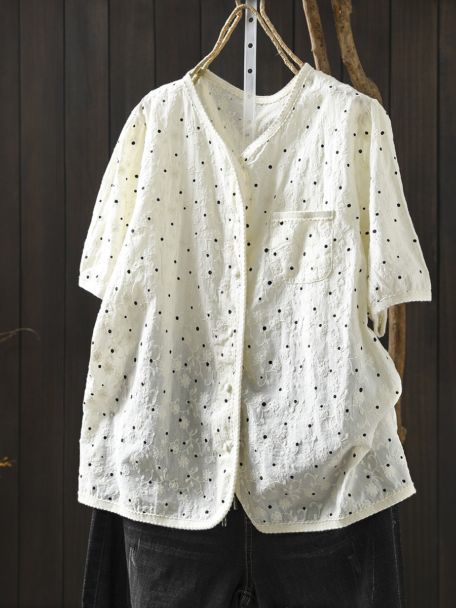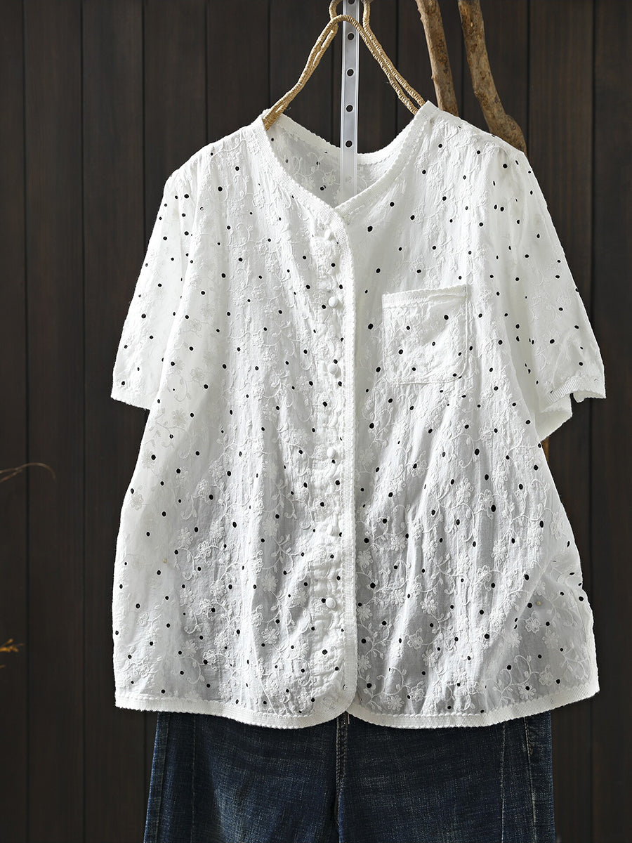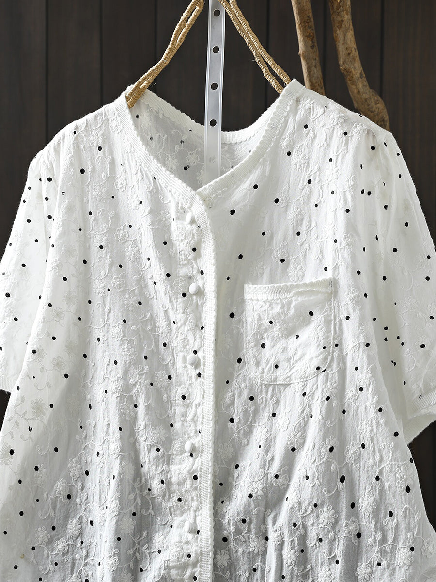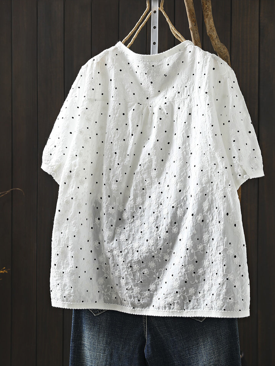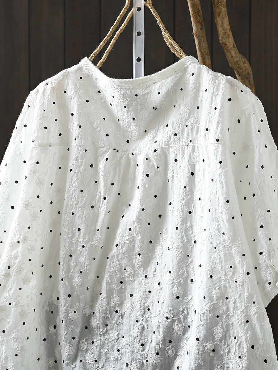 Blusa de verano para mujer con cuello redondo y bordado de lunares, 100% algodón.