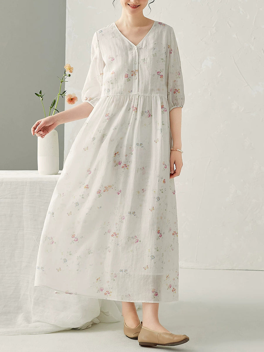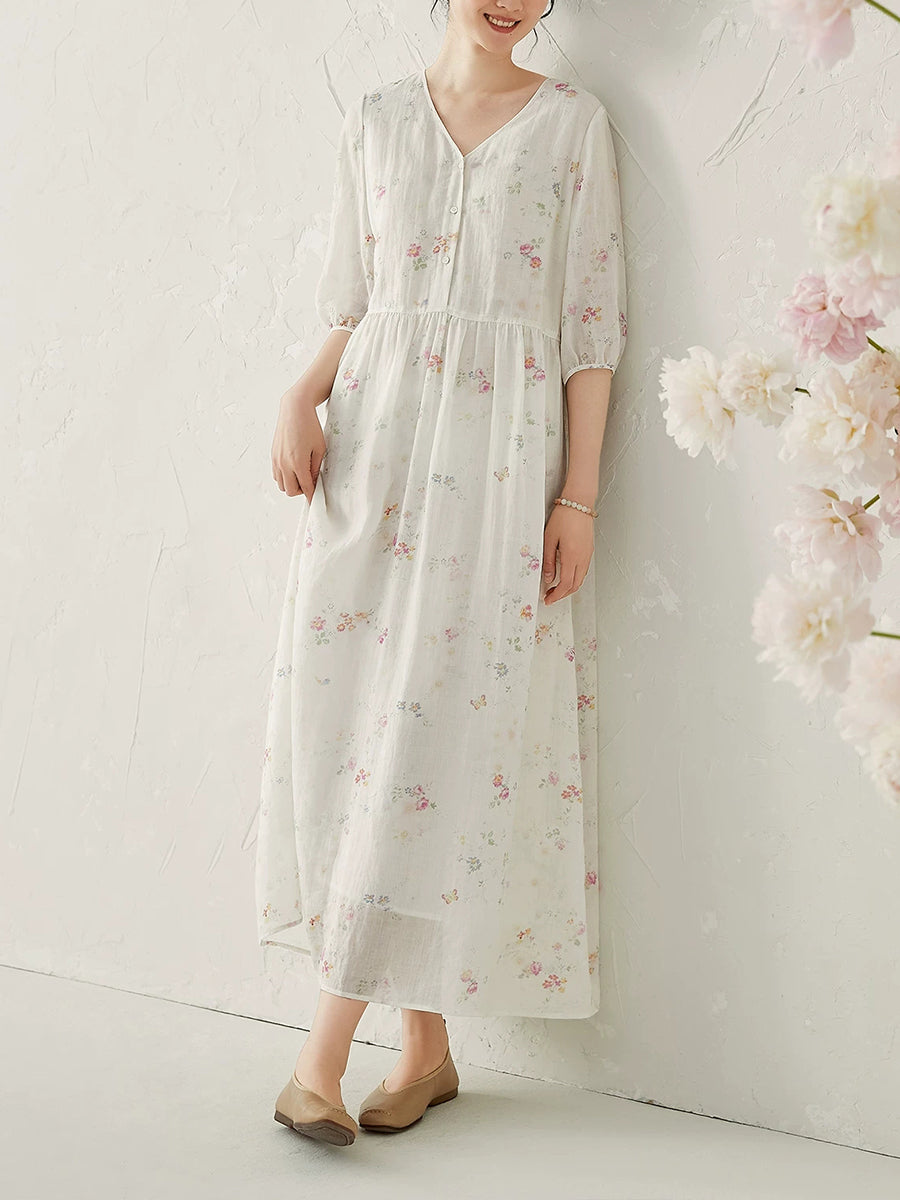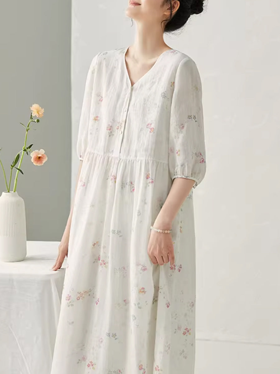 Vestido de verano con cuello en V y estampado floral de ramio para mujer