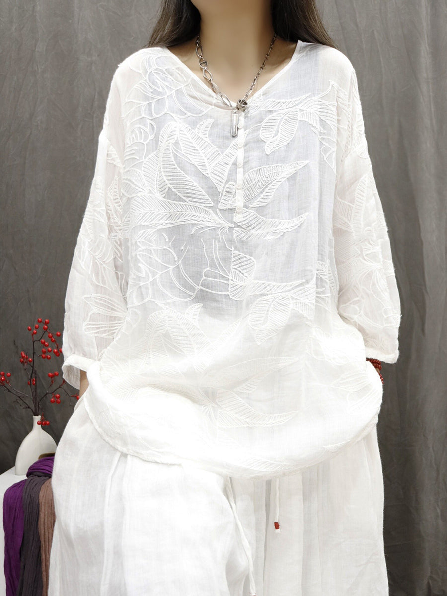 Blusa de verano para mujer con bordado floral artístico 100 % ramio