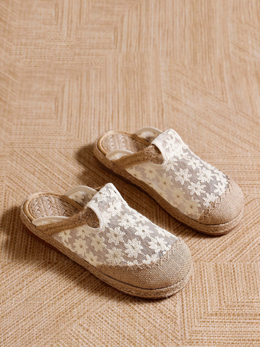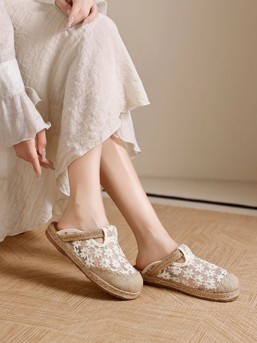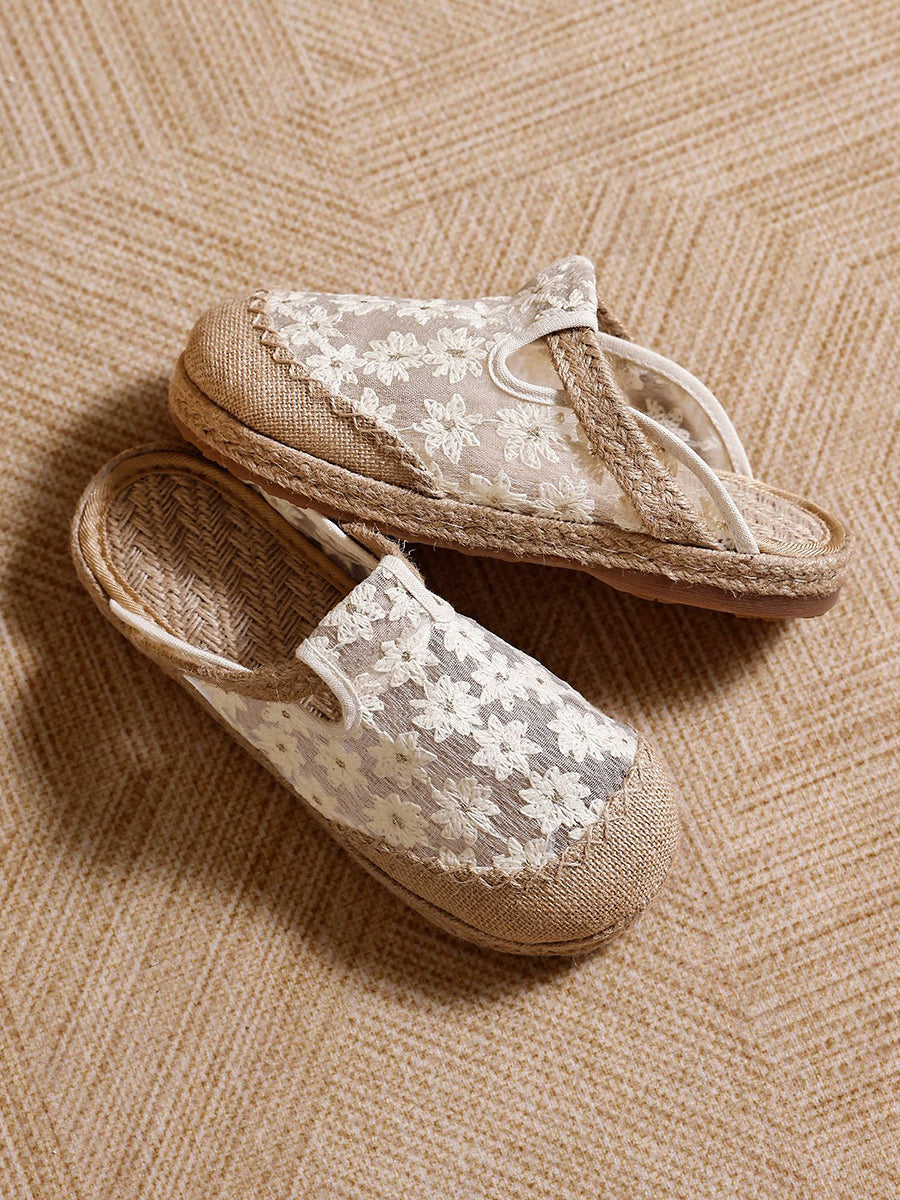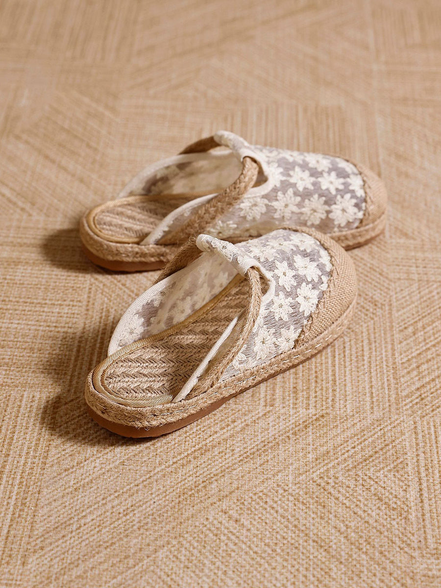 Pantuflas de lino para mujer con bordado floral artístico, ideales para el verano.