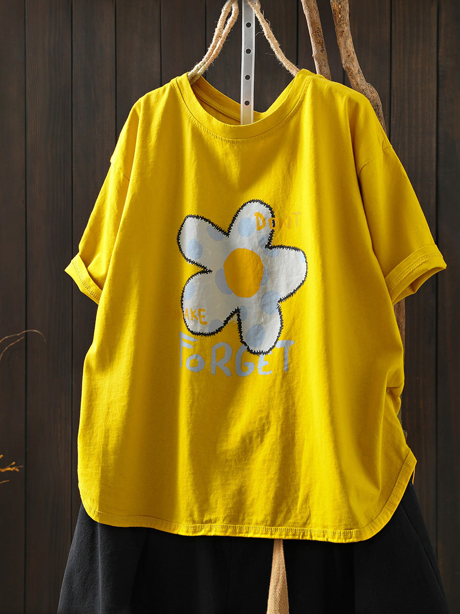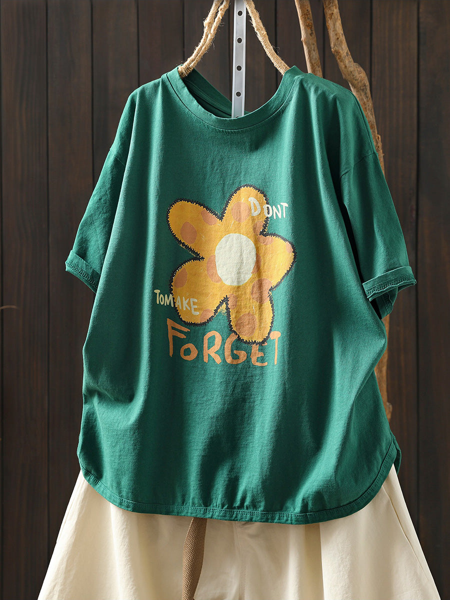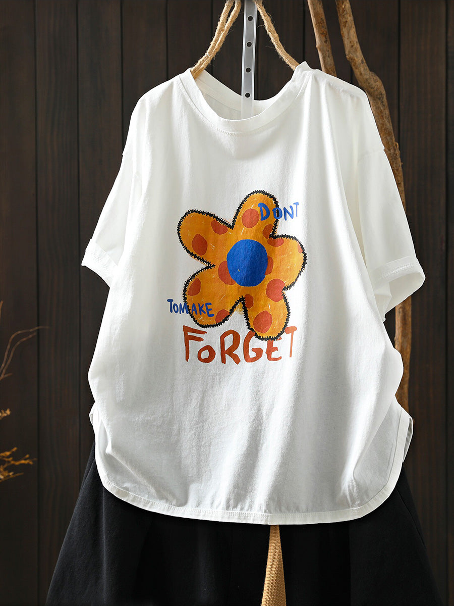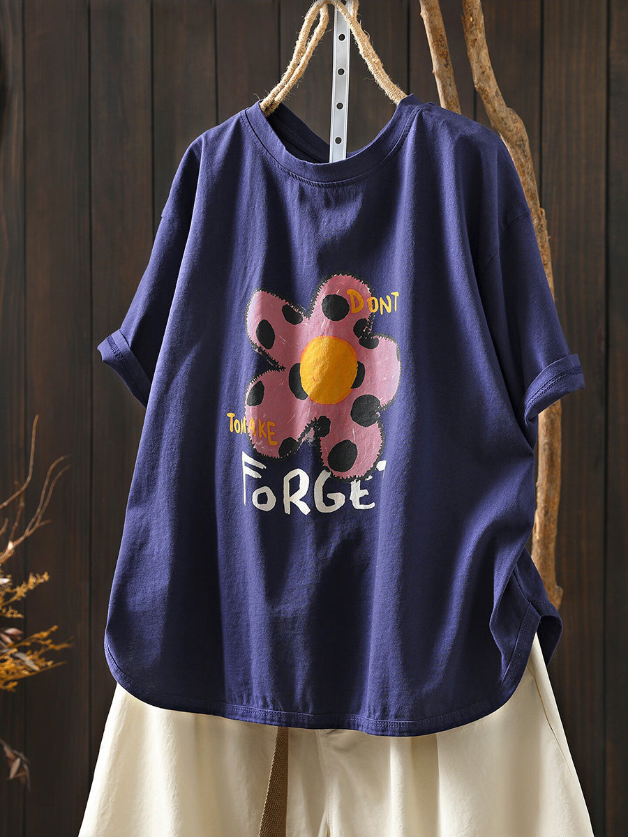 Camiseta de algodón de cuello redondo con estampado floral artístico para mujer, ideal para el verano.