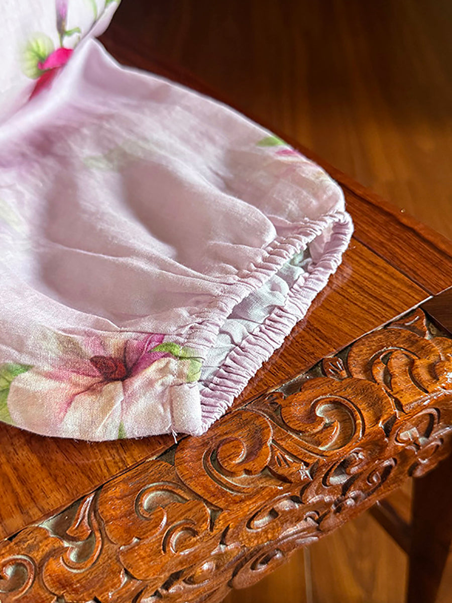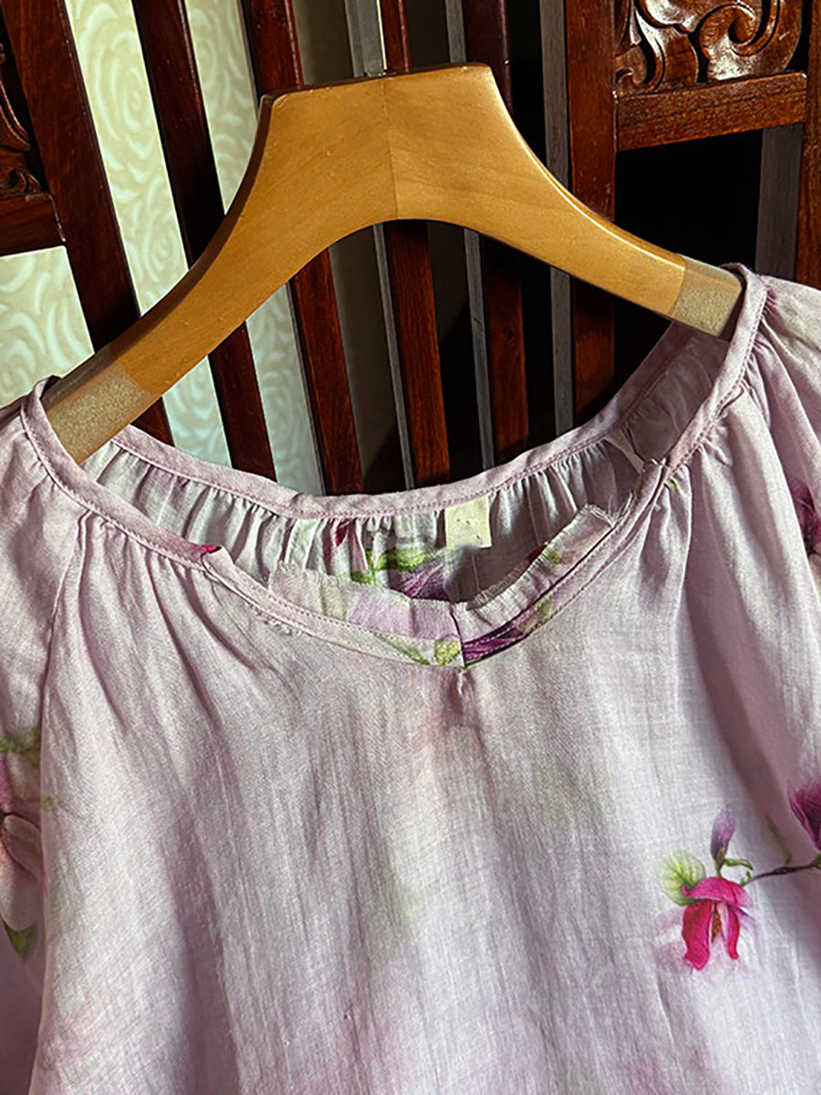 Camisa de verano para mujer con cuello en V y estampado floral 100 % ramio