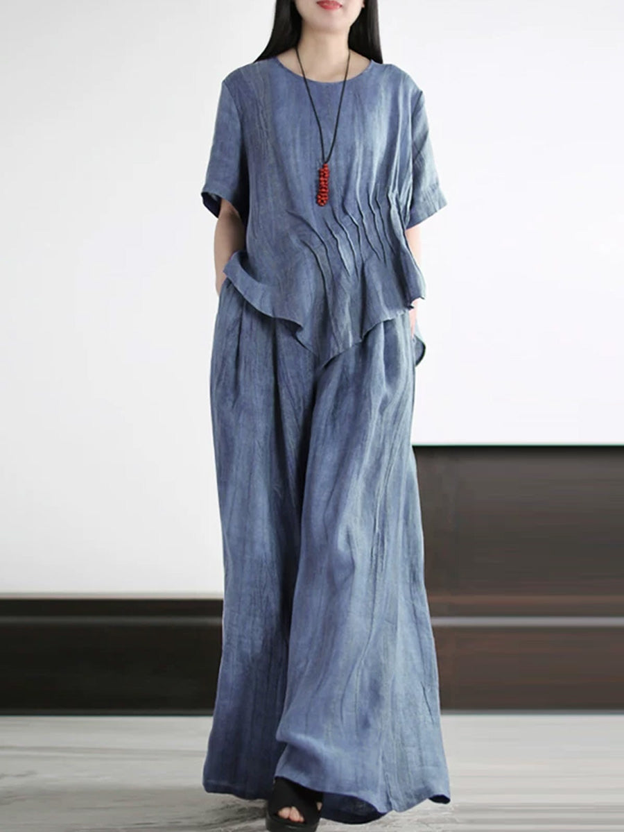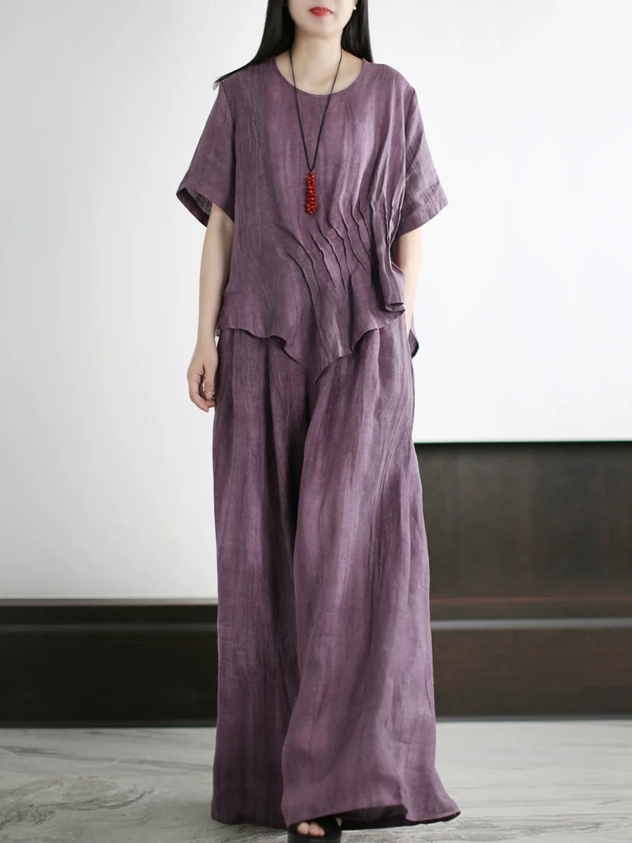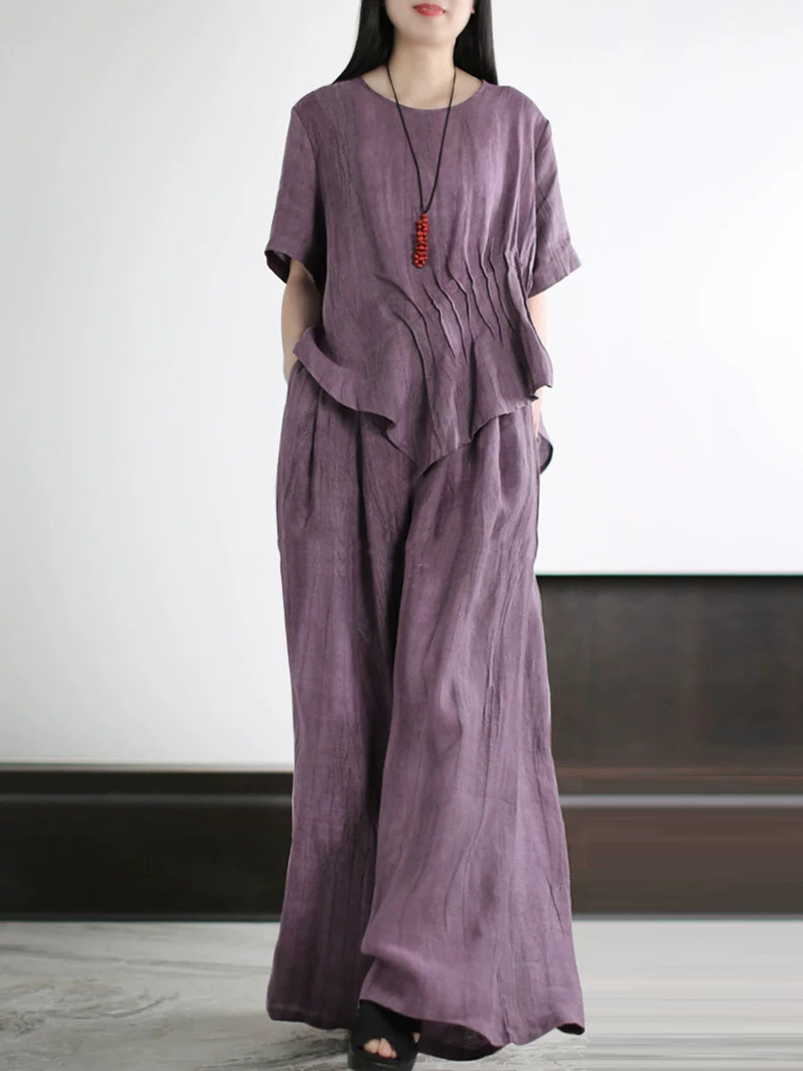 Trajes de verano para mujer de lino de color liso con cuello redondo.