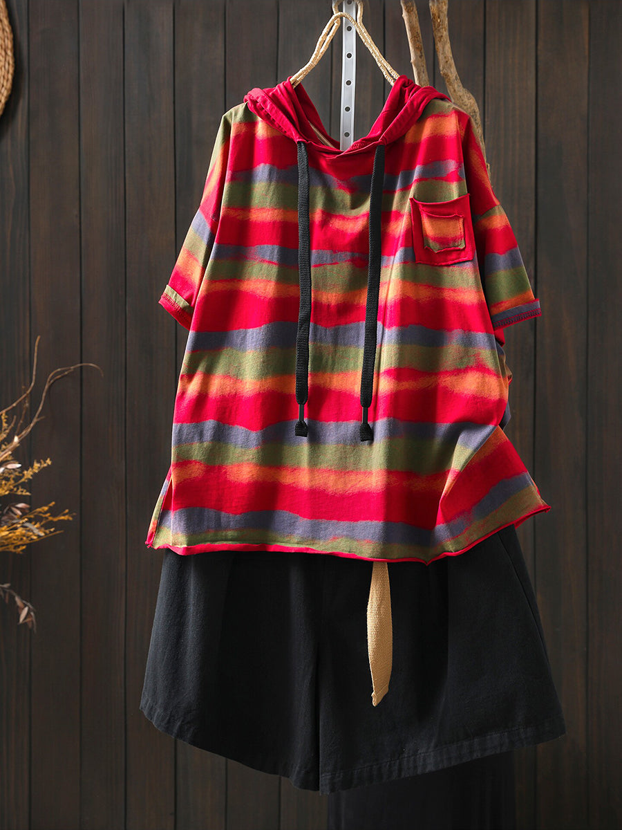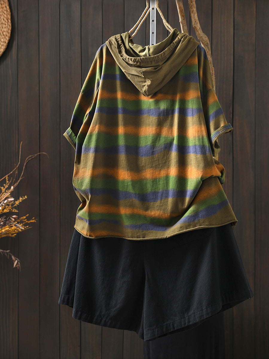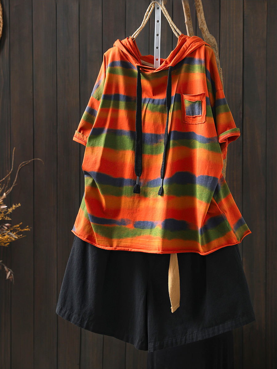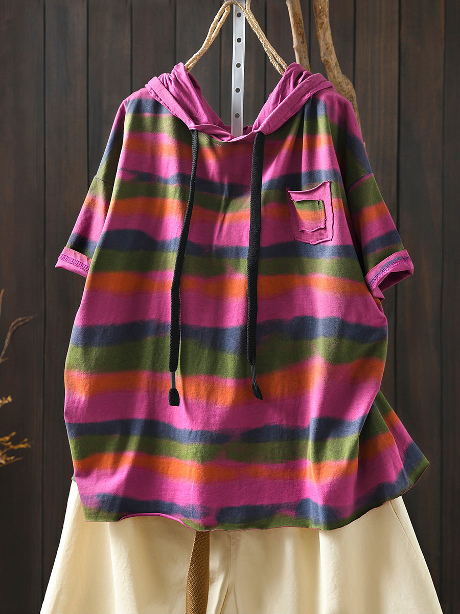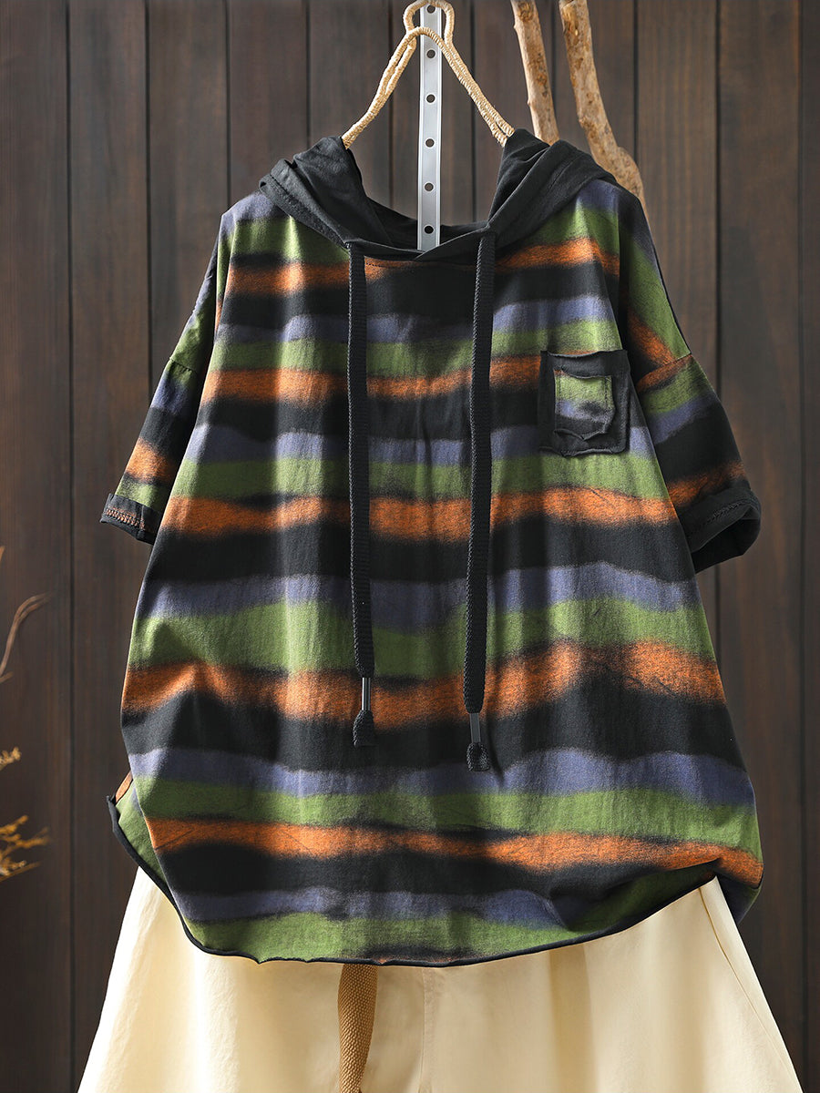 Sudadera con capucha de algodón a rayas artísticas para mujer, ideal para el verano.