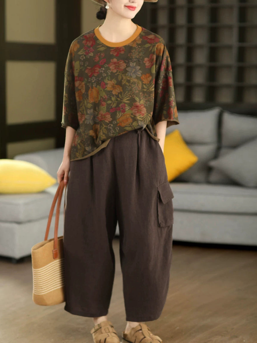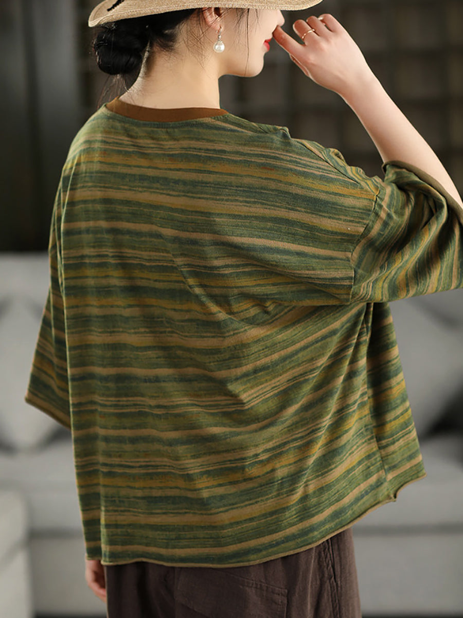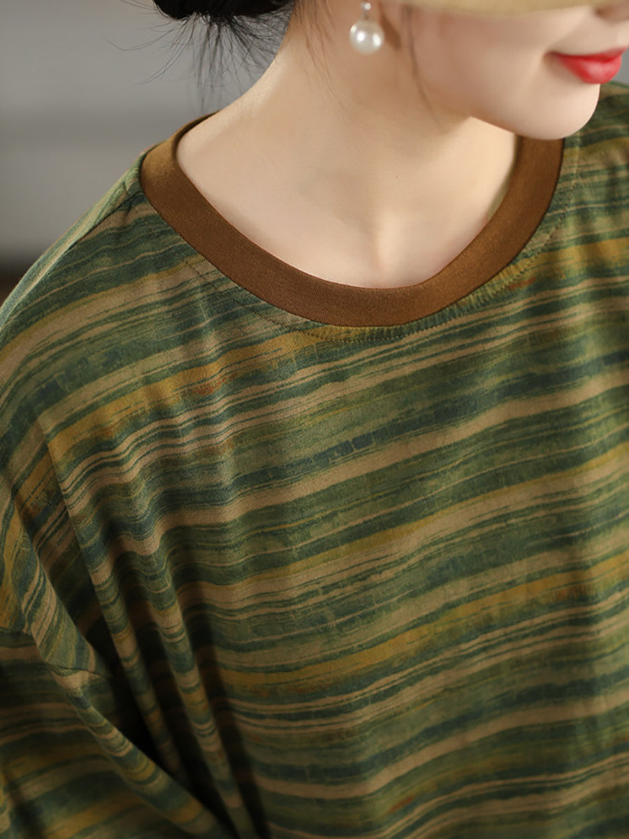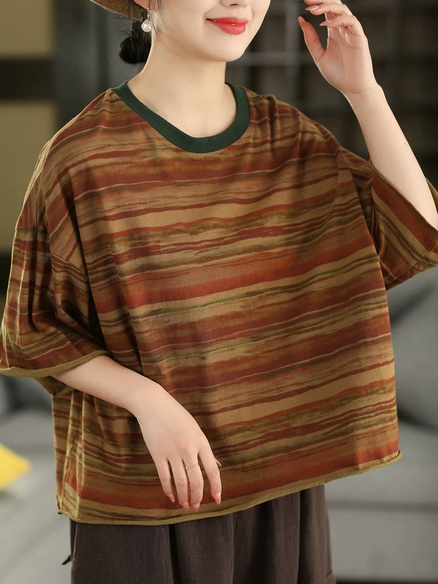 Camiseta de mujer de verano con cuello redondo y rayas estilo artístico, 100% algodón.