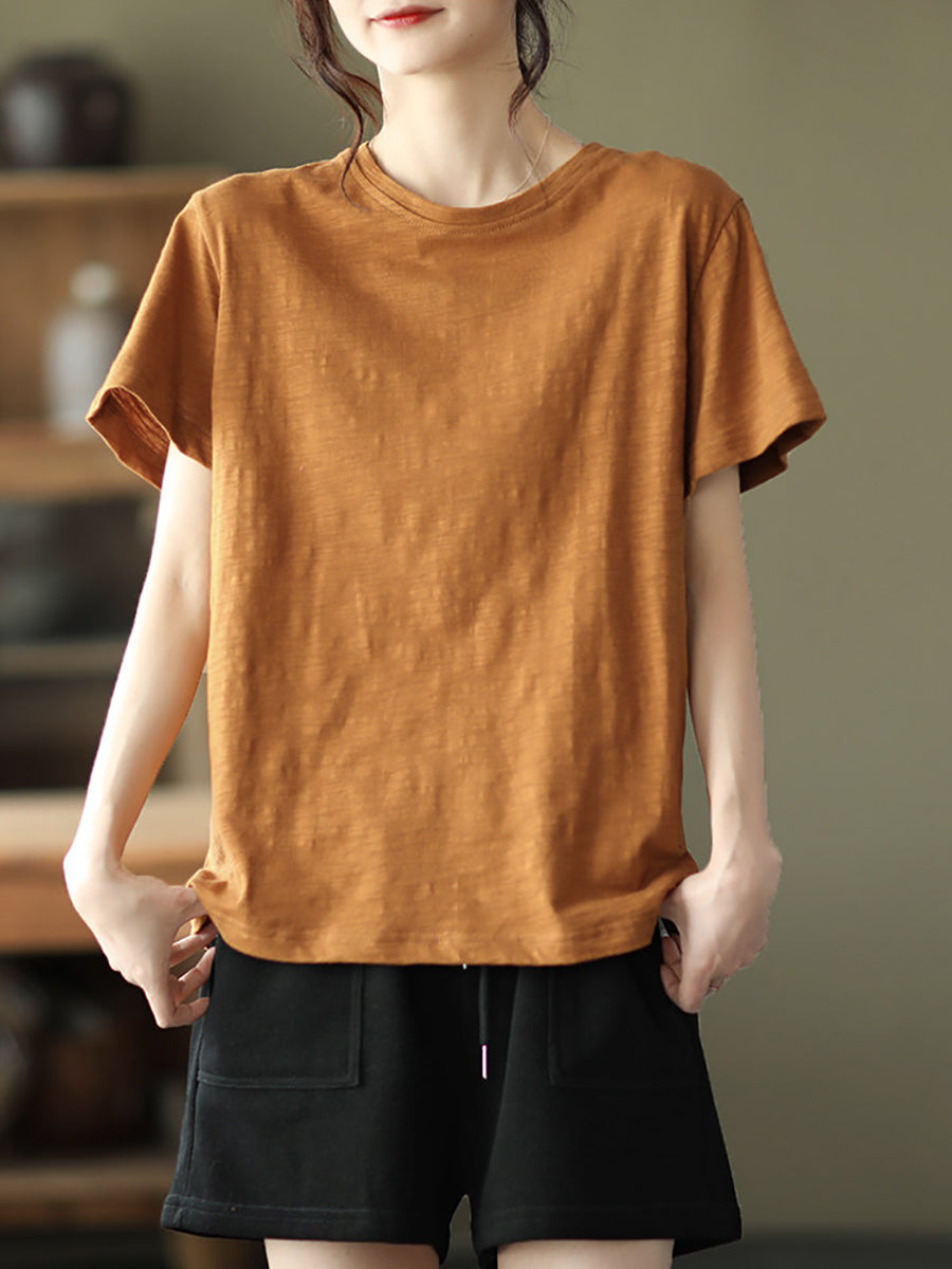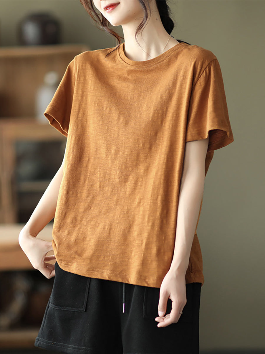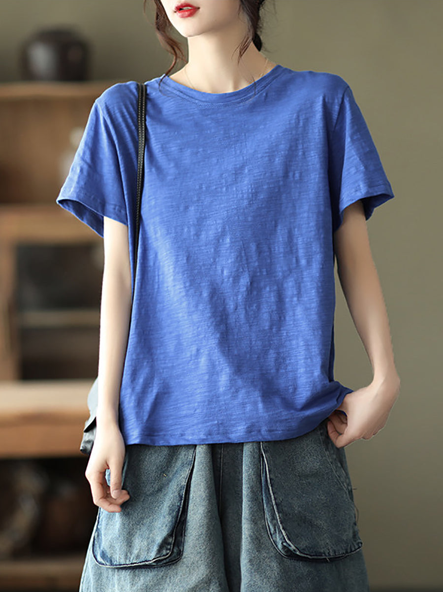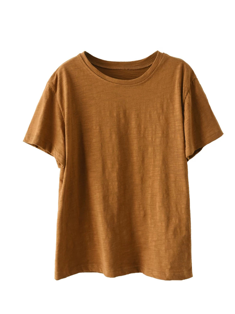 Camiseta de algodón de cuello redondo, color liso, estilo casual de verano para mujer
