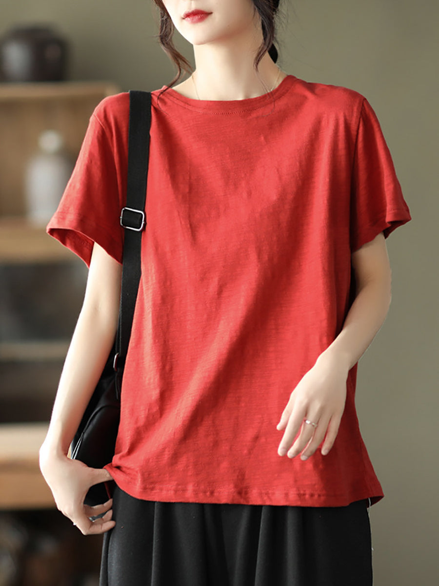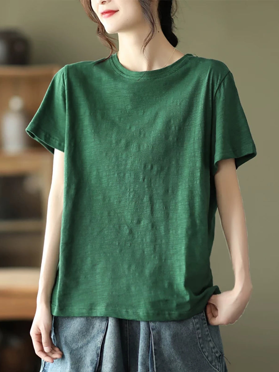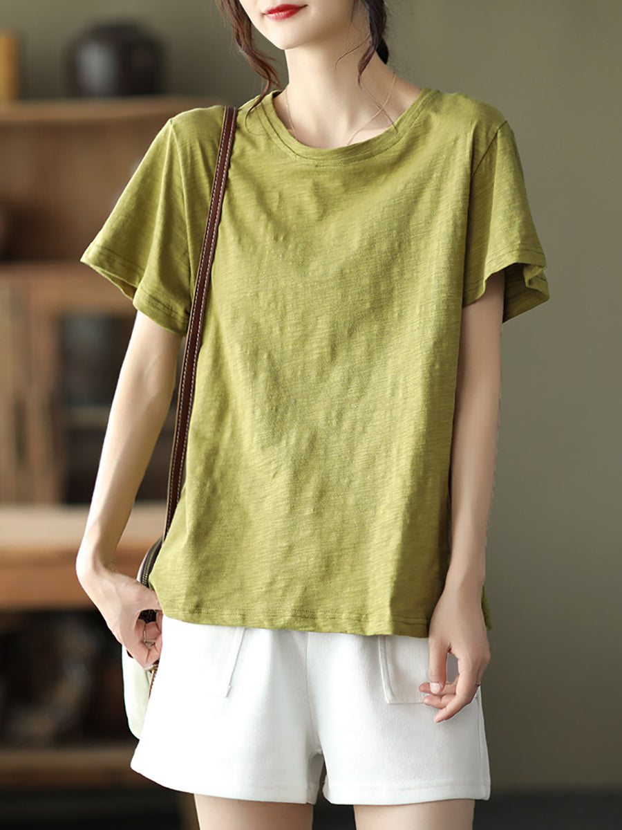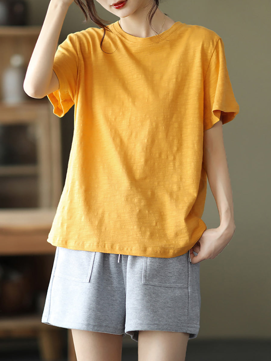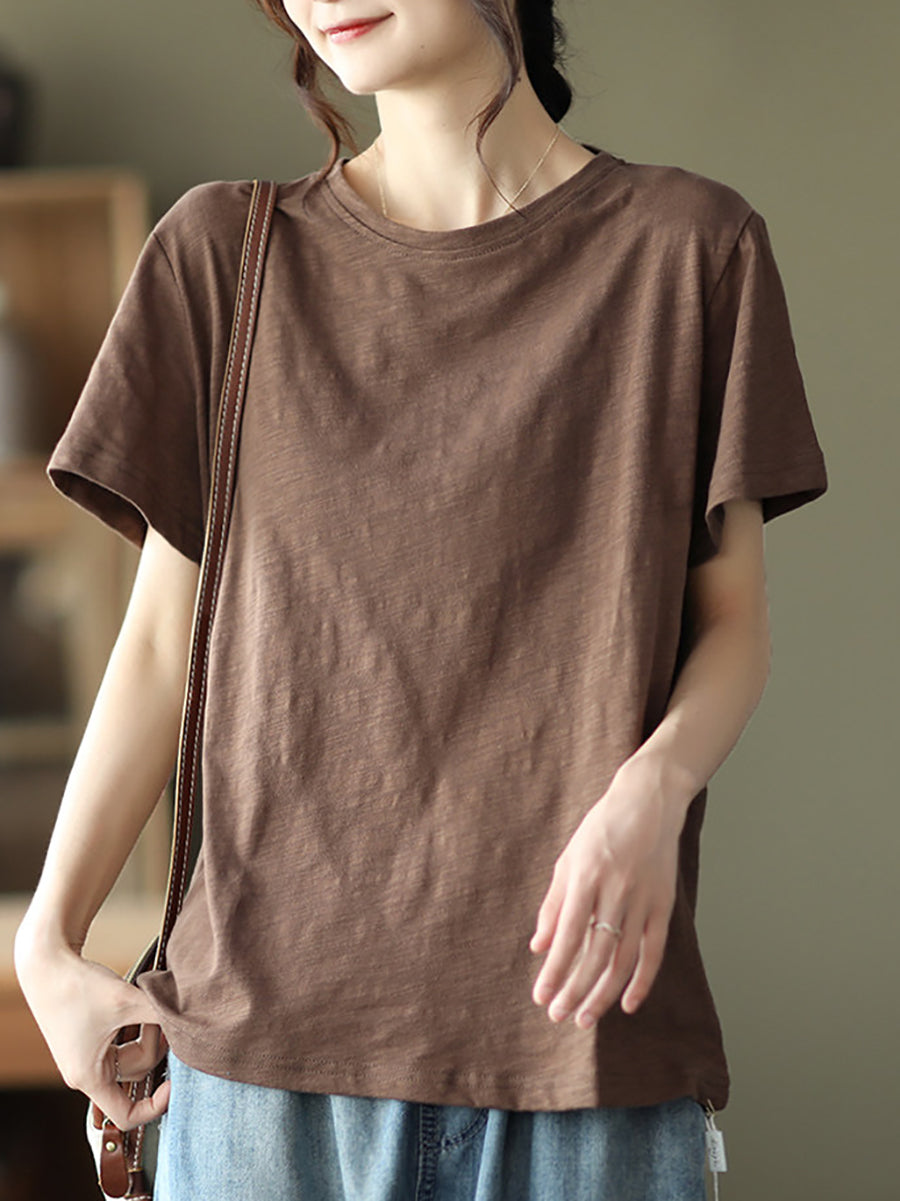 Camiseta de algodón de cuello redondo, color liso, estilo casual de verano para mujer