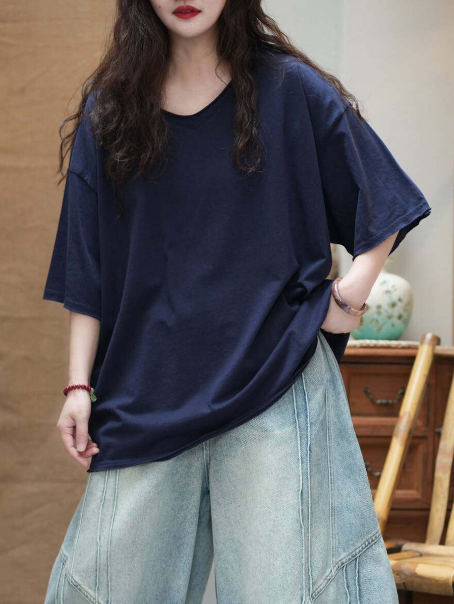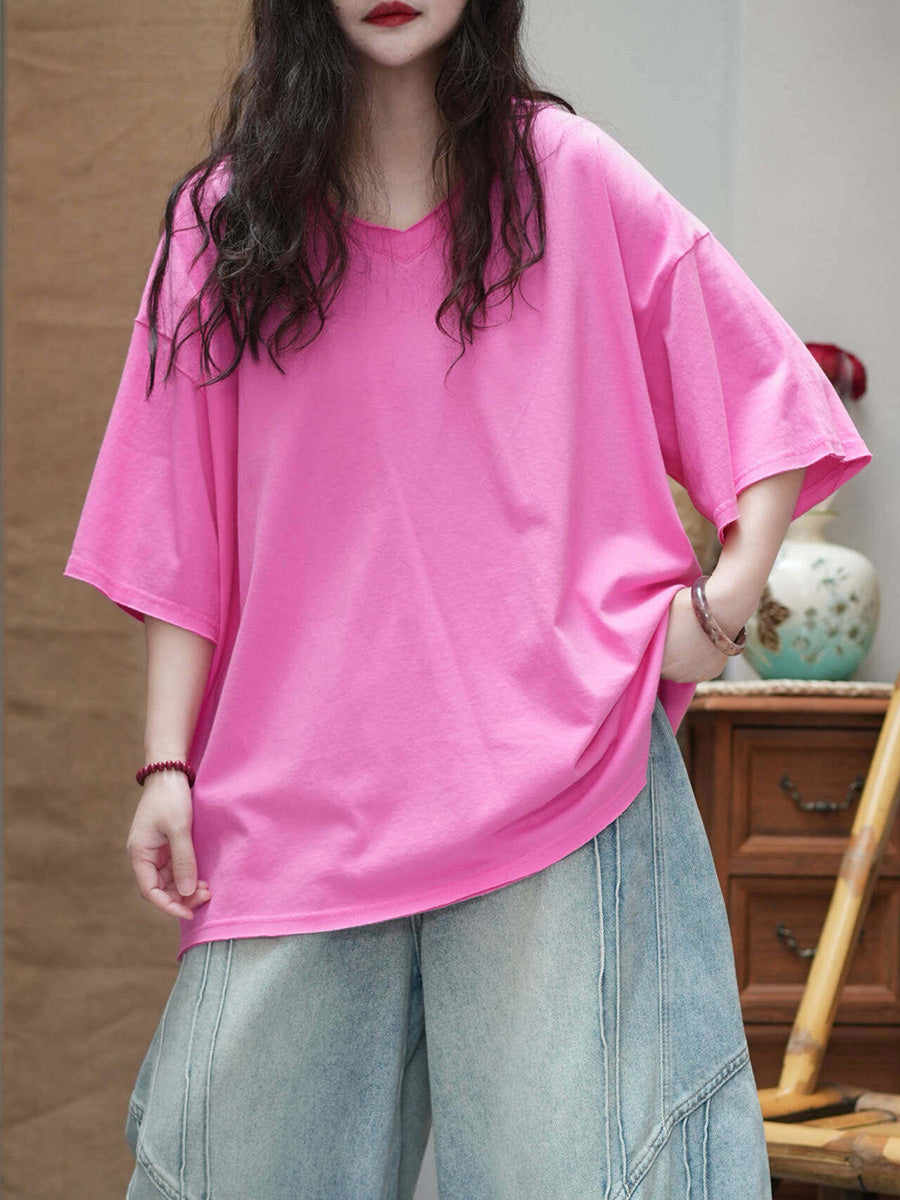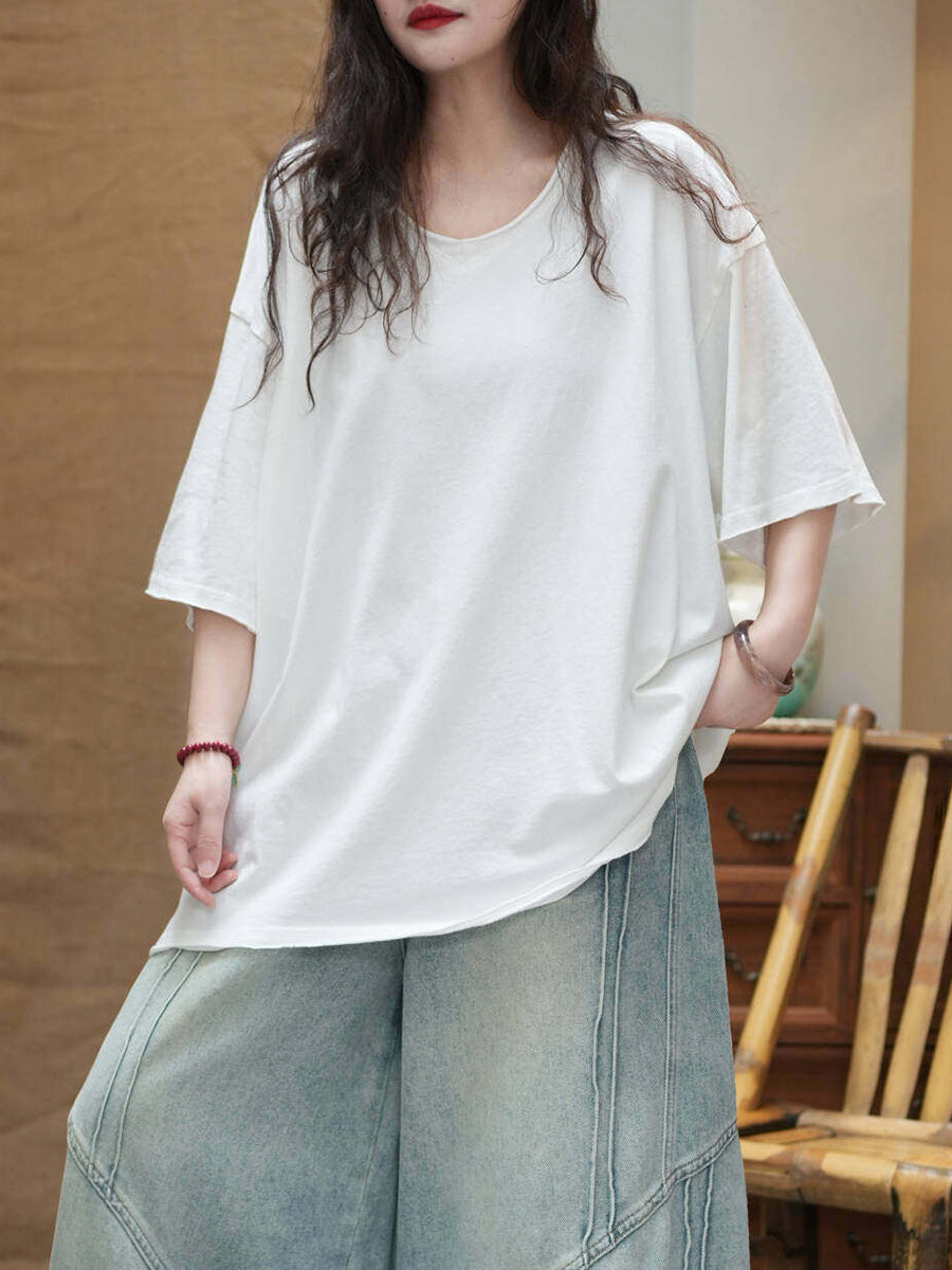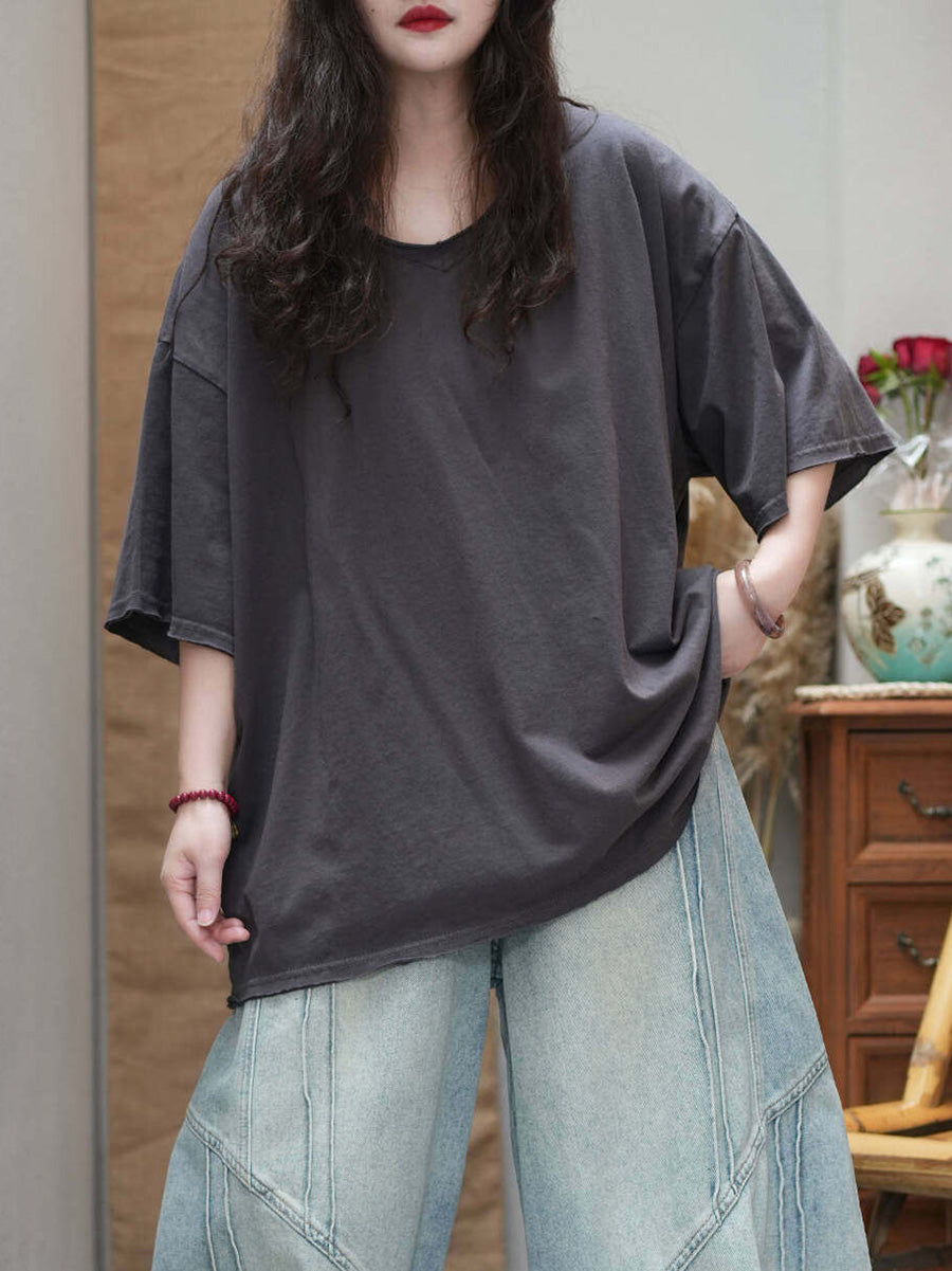 Camiseta de mujer informal de verano de color liso con cuello redondo