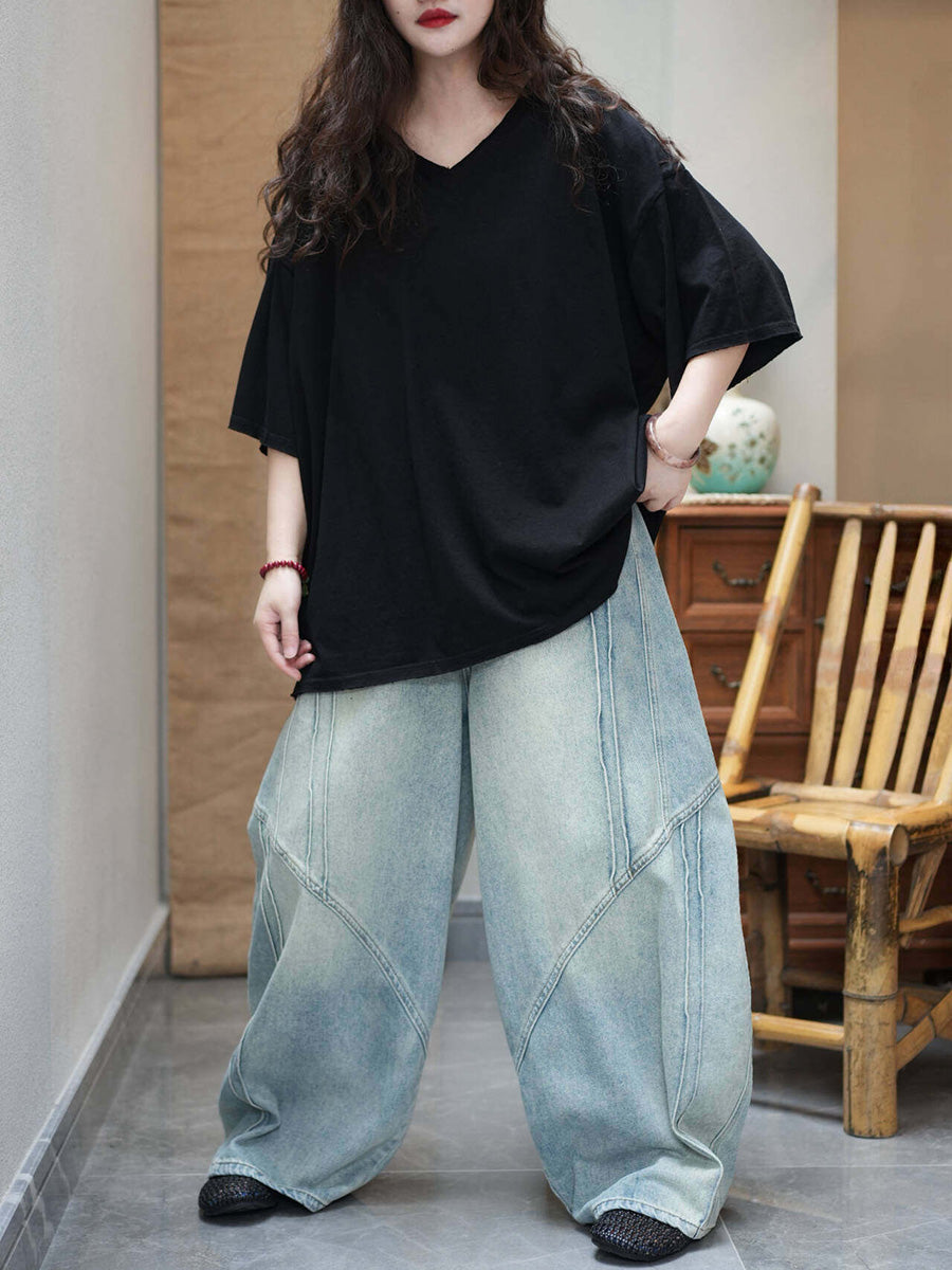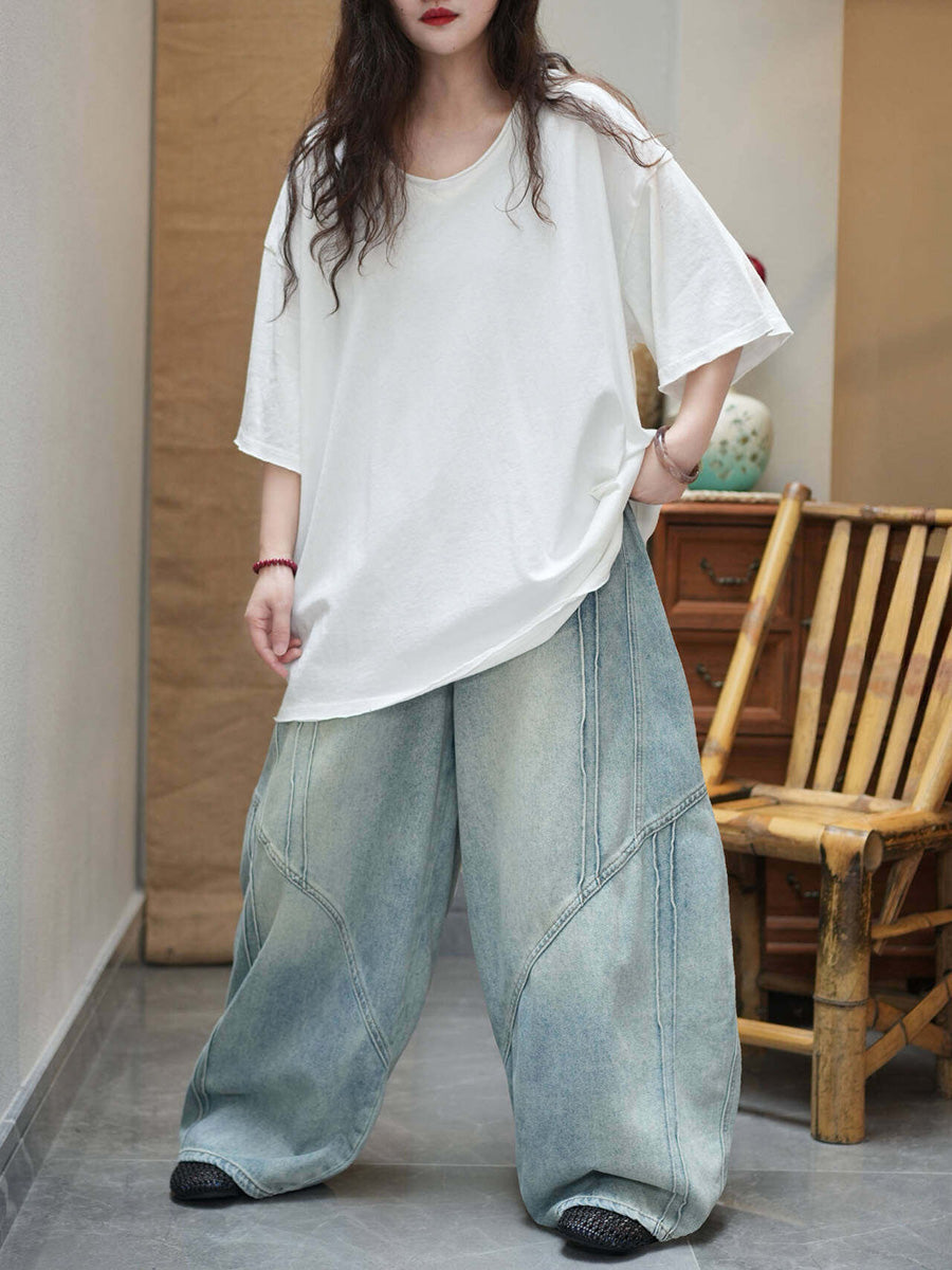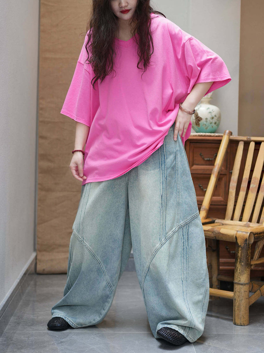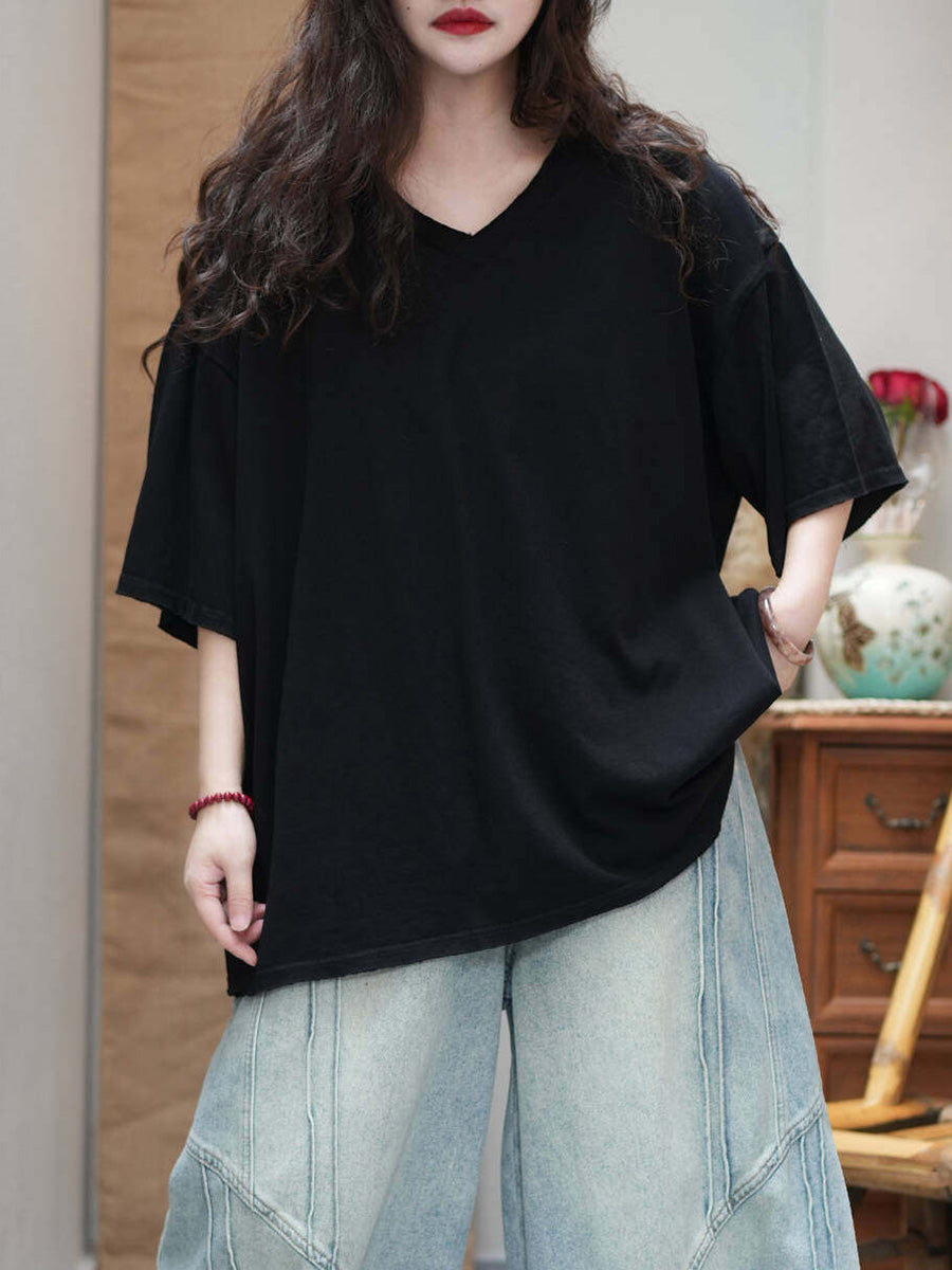 Camiseta de mujer informal de verano de color liso con cuello redondo