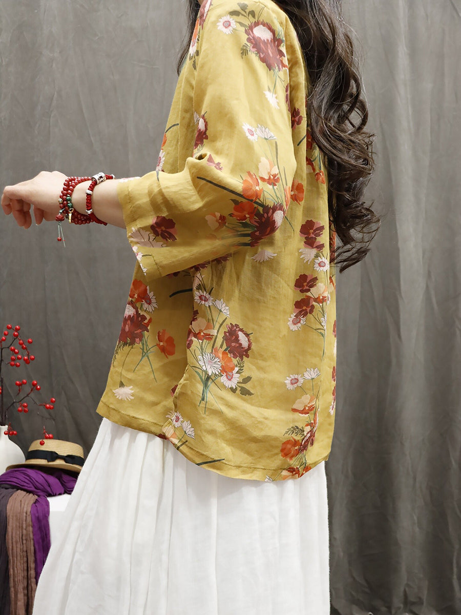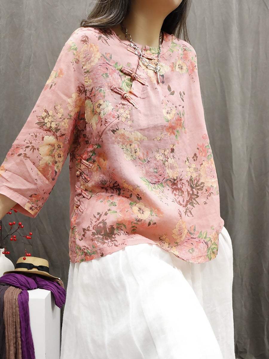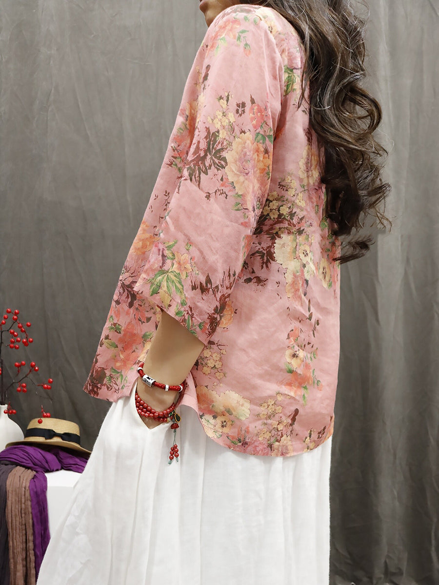 Blusa de verano para mujer, 100 % ramio, con flores étnicas