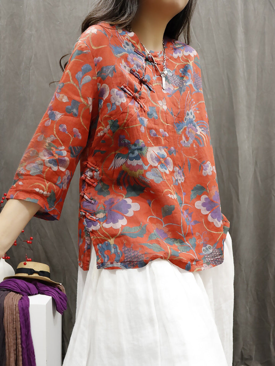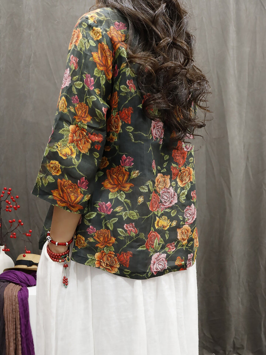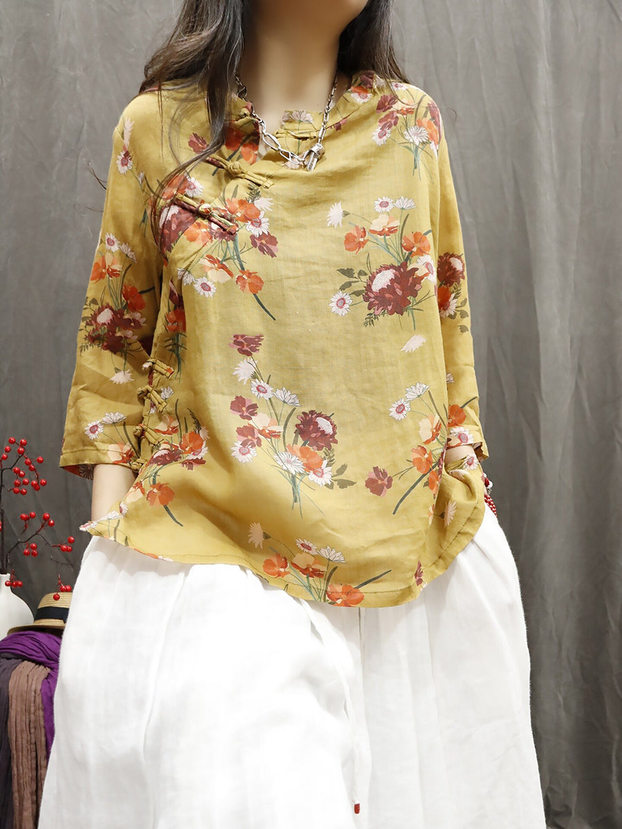 Blusa de verano para mujer, 100 % ramio, con flores étnicas