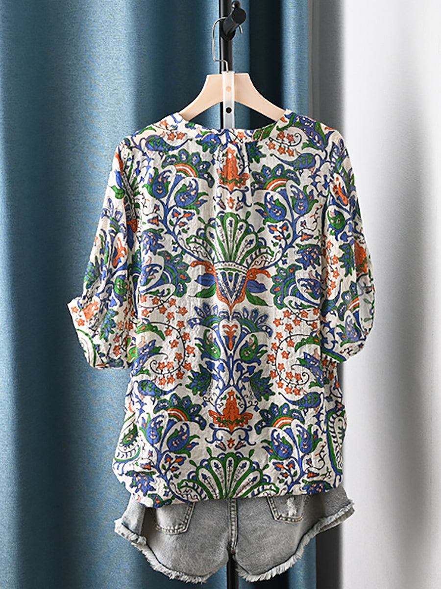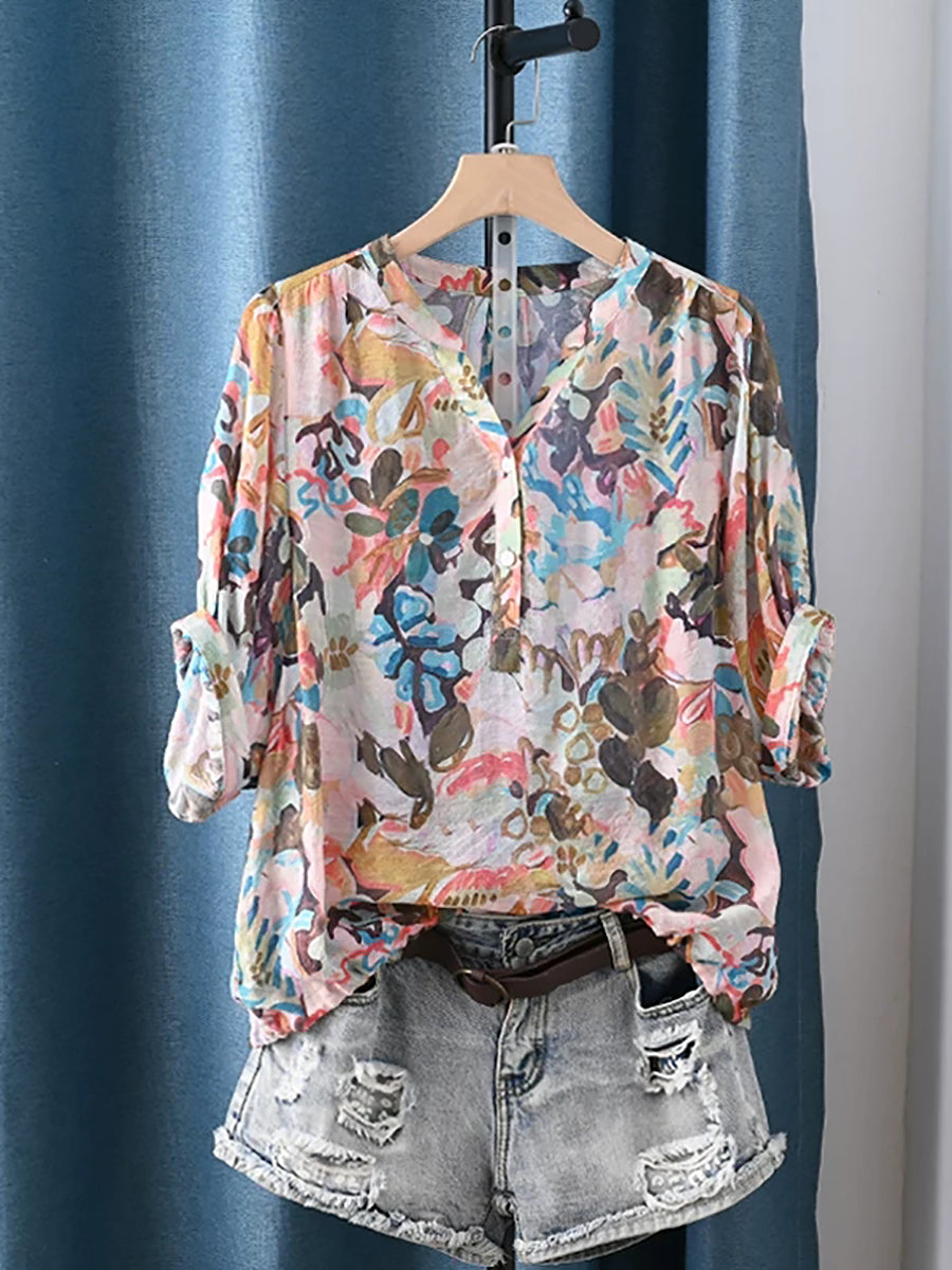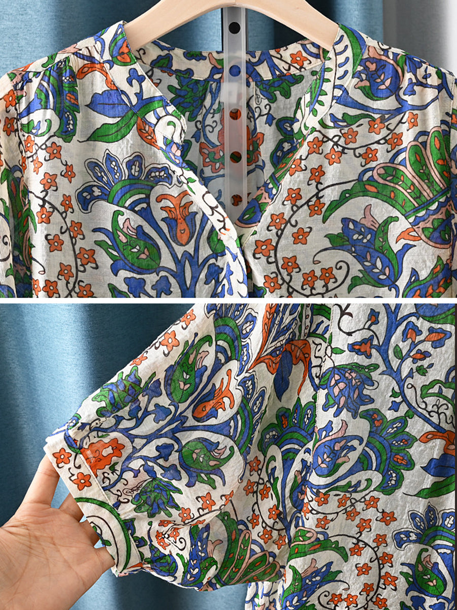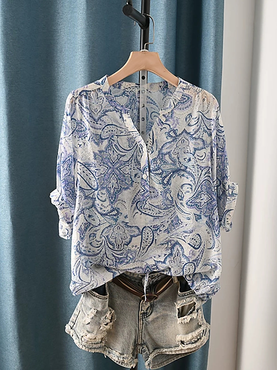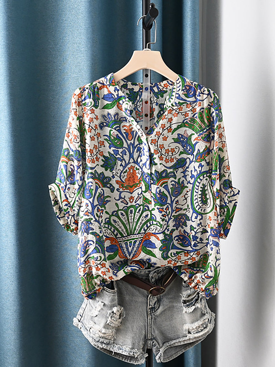 Blusa de verano étnica con estampado floral y escote en V para mujer.