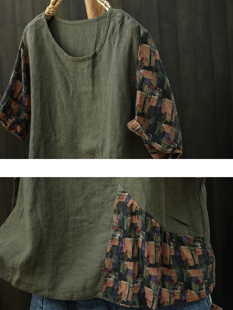 Camiseta de manga corta de lino con diseño de patchwork para mujer, ideal para el verano.