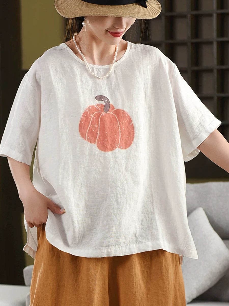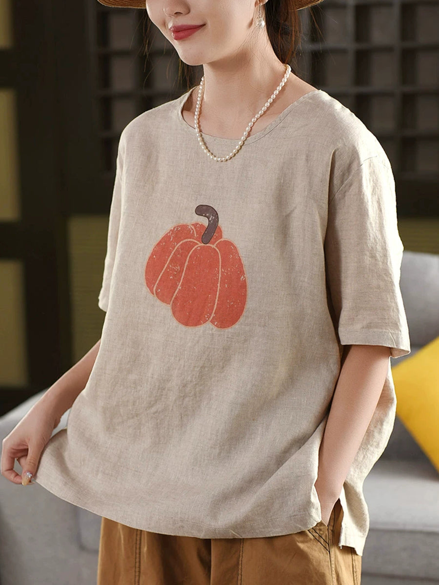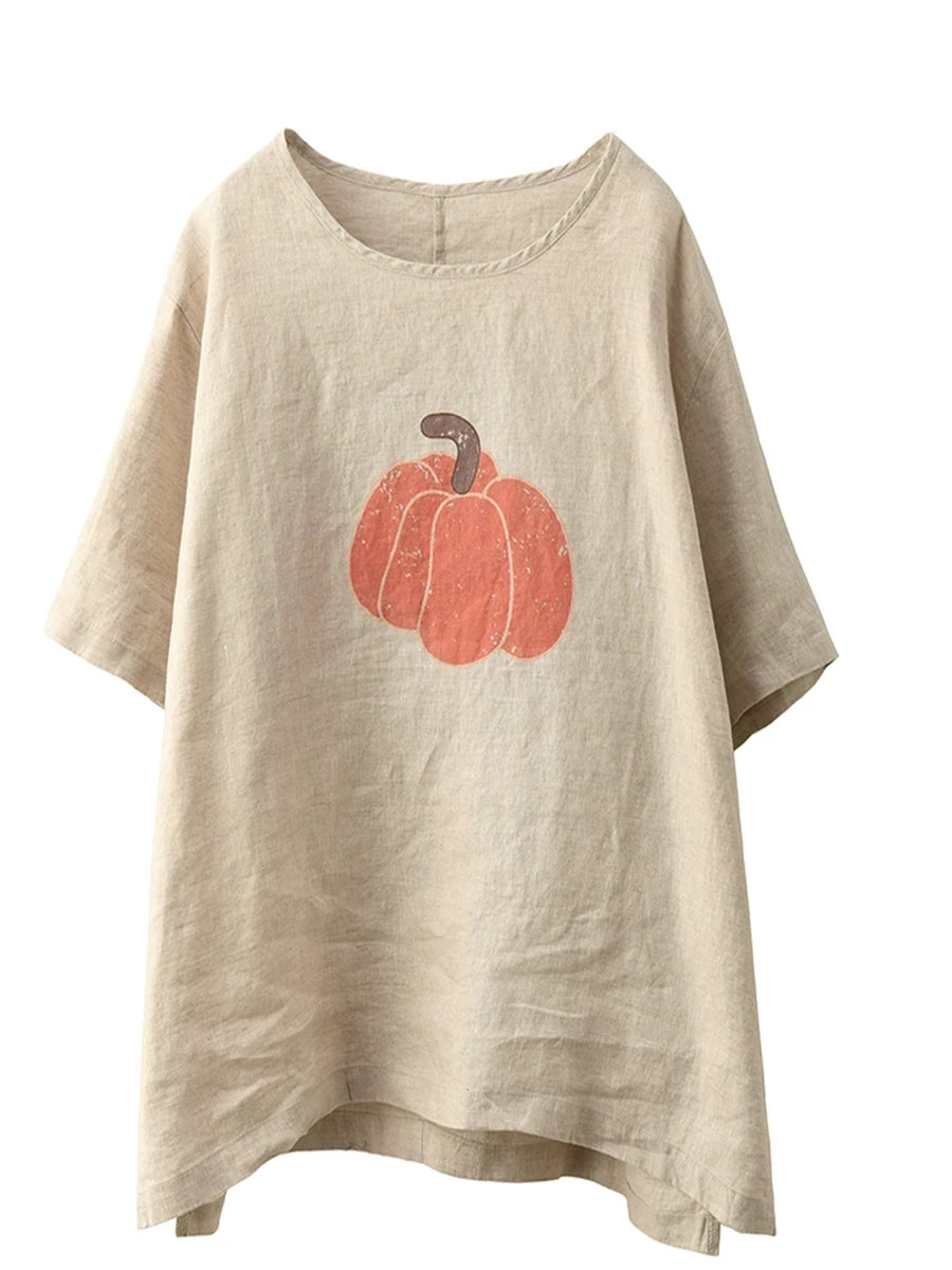 Blusa de verano para mujer, 100 % lino, cuello redondo y estampado de calabaza