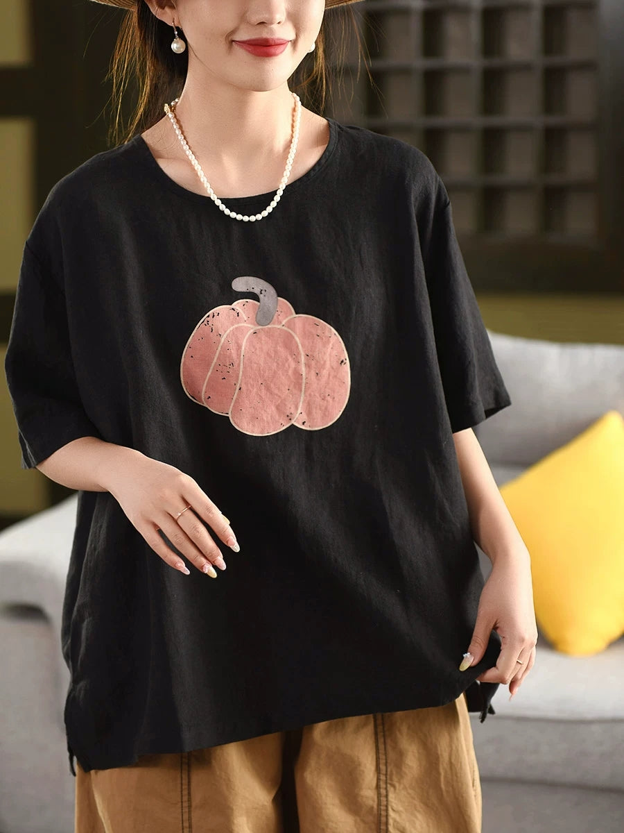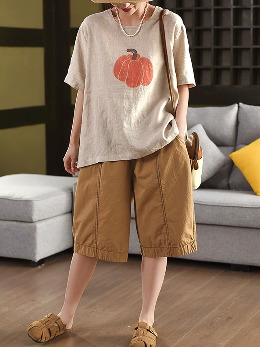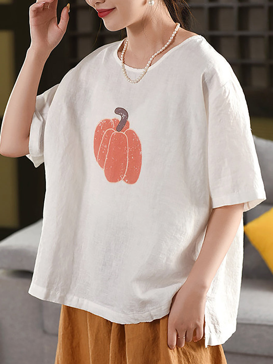 Blusa de verano para mujer, 100 % lino, cuello redondo y estampado de calabaza