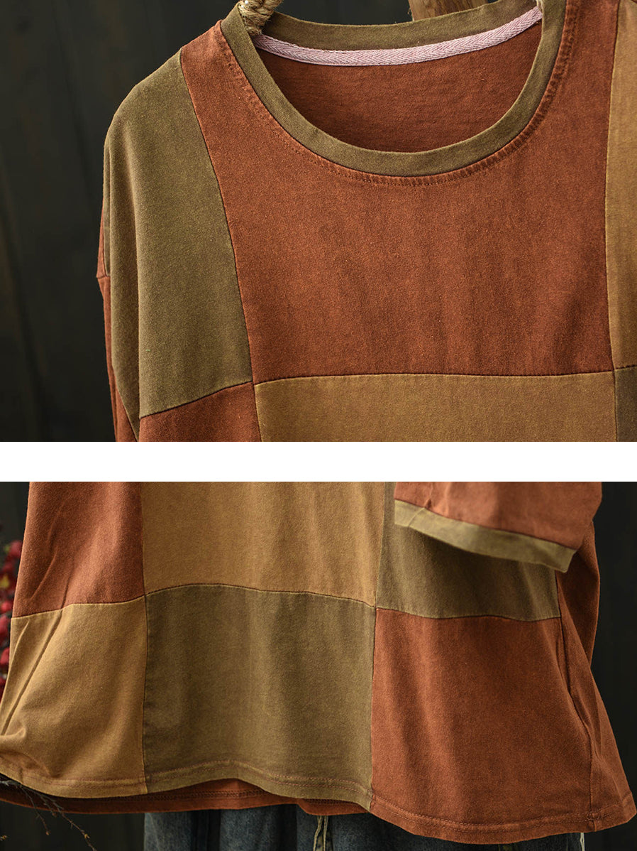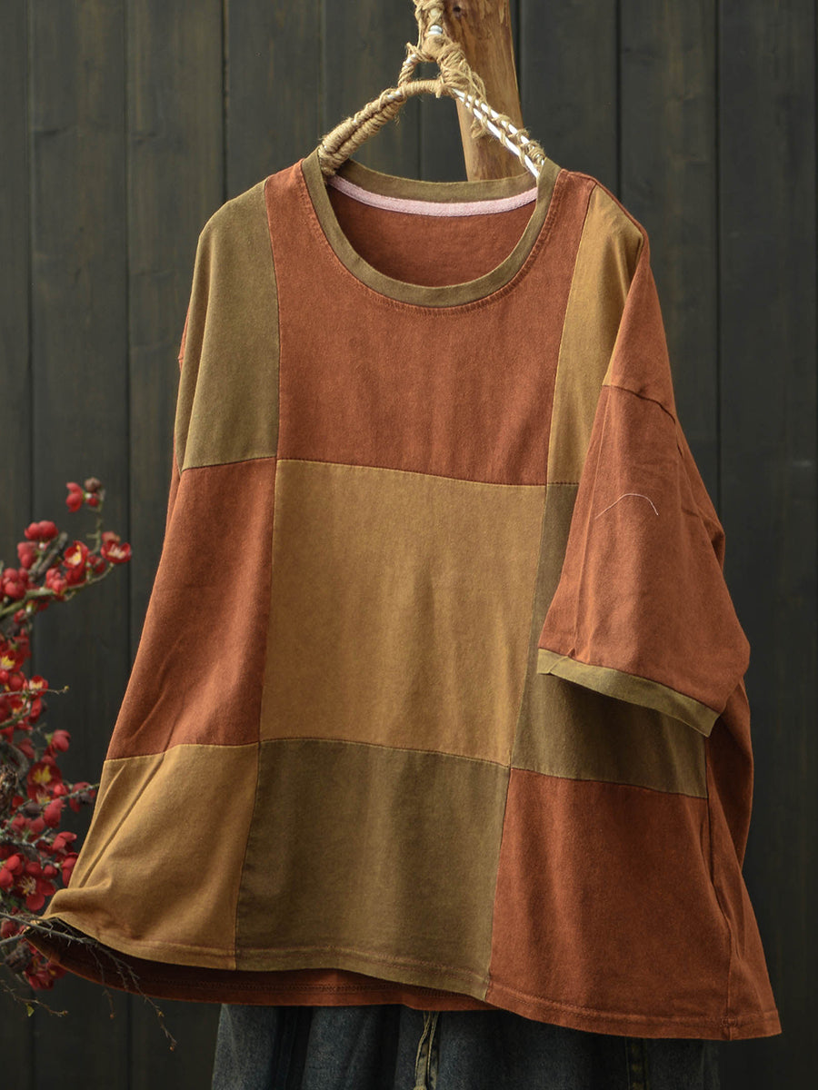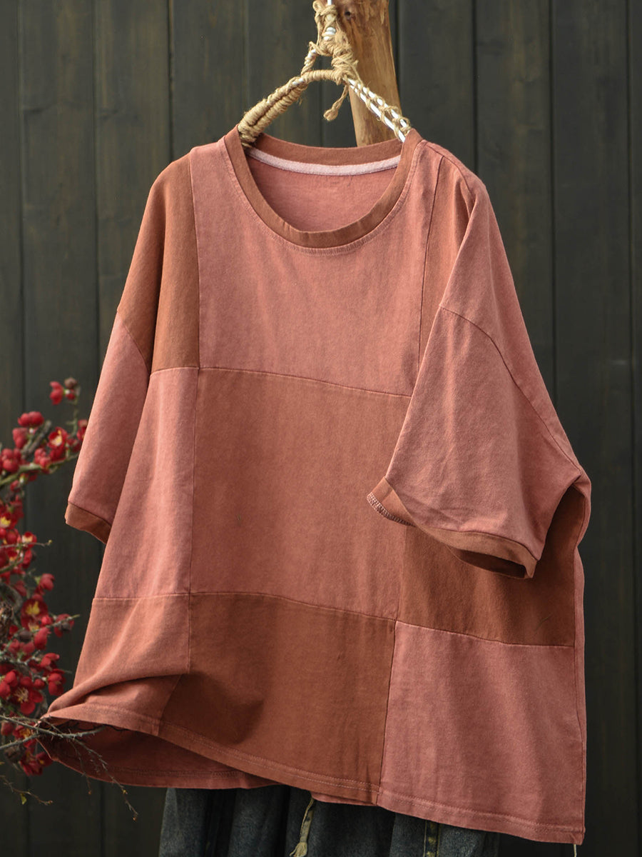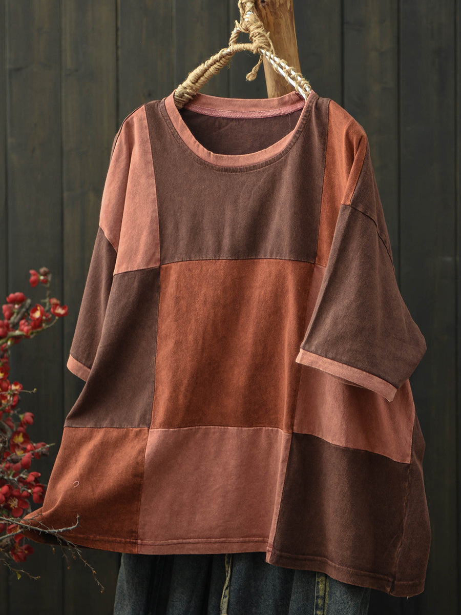 Camiseta de verano retro de verano con cuello redondo y patchwork para mujer