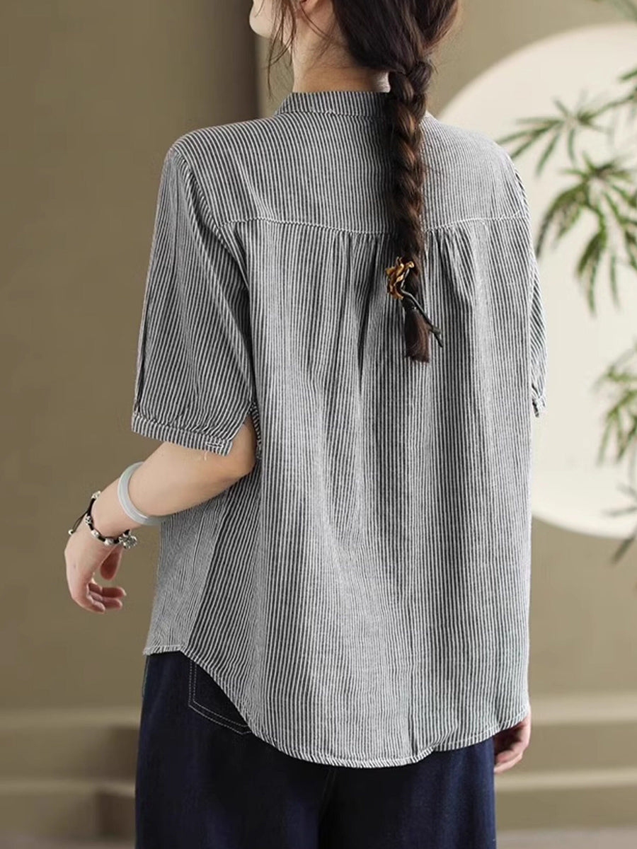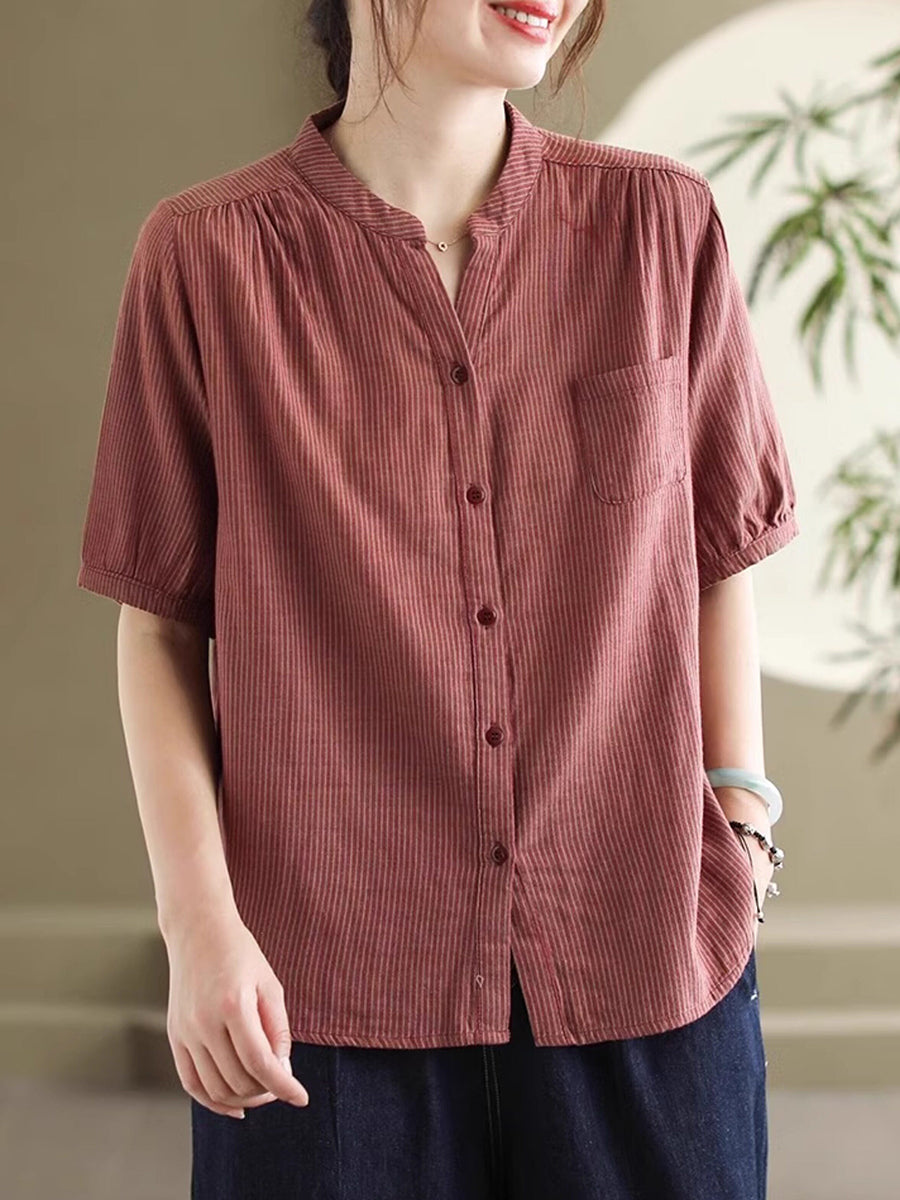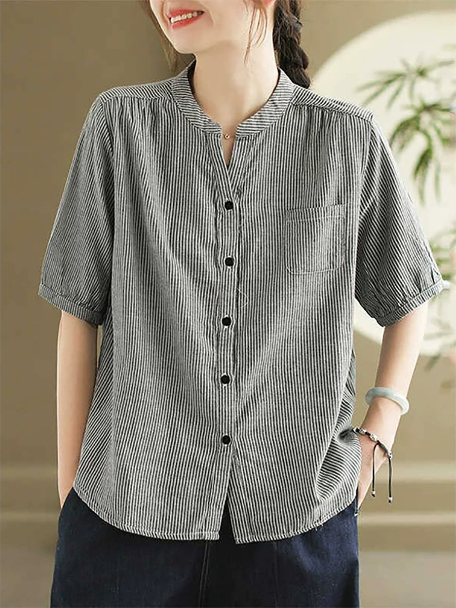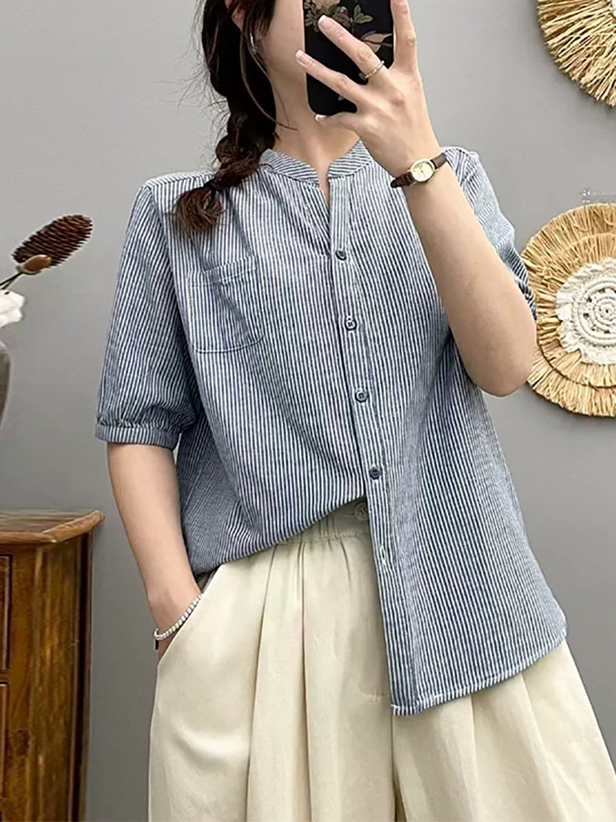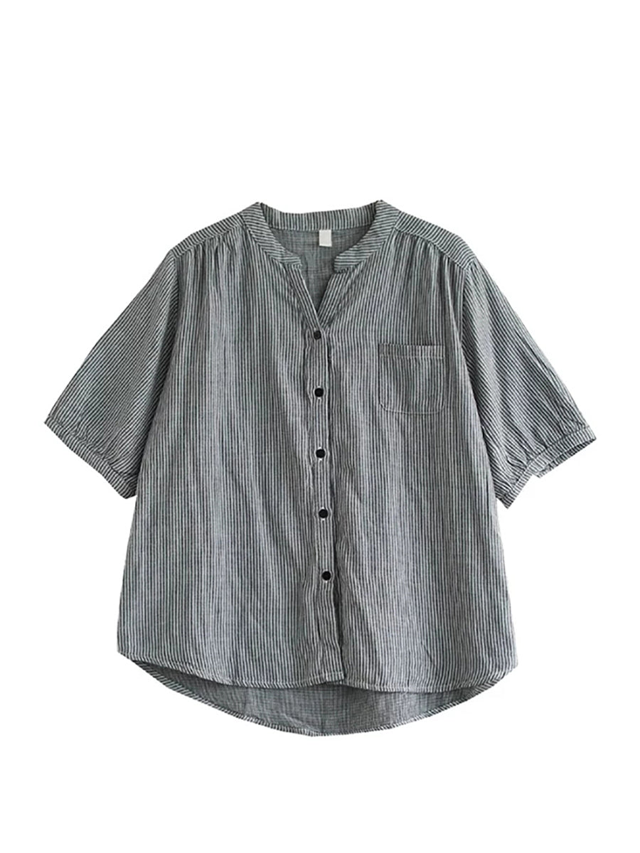 Blusa de mujer de verano estilo retro con cuello en V y rayas, 100% algodón.
